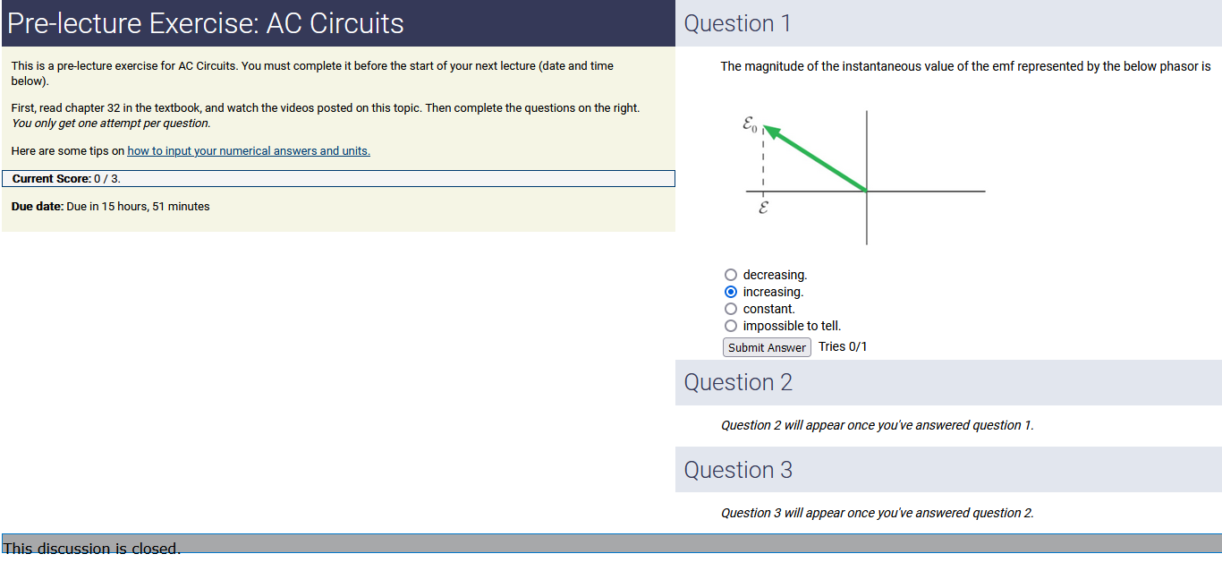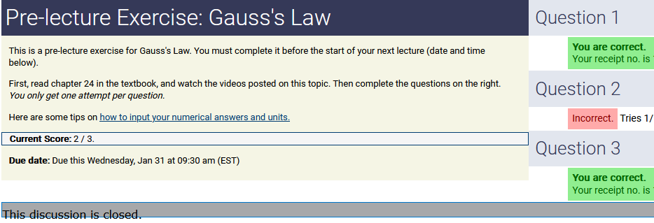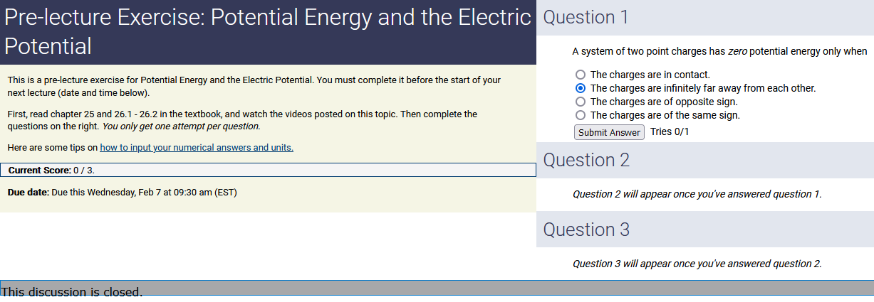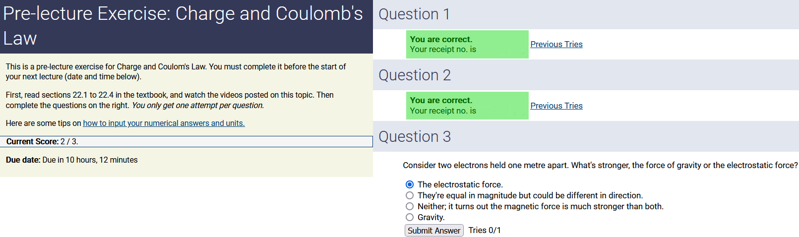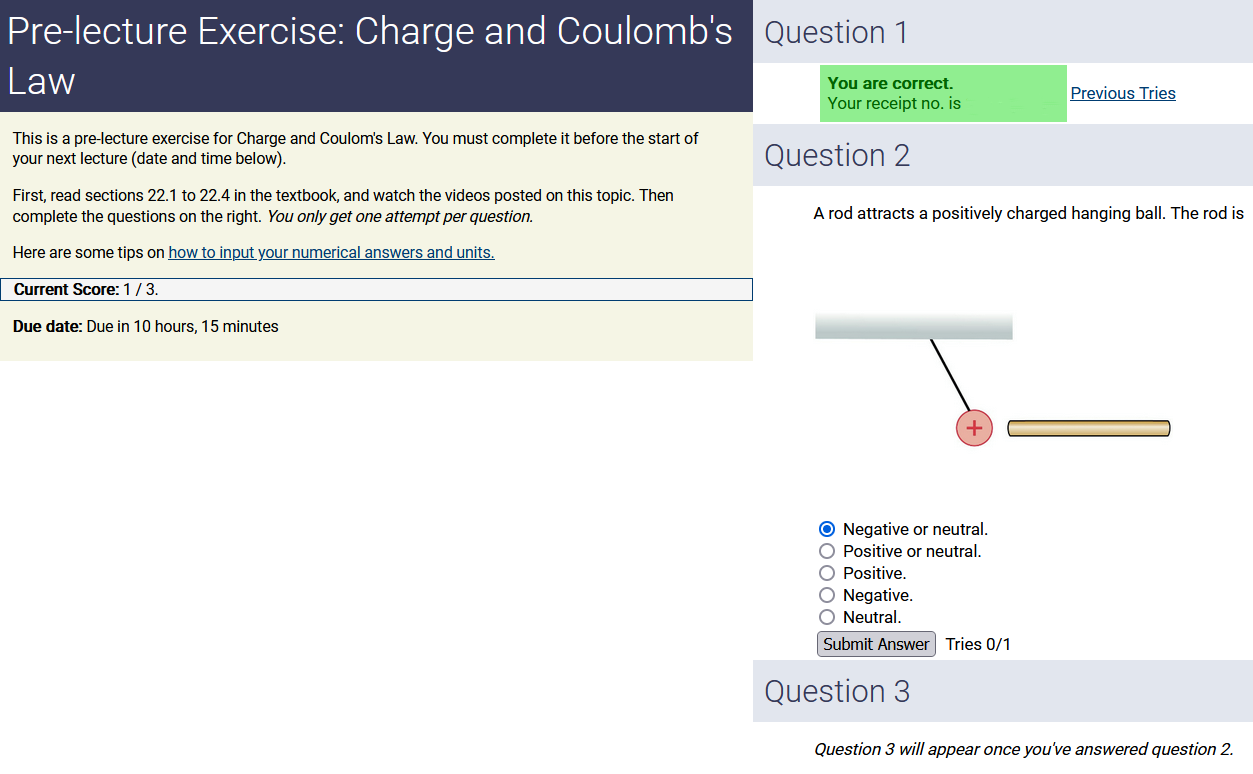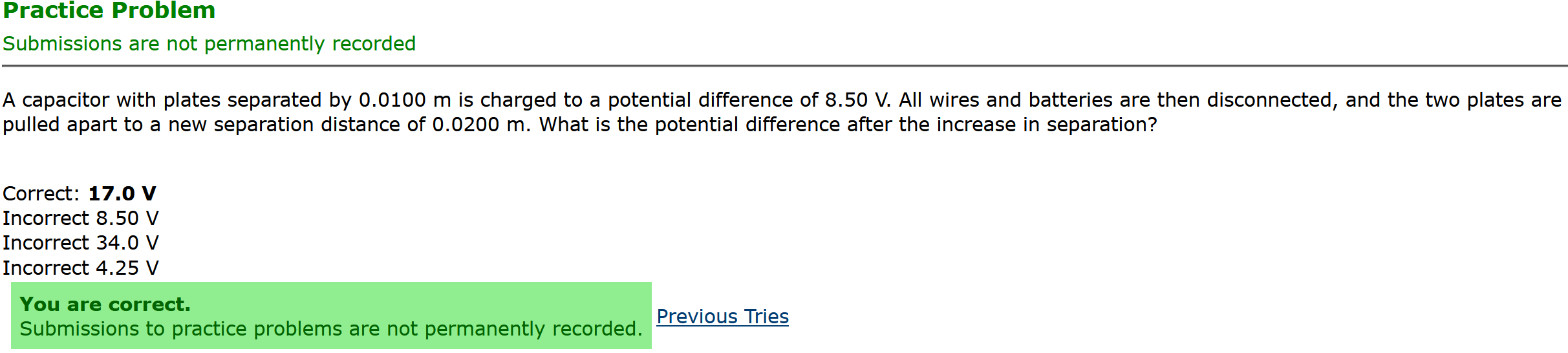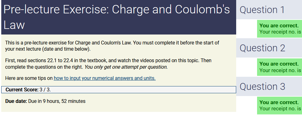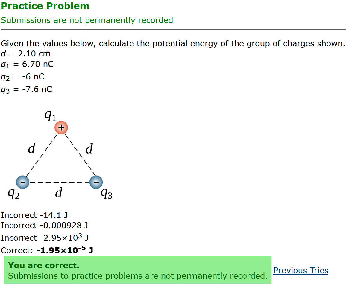 To make it clear how different questions can vary, I will labelling them based on the 2 ways they can change between attempts: 'Lim-Var' denotes questions with a limited number of variations (for example, if a formula has, say, 4 variables in it, and the question asks "what will happen to the answer if the variable __ is doubled in mangitude?", then this question will very likely have 4 'variations' total, which means this question can change the variable it's asking about in 4 different ways between attempts). 'Inf-Var' denotes questions with infinite variations (every single attempt of this question will have different numbers to go with it, and the numbers may be barely or very different). Note that a question can be both of these types at the same time. Also note that not every variation of a Lim-Var question will be available.