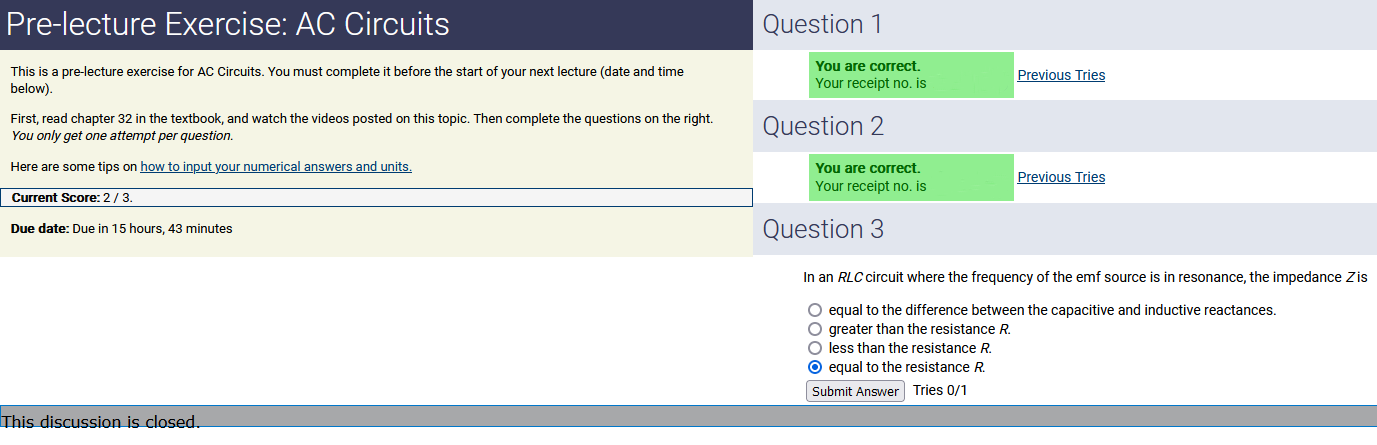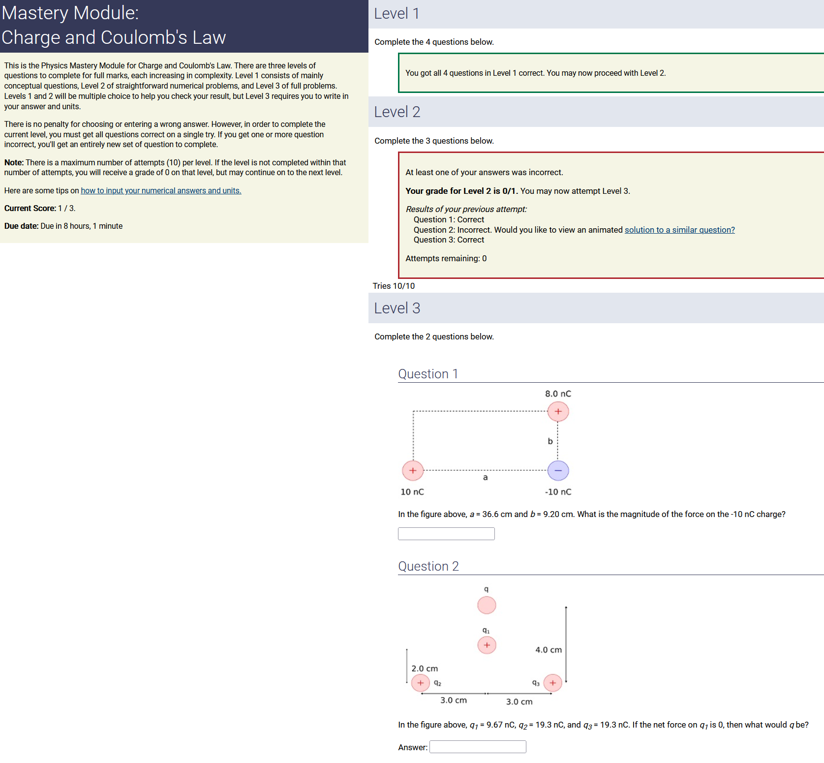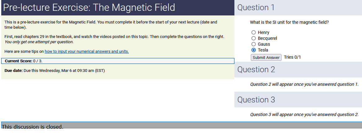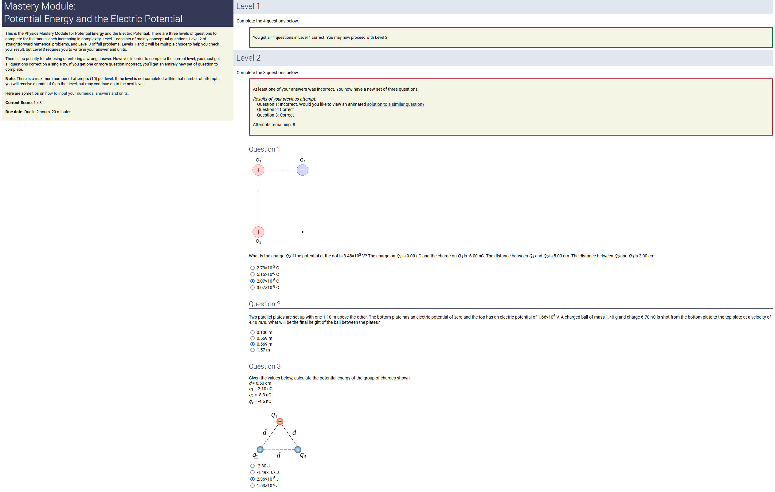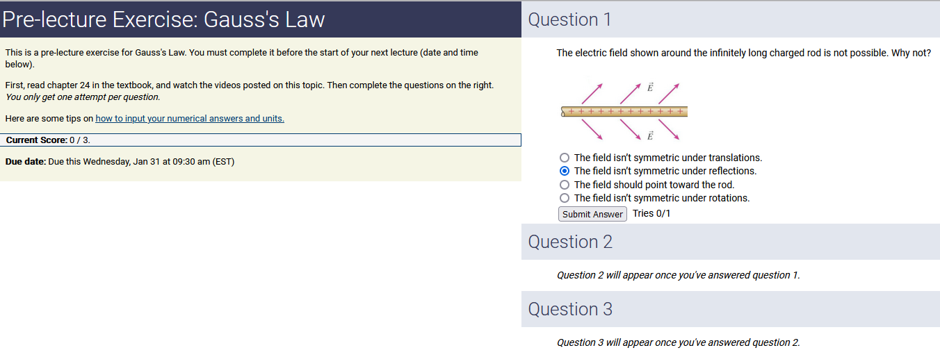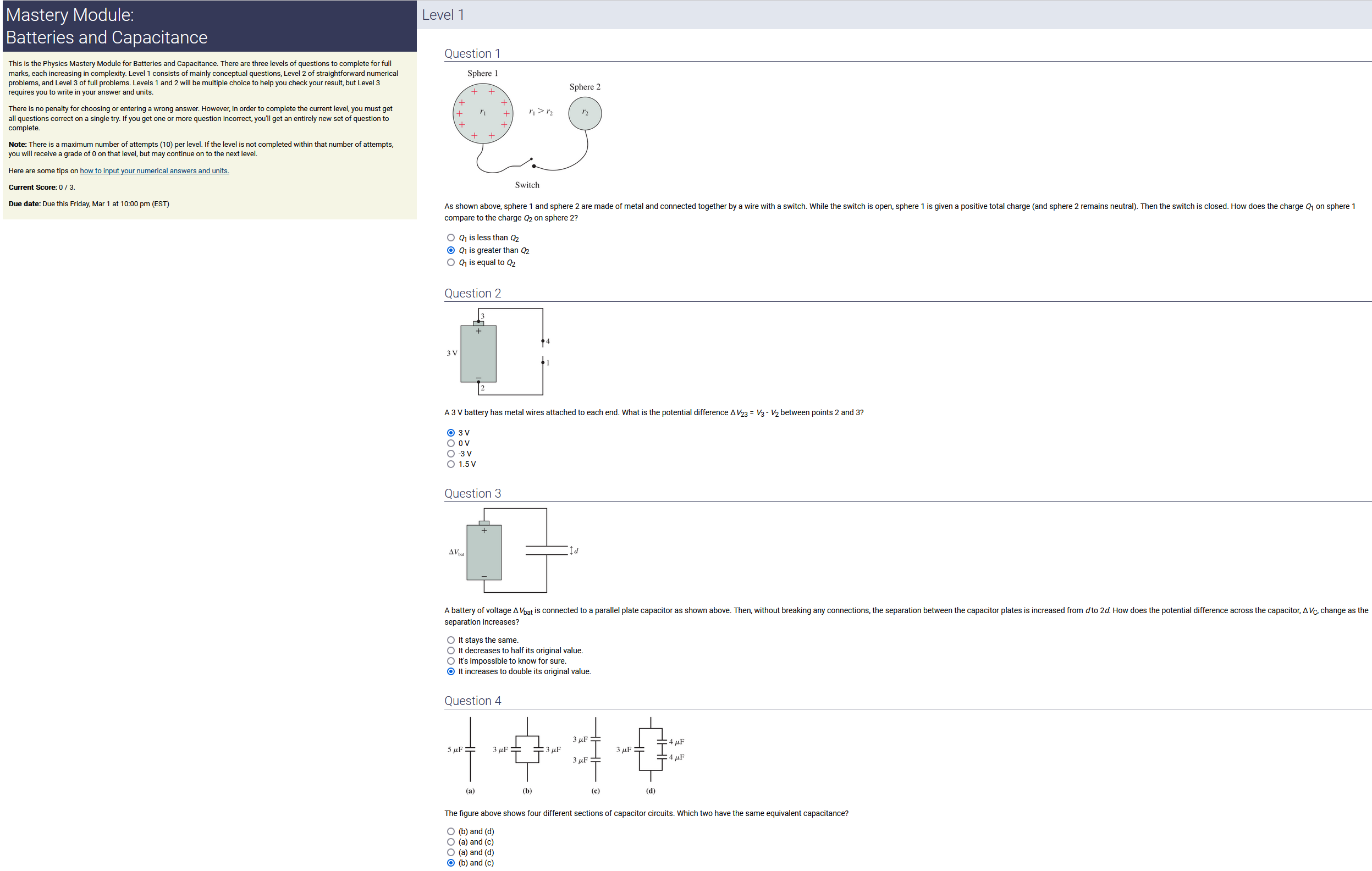 To make it clear how different questions can vary, I will labelling them based on the 2 ways they can change between attempts: 'Lim-Var' denotes questions with a limited number of variations (for example, if a formula has, say, 4 variables in it, and the question asks "what will happen to the answer if the variable __ is doubled in mangitude?", then this question will very likely have 4 'variations' total, which means this question can change the variable it's asking about in 4 different ways between attempts). 'Inf-Var' denotes questions with infinite variations (every single attempt of this question will have different numbers to go with it, and the numbers may be barely or very different). Note that a question can be both of these types at the same time. Also note that not every variation of a Lim-Var question will be available.