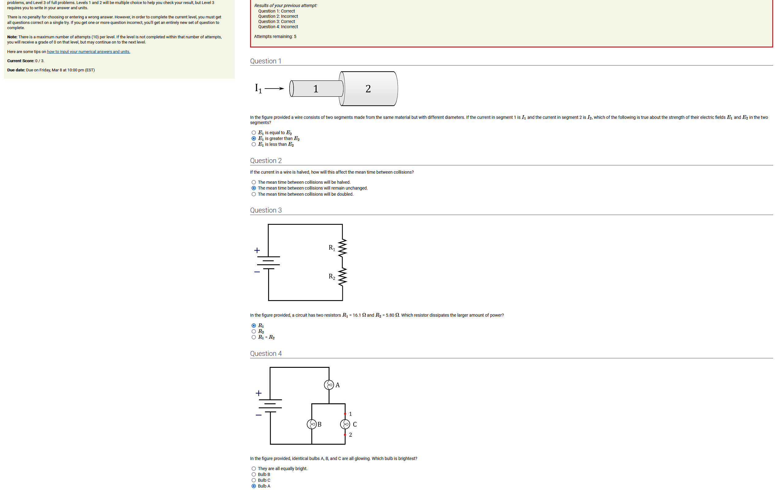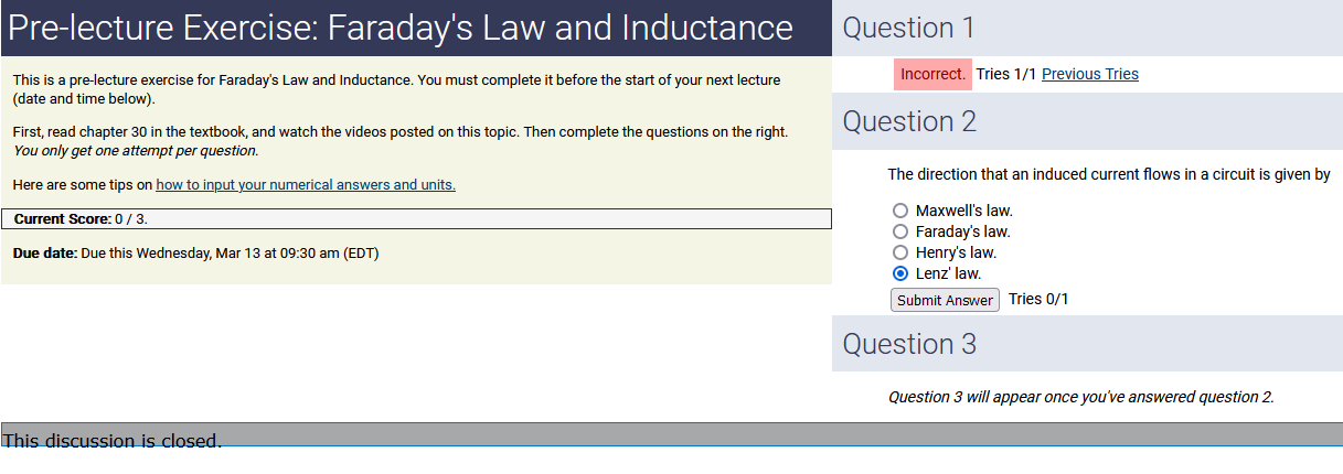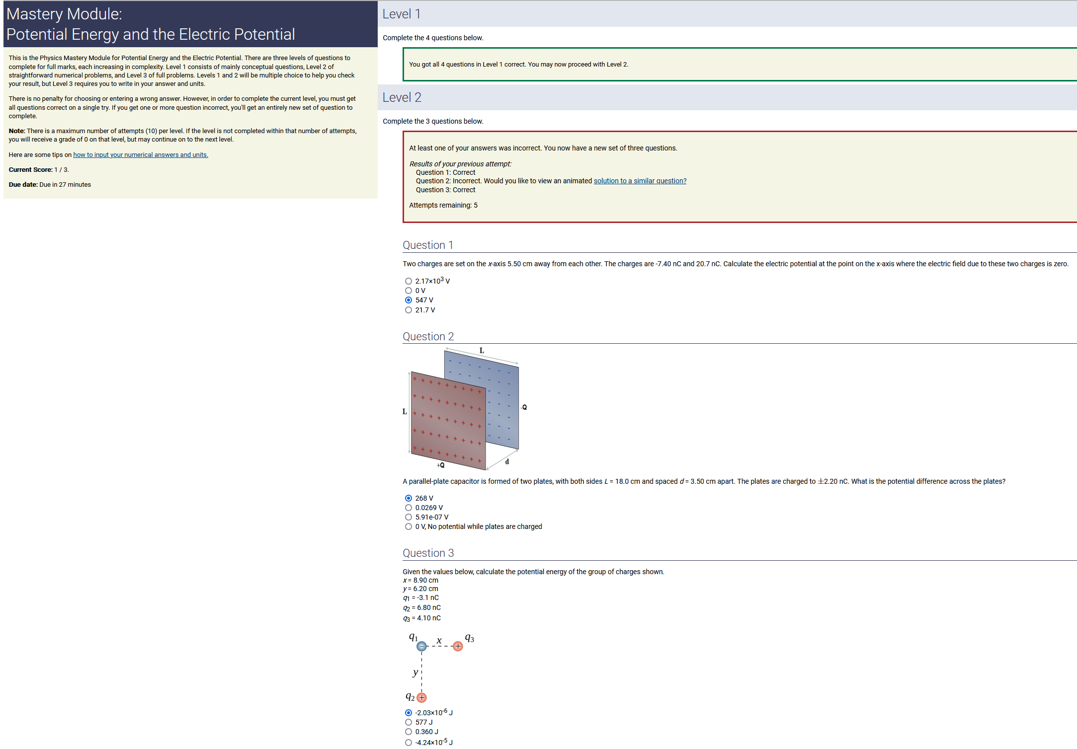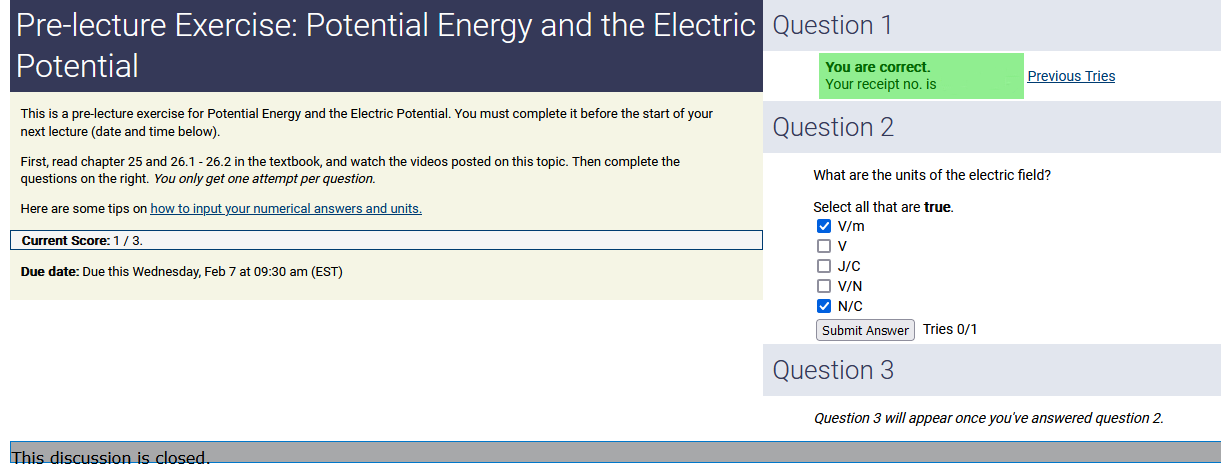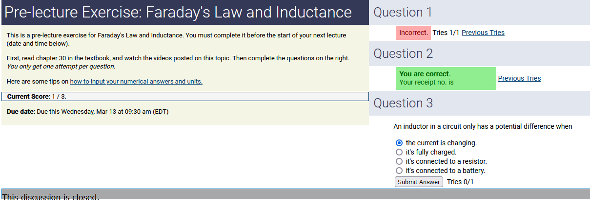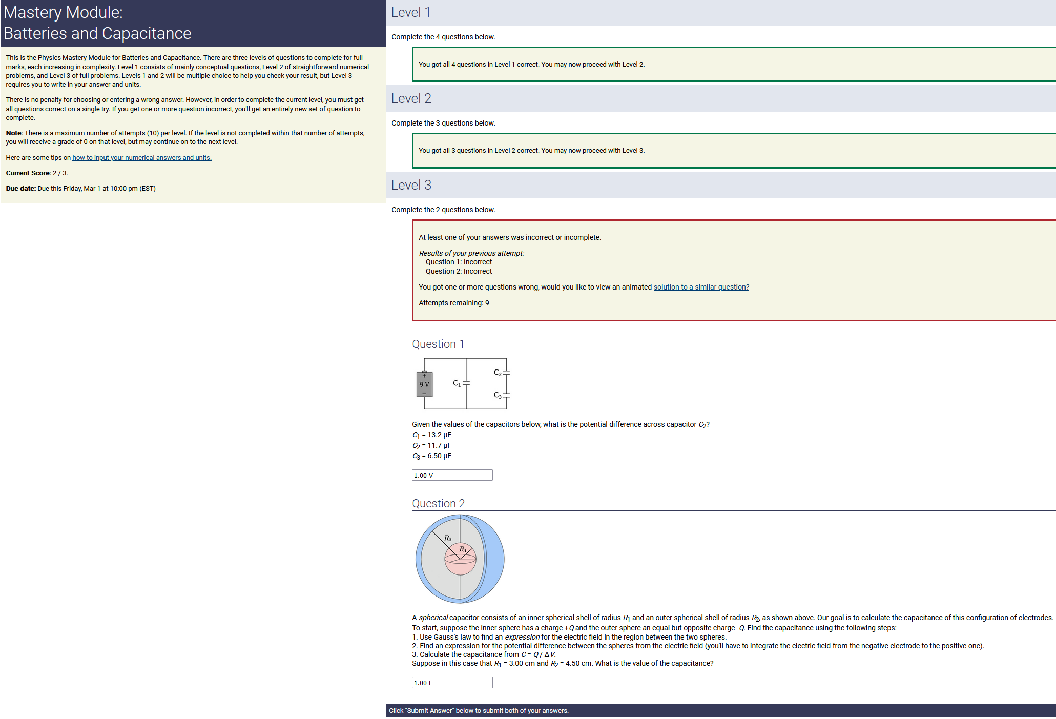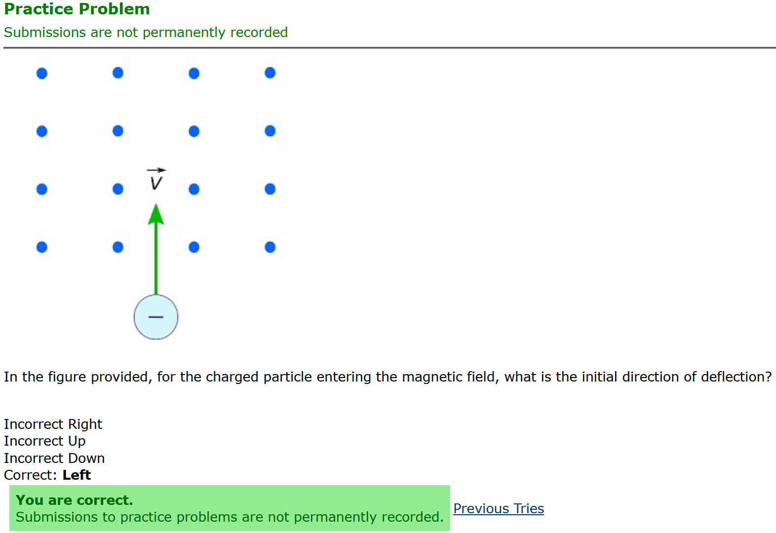 To make it clear how different questions can vary, I will labelling them based on the 2 ways they can change between attempts: 'Lim-Var' denotes questions with a limited number of variations (for example, if a formula has, say, 4 variables in it, and the question asks "what will happen to the answer if the variable __ is doubled in mangitude?", then this question will very likely have 4 'variations' total, which means this question can change the variable it's asking about in 4 different ways between attempts). 'Inf-Var' denotes questions with infinite variations (every single attempt of this question will have different numbers to go with it, and the numbers may be barely or very different). Note that a question can be both of these types at the same time. Also note that not every variation of a Lim-Var question will be available.