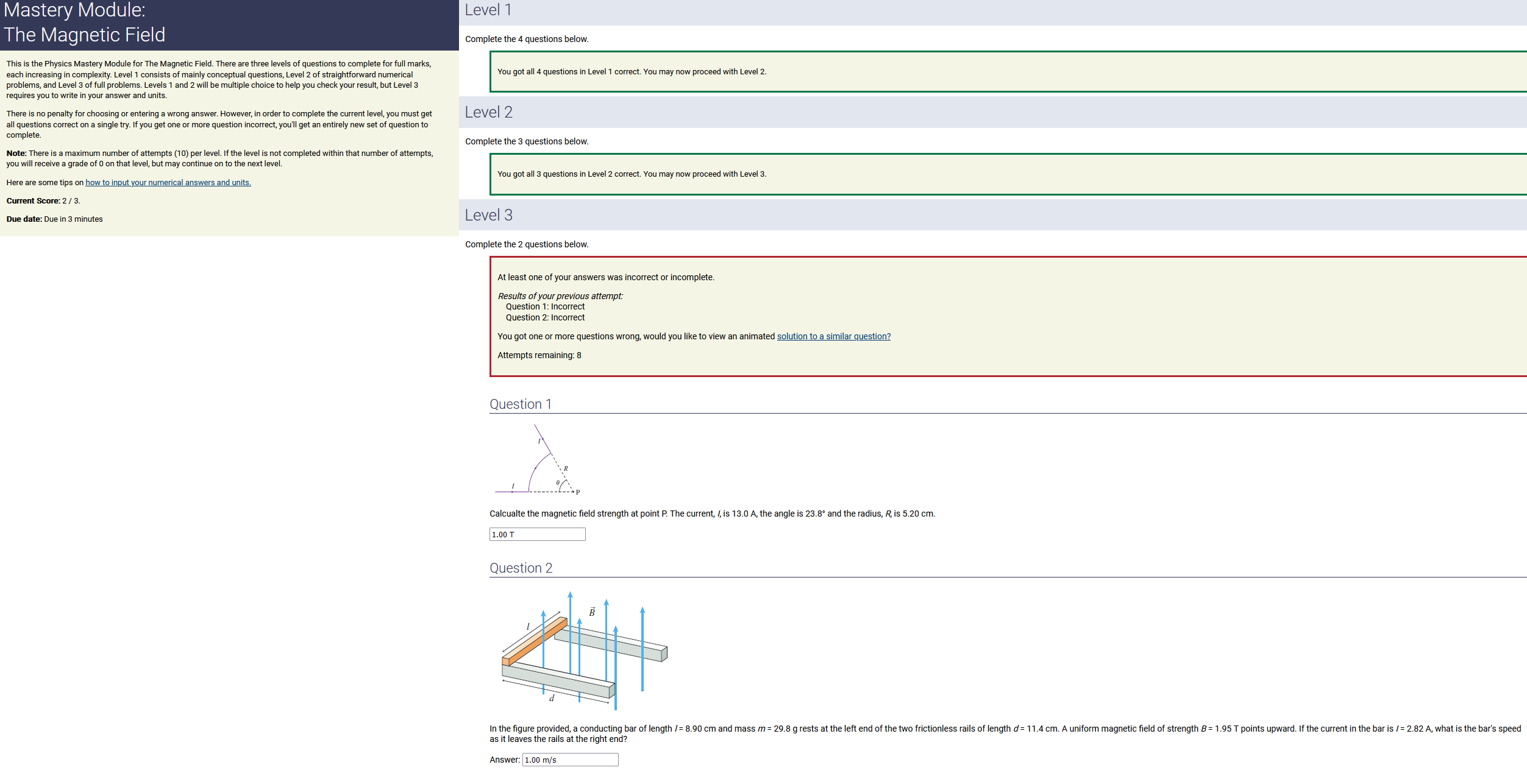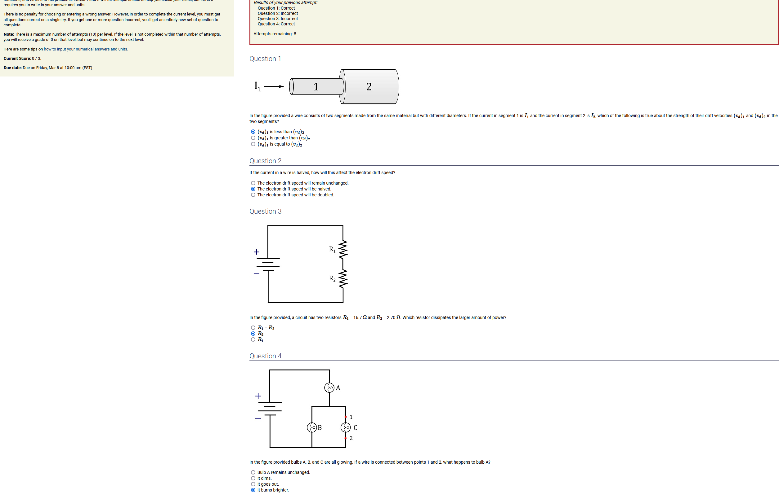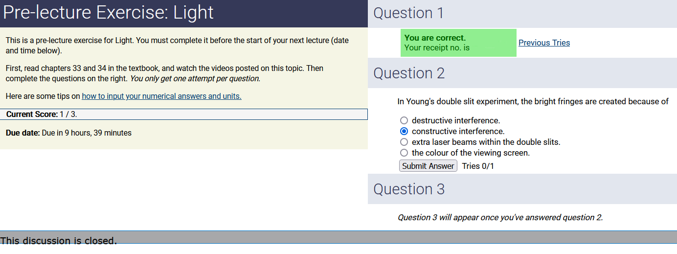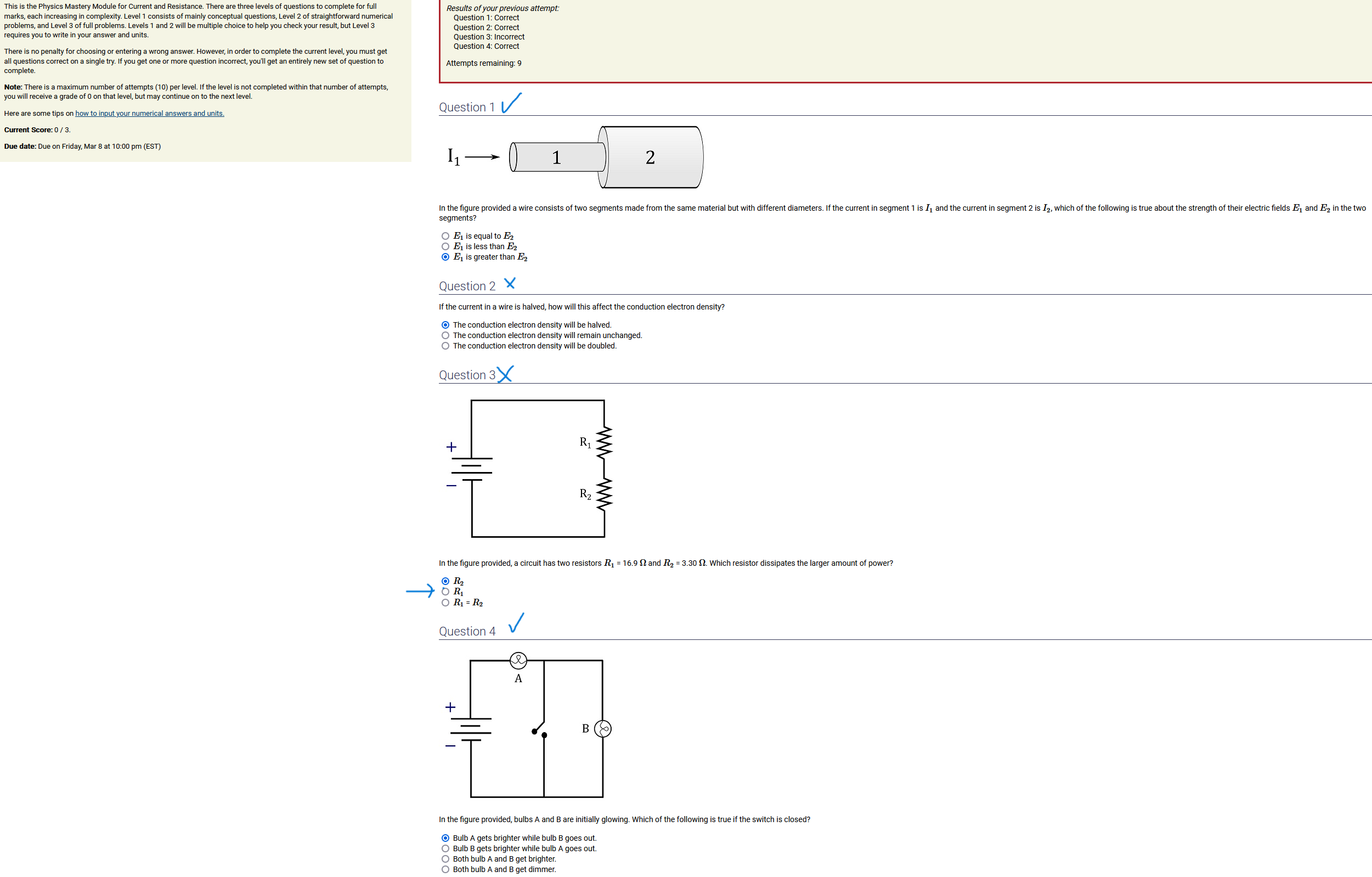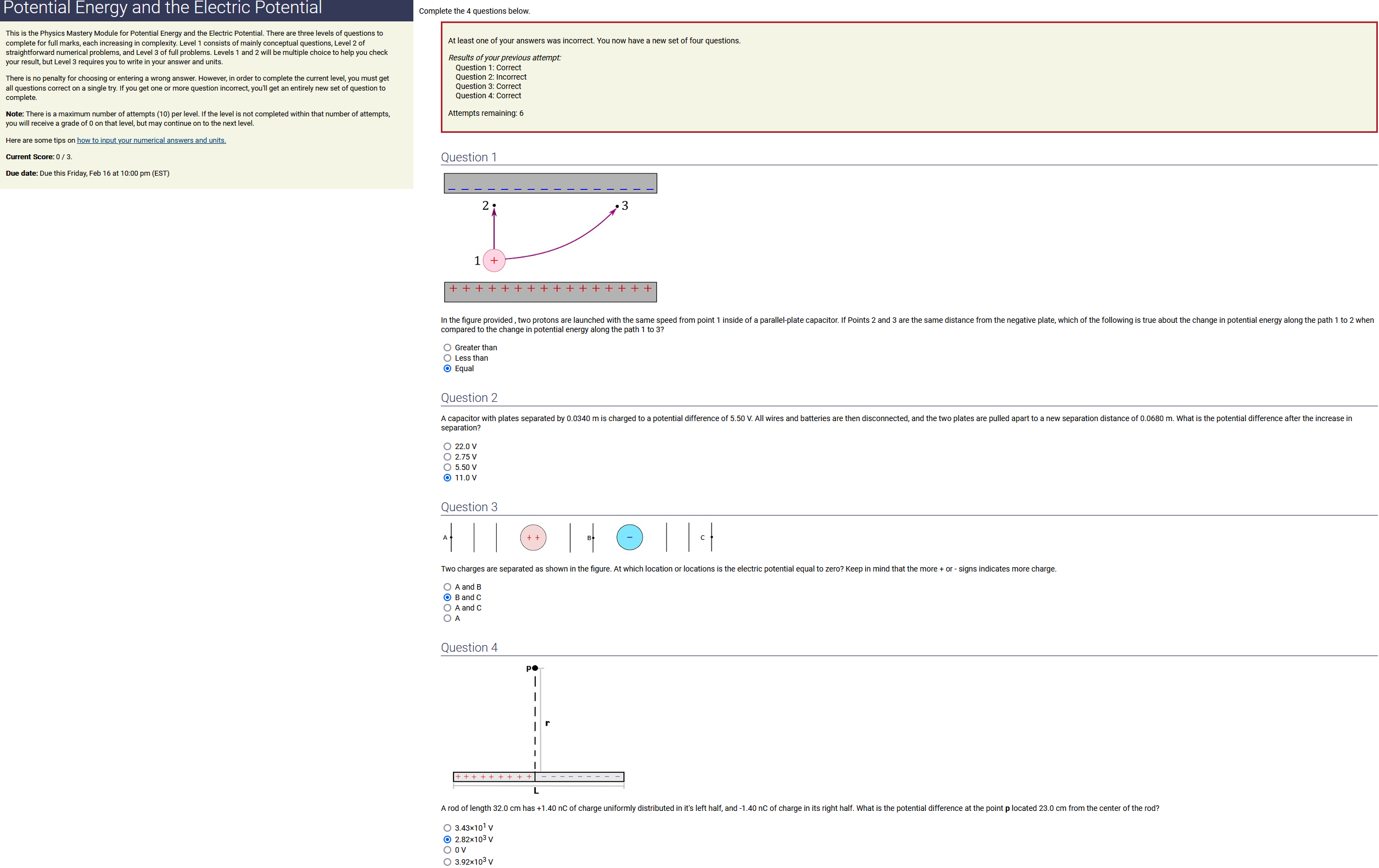 To make it clear how different questions can vary, I will labelling them based on the 2 ways they can change between attempts: 'Lim-Var' denotes questions with a limited number of variations (for example, if a formula has, say, 4 variables in it, and the question asks "what will happen to the answer if the variable __ is doubled in mangitude?", then this question will very likely have 4 'variations' total, which means this question can change the variable it's asking about in 4 different ways between attempts). 'Inf-Var' denotes questions with infinite variations (every single attempt of this question will have different numbers to go with it, and the numbers may be barely or very different). Note that a question can be both of these types at the same time. Also note that not every variation of a Lim-Var question will be available.