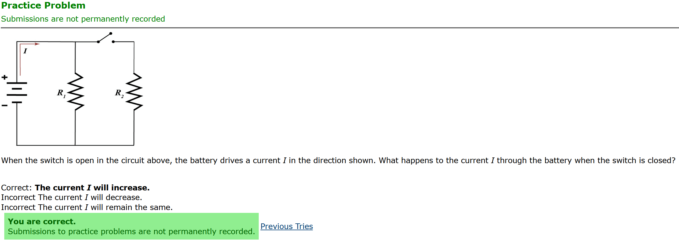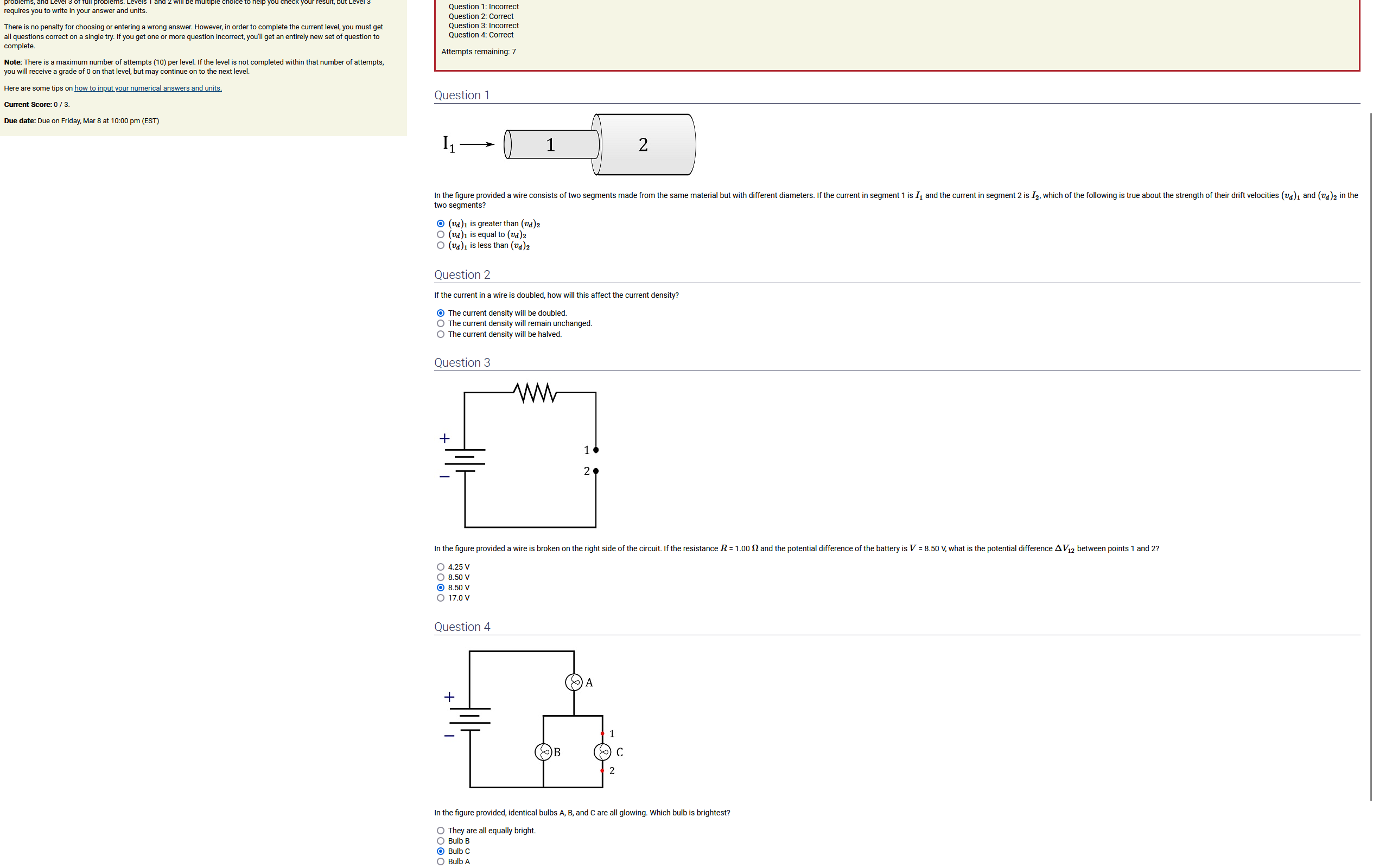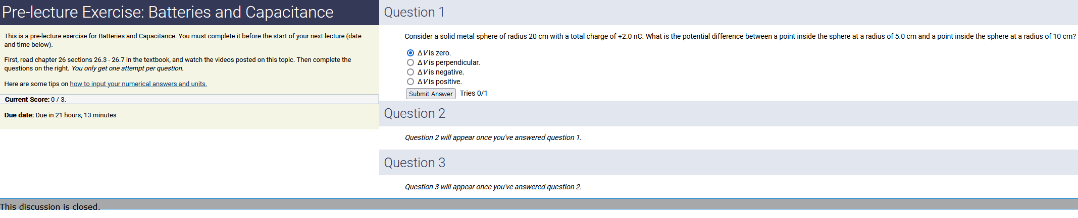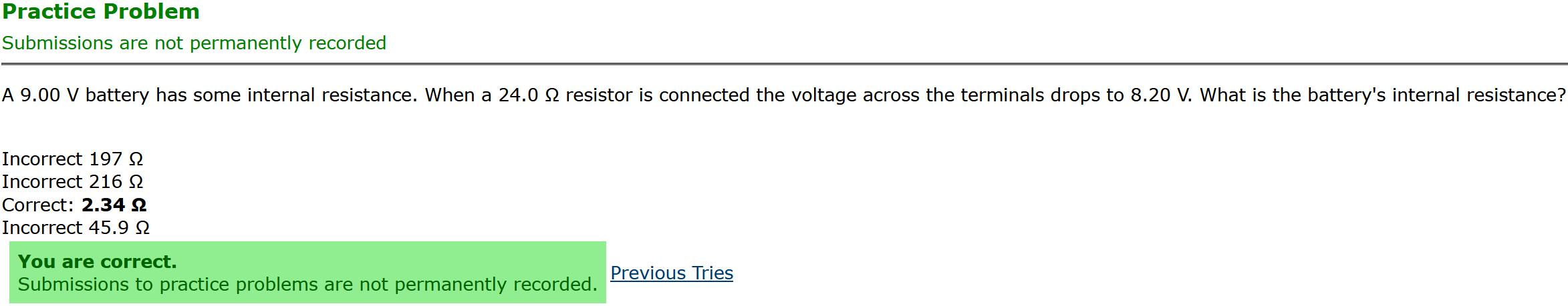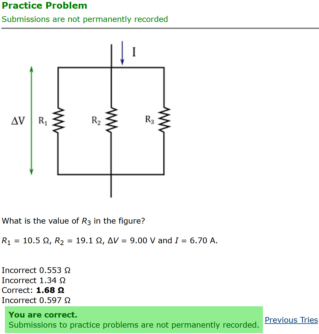 To make it clear how different questions can vary, I will labelling them based on the 2 ways they can change between attempts: 'Lim-Var' denotes questions with a limited number of variations (for example, if a formula has, say, 4 variables in it, and the question asks "what will happen to the answer if the variable __ is doubled in mangitude?", then this question will very likely have 4 'variations' total, which means this question can change the variable it's asking about in 4 different ways between attempts). 'Inf-Var' denotes questions with infinite variations (every single attempt of this question will have different numbers to go with it, and the numbers may be barely or very different). Note that a question can be both of these types at the same time. Also note that not every variation of a Lim-Var question will be available.