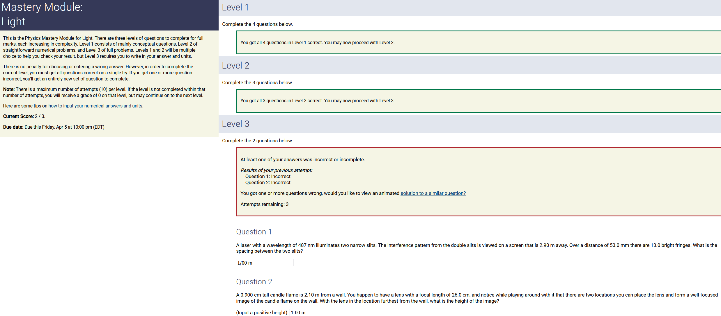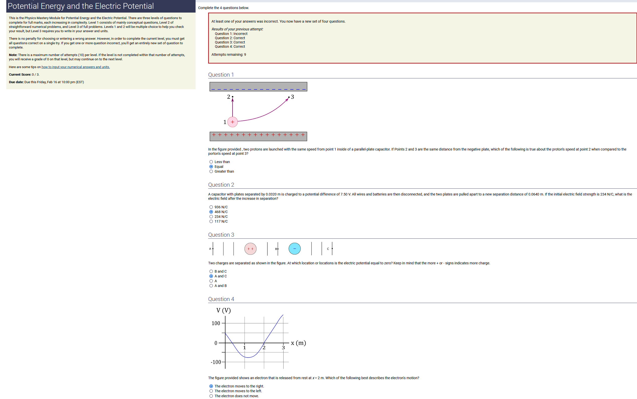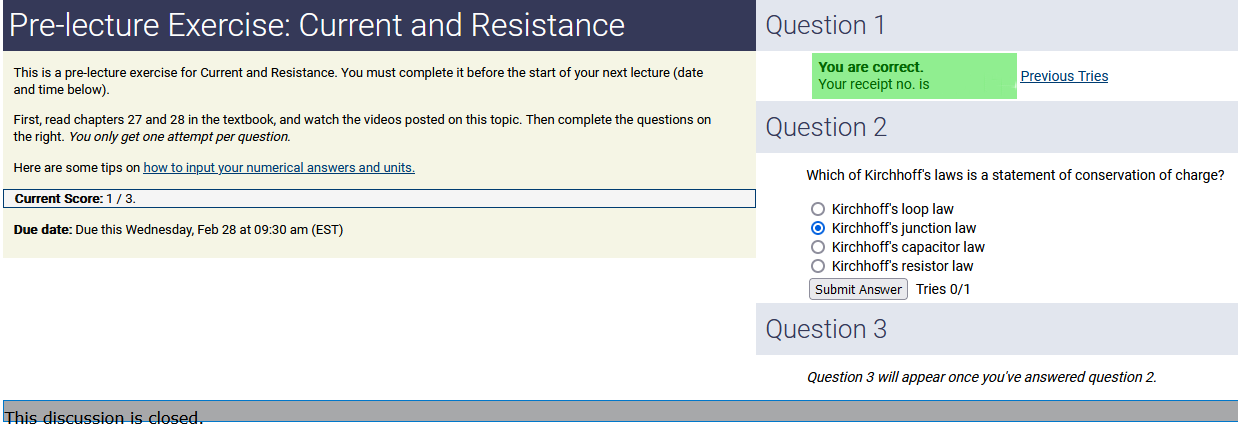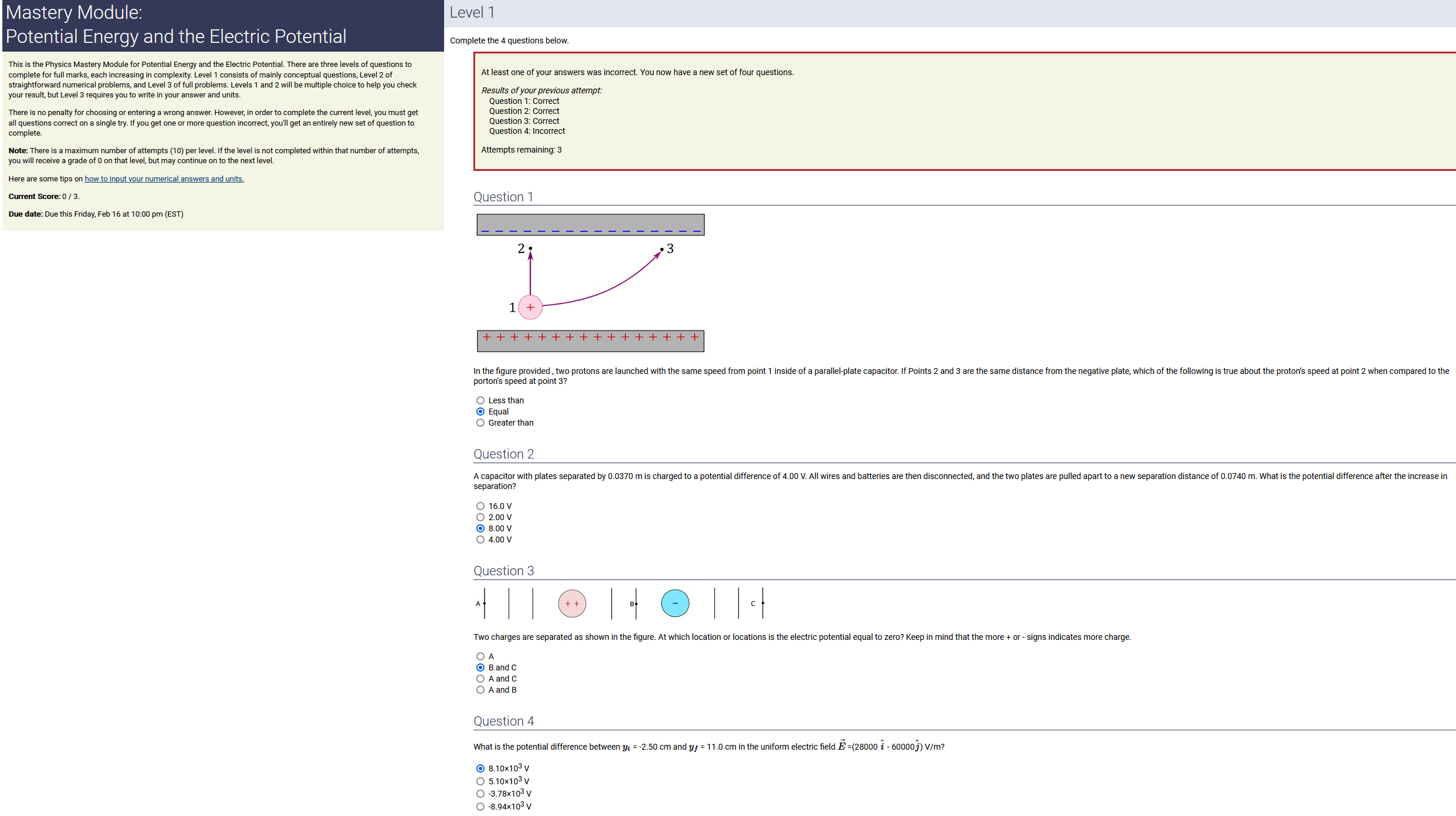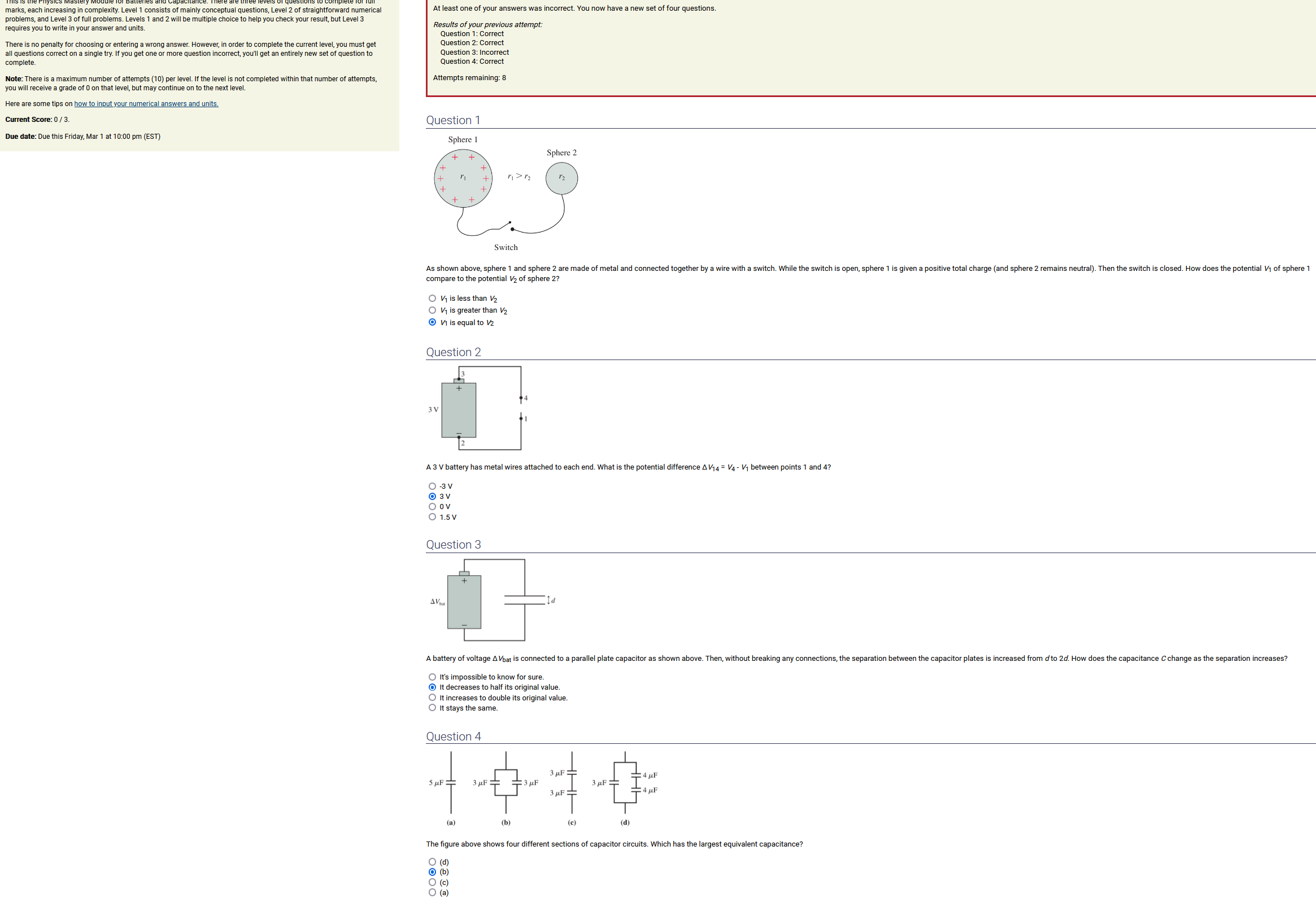 To make it clear how different questions can vary, I will labelling them based on the 2 ways they can change between attempts: 'Lim-Var' denotes questions with a limited number of variations (for example, if a formula has, say, 4 variables in it, and the question asks "what will happen to the answer if the variable __ is doubled in mangitude?", then this question will very likely have 4 'variations' total, which means this question can change the variable it's asking about in 4 different ways between attempts). 'Inf-Var' denotes questions with infinite variations (every single attempt of this question will have different numbers to go with it, and the numbers may be barely or very different). Note that a question can be both of these types at the same time. Also note that not every variation of a Lim-Var question will be available.