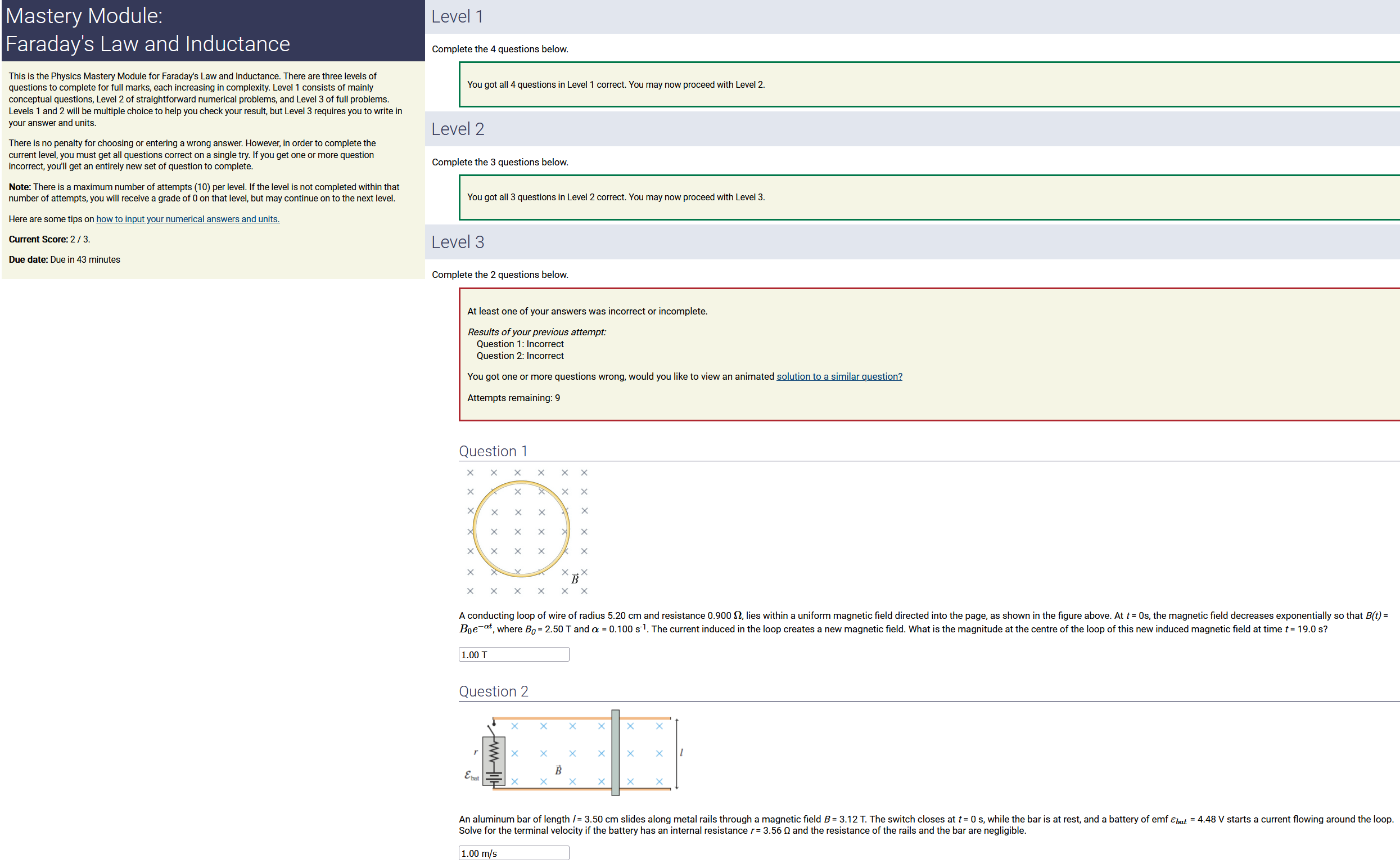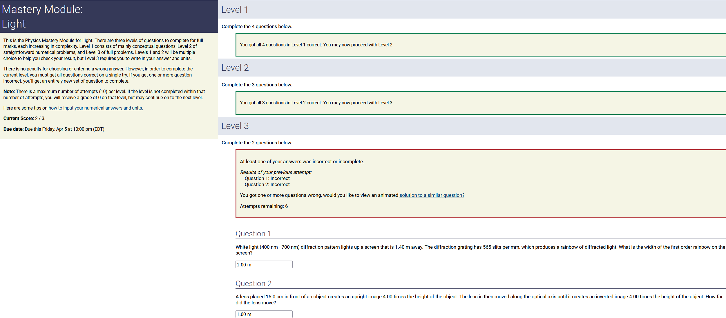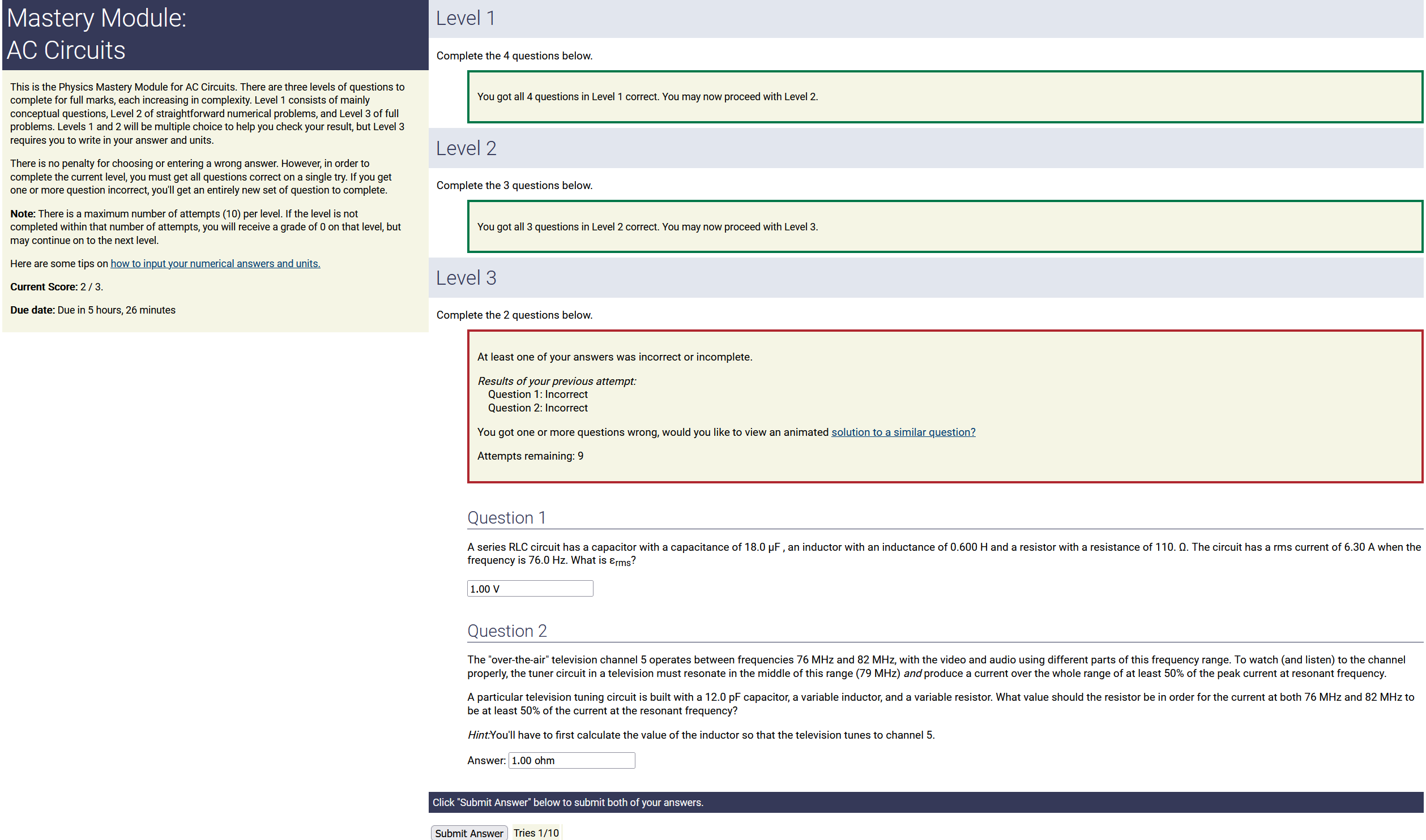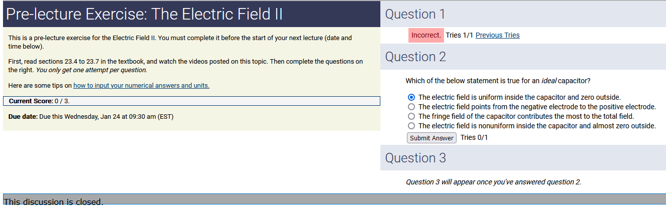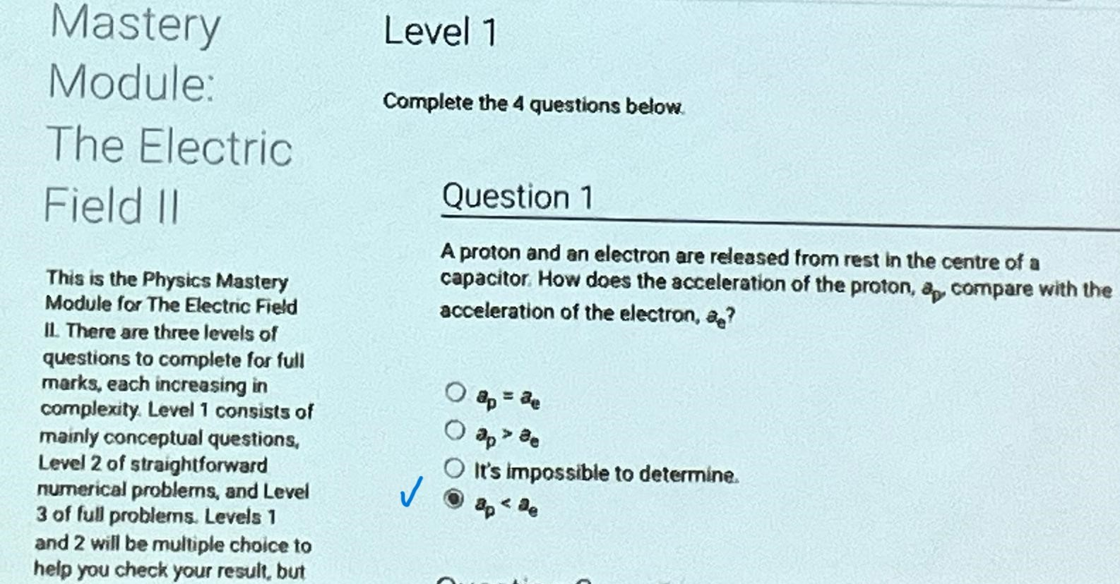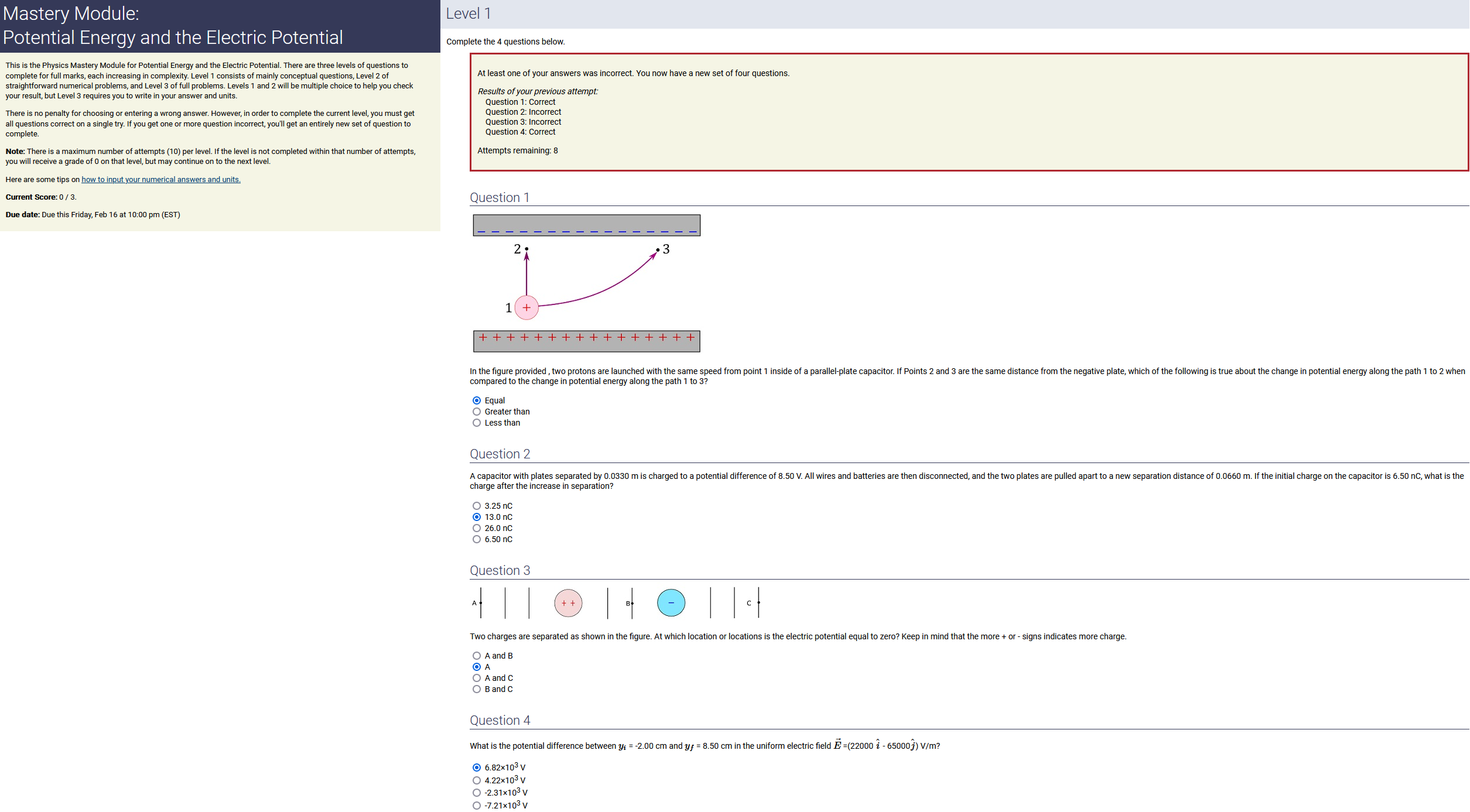 To make it clear how different questions can vary, I will labelling them based on the 2 ways they can change between attempts: 'Lim-Var' denotes questions with a limited number of variations (for example, if a formula has, say, 4 variables in it, and the question asks "what will happen to the answer if the variable __ is doubled in mangitude?", then this question will very likely have 4 'variations' total, which means this question can change the variable it's asking about in 4 different ways between attempts). 'Inf-Var' denotes questions with infinite variations (every single attempt of this question will have different numbers to go with it, and the numbers may be barely or very different). Note that a question can be both of these types at the same time. Also note that not every variation of a Lim-Var question will be available.