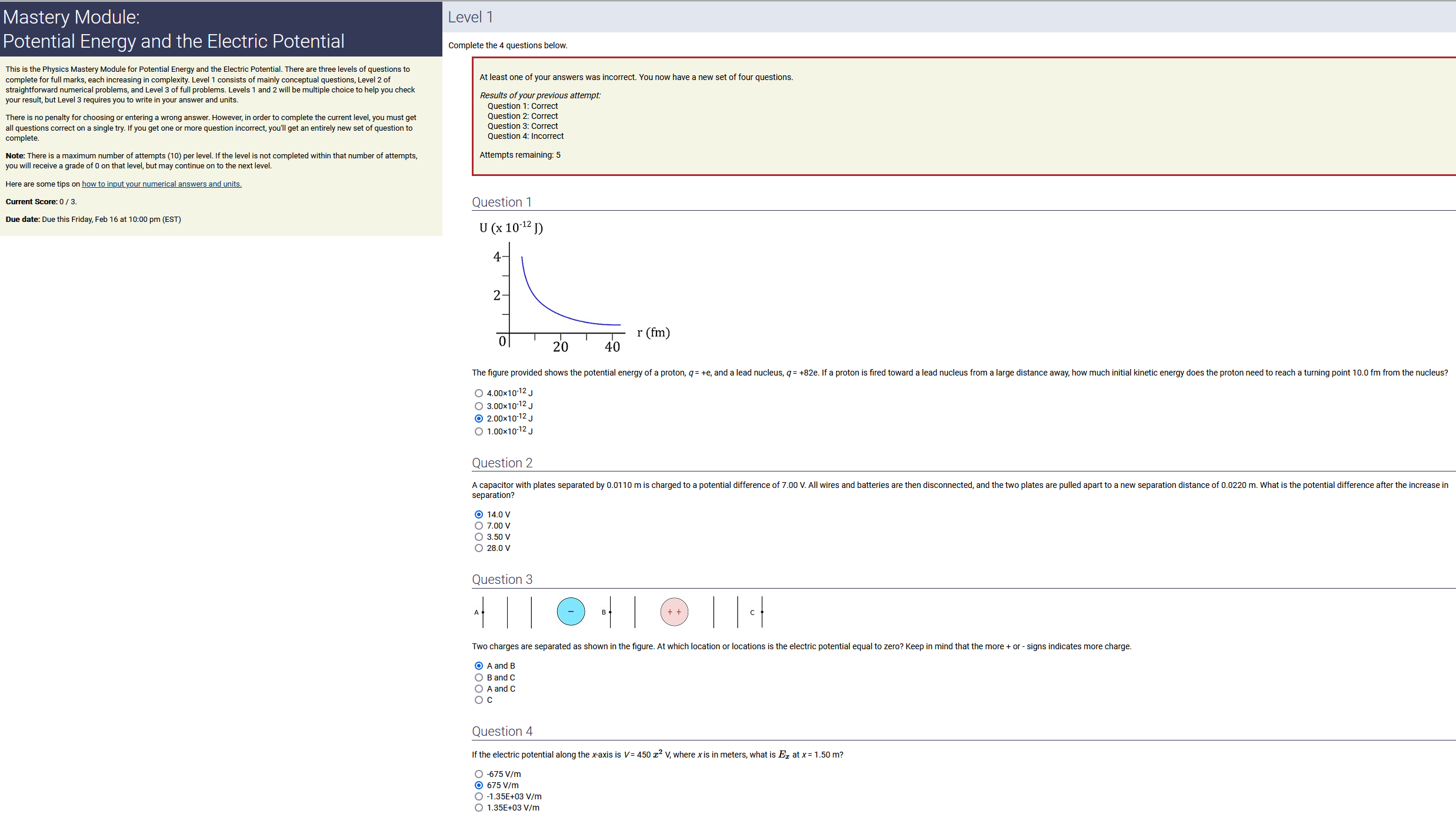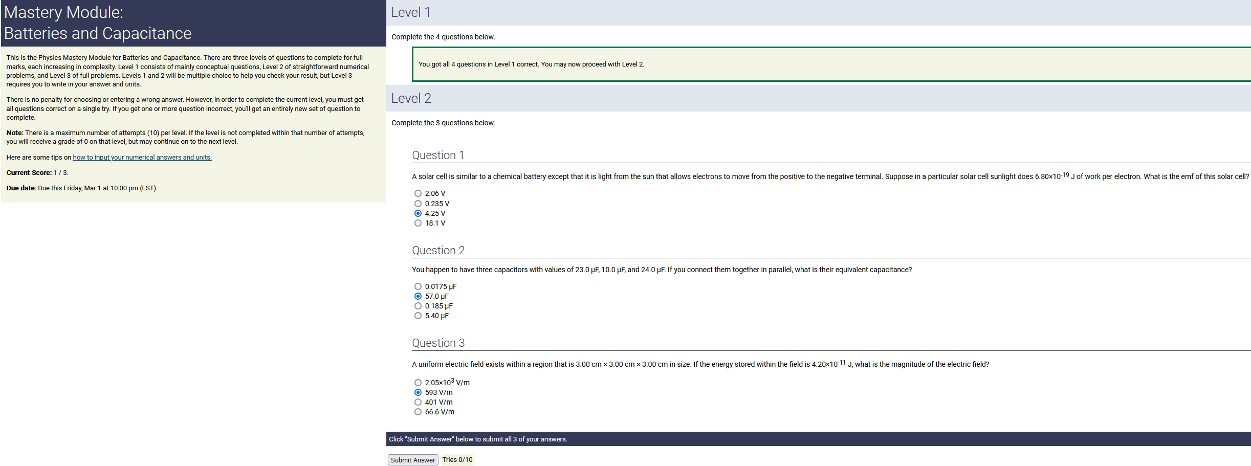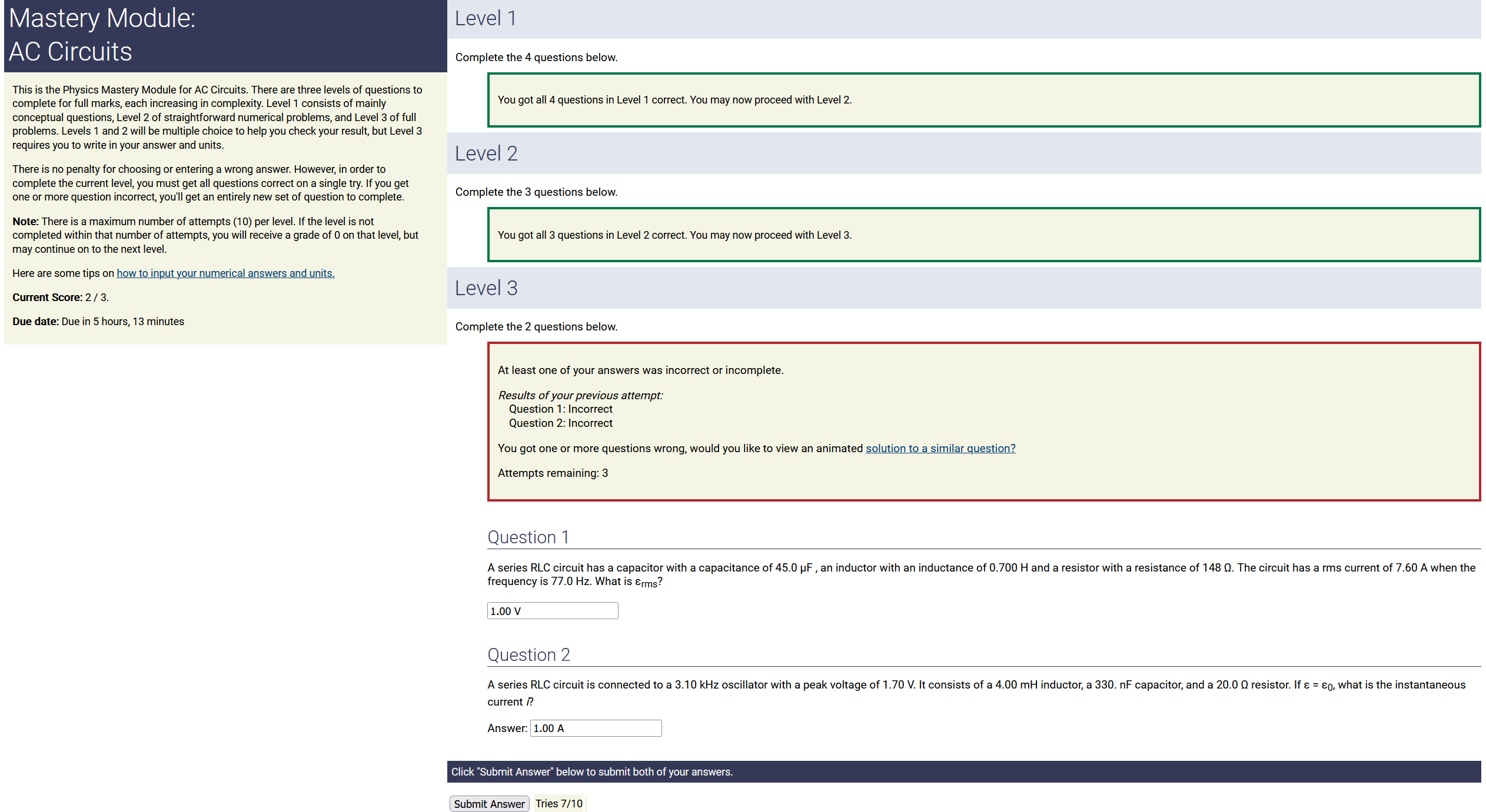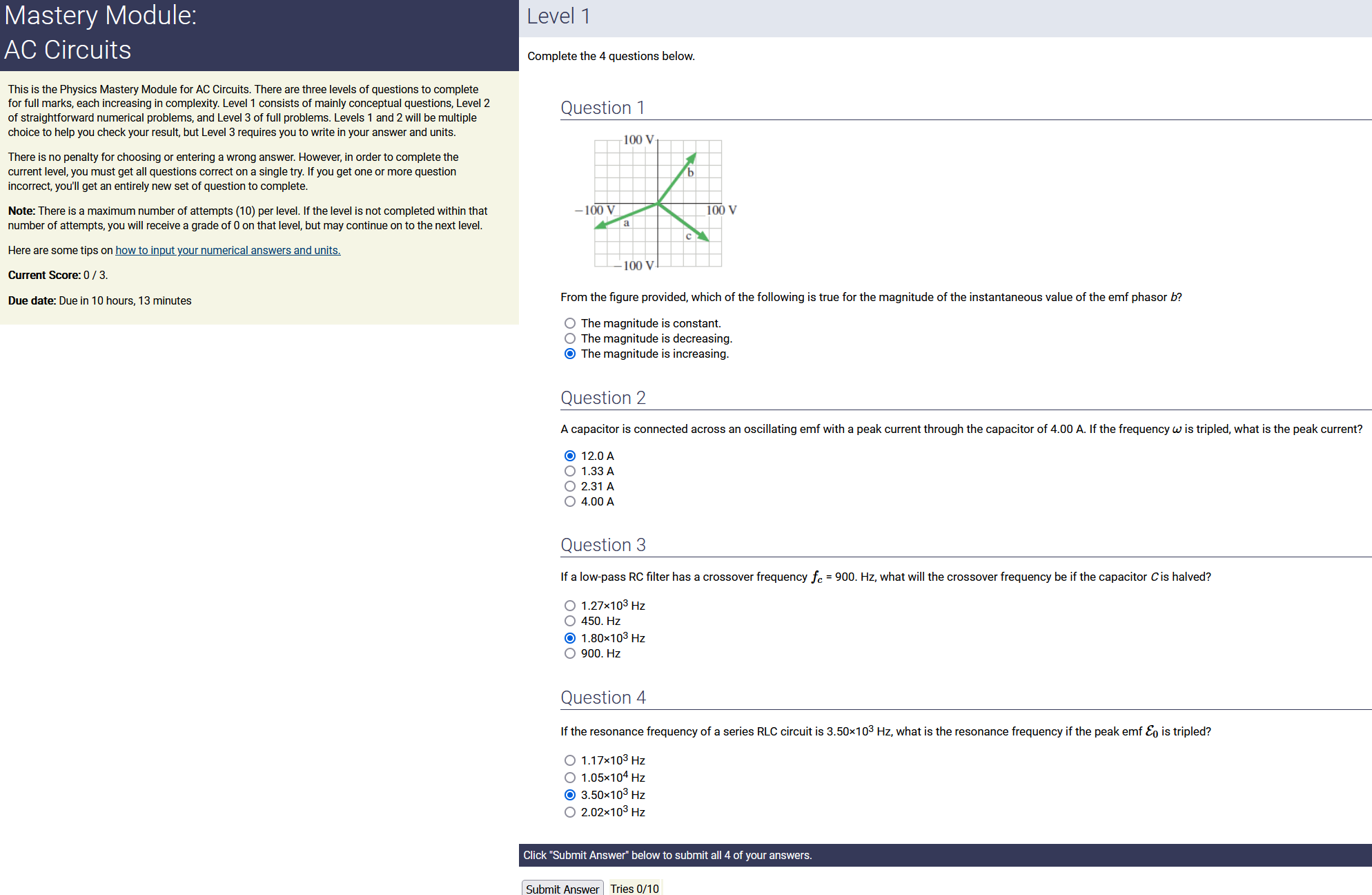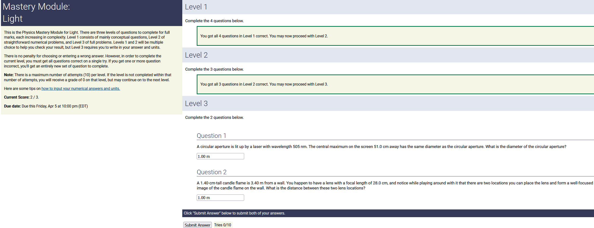 To make it clear how different questions can vary, I will labelling them based on the 2 ways they can change between attempts: 'Lim-Var' denotes questions with a limited number of variations (for example, if a formula has, say, 4 variables in it, and the question asks "what will happen to the answer if the variable __ is doubled in mangitude?", then this question will very likely have 4 'variations' total, which means this question can change the variable it's asking about in 4 different ways between attempts). 'Inf-Var' denotes questions with infinite variations (every single attempt of this question will have different numbers to go with it, and the numbers may be barely or very different). Note that a question can be both of these types at the same time. Also note that not every variation of a Lim-Var question will be available.