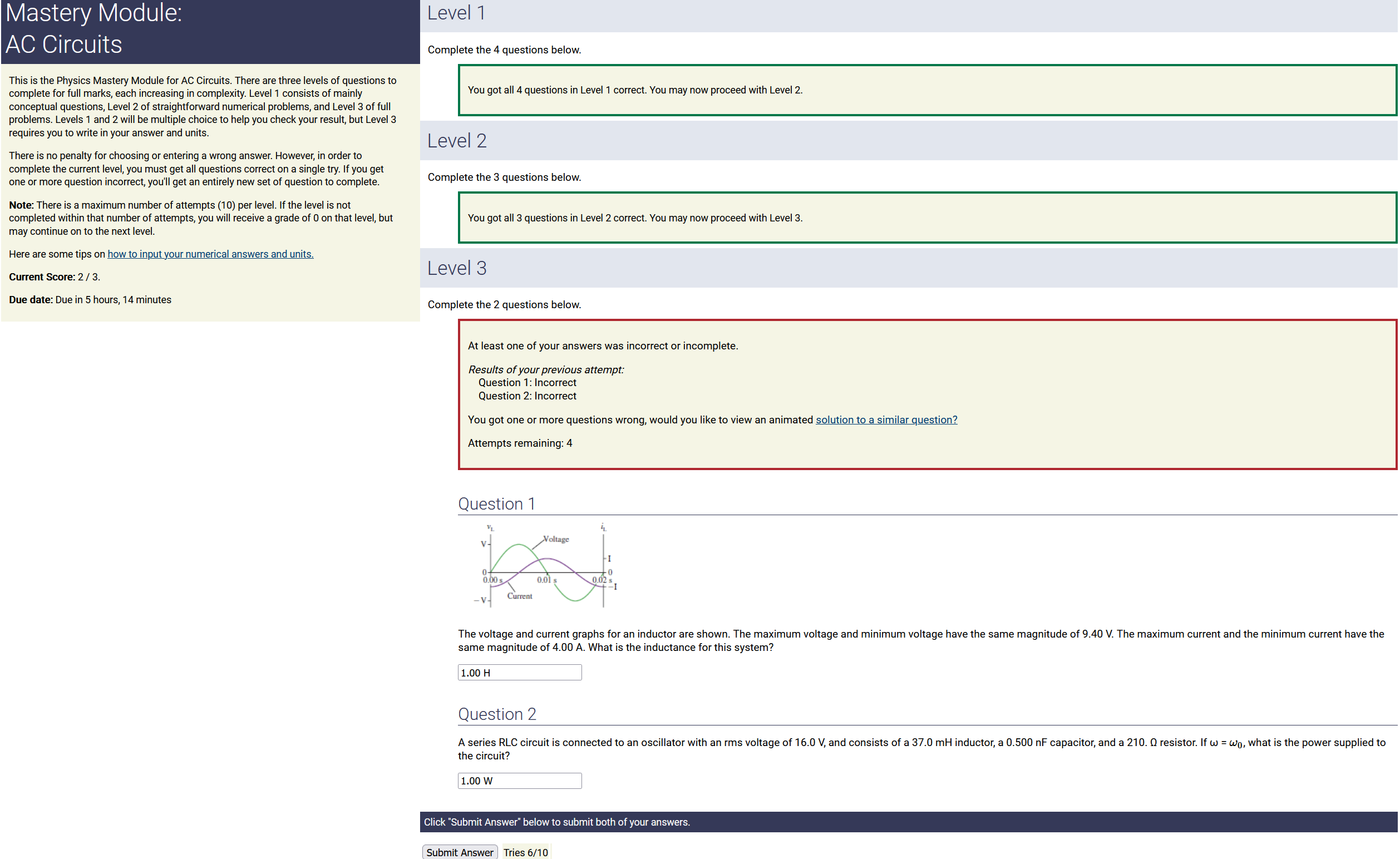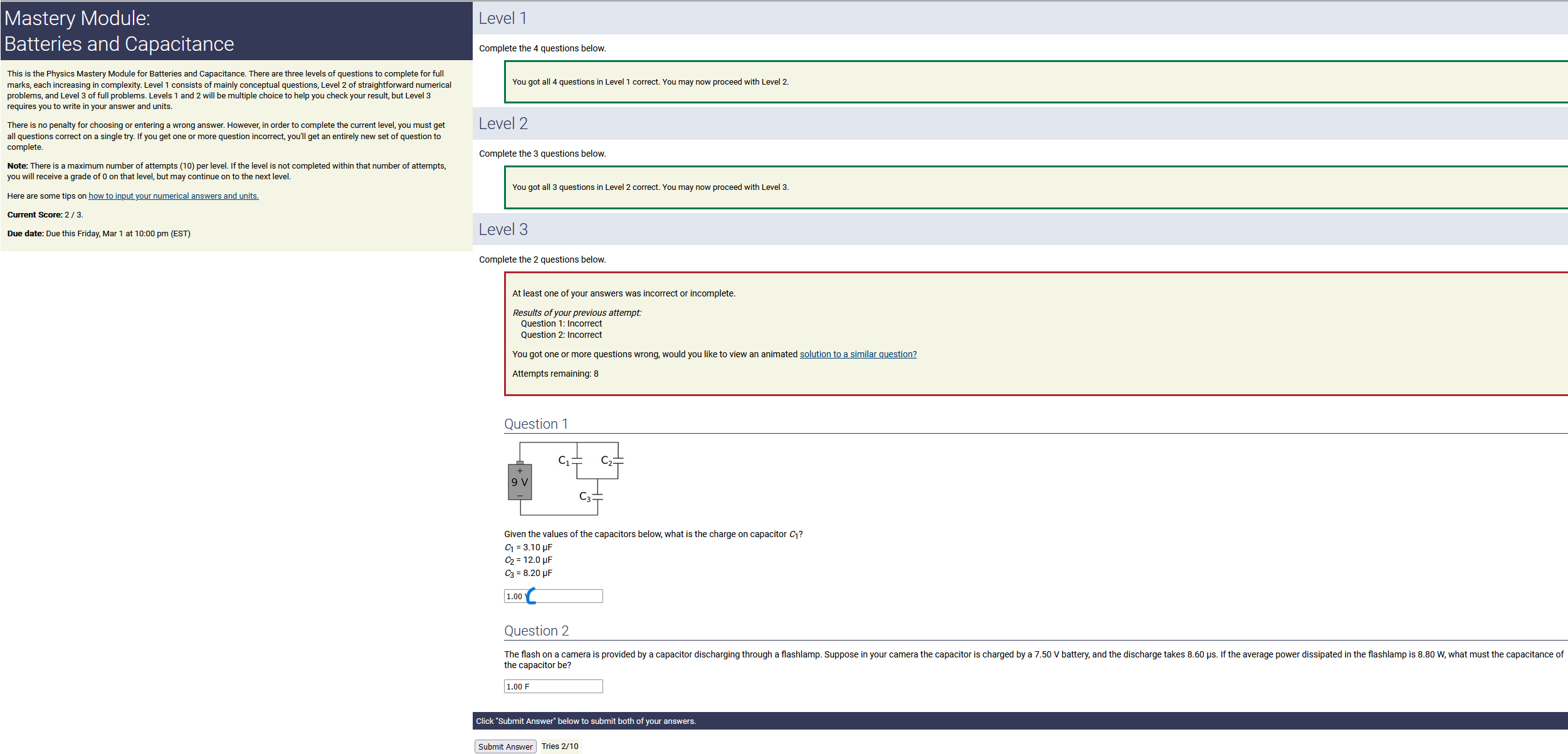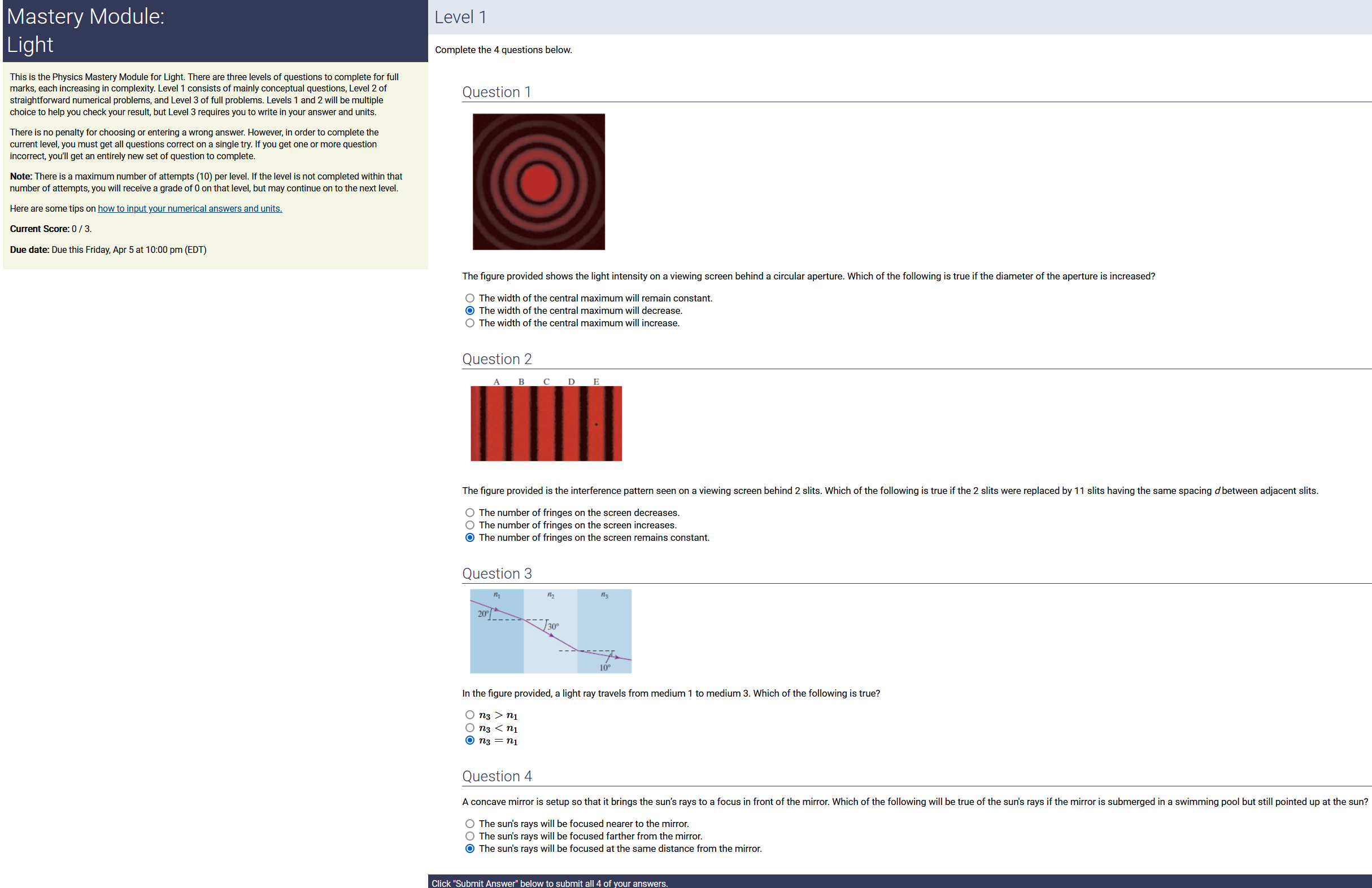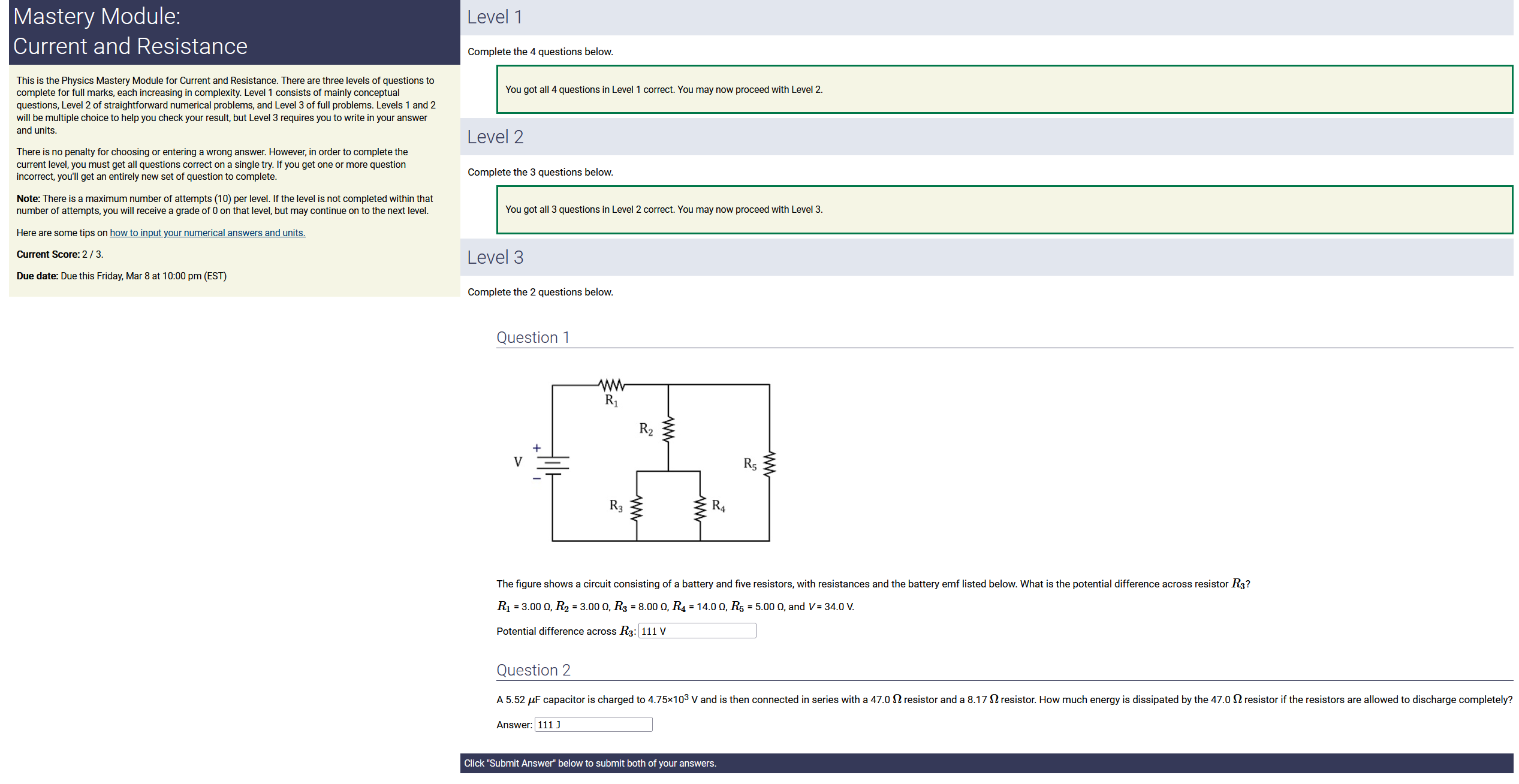 To make it clear how different questions can vary, I will labelling them based on the 2 ways they can change between attempts: 'Lim-Var' denotes questions with a limited number of variations (for example, if a formula has, say, 4 variables in it, and the question asks "what will happen to the answer if the variable __ is doubled in mangitude?", then this question will very likely have 4 'variations' total, which means this question can change the variable it's asking about in 4 different ways between attempts). 'Inf-Var' denotes questions with infinite variations (every single attempt of this question will have different numbers to go with it, and the numbers may be barely or very different). Note that a question can be both of these types at the same time. Also note that not every variation of a Lim-Var question will be available.