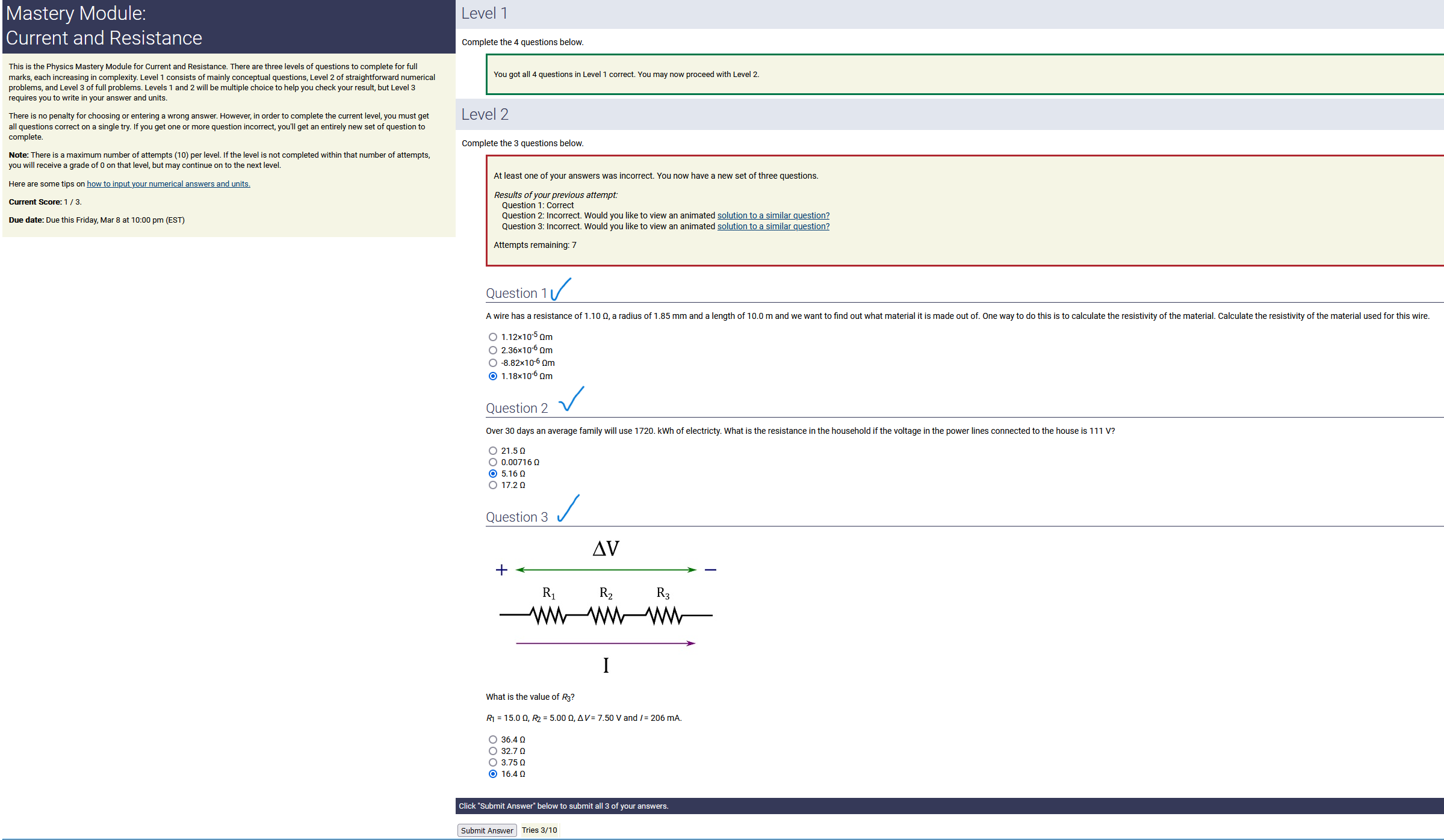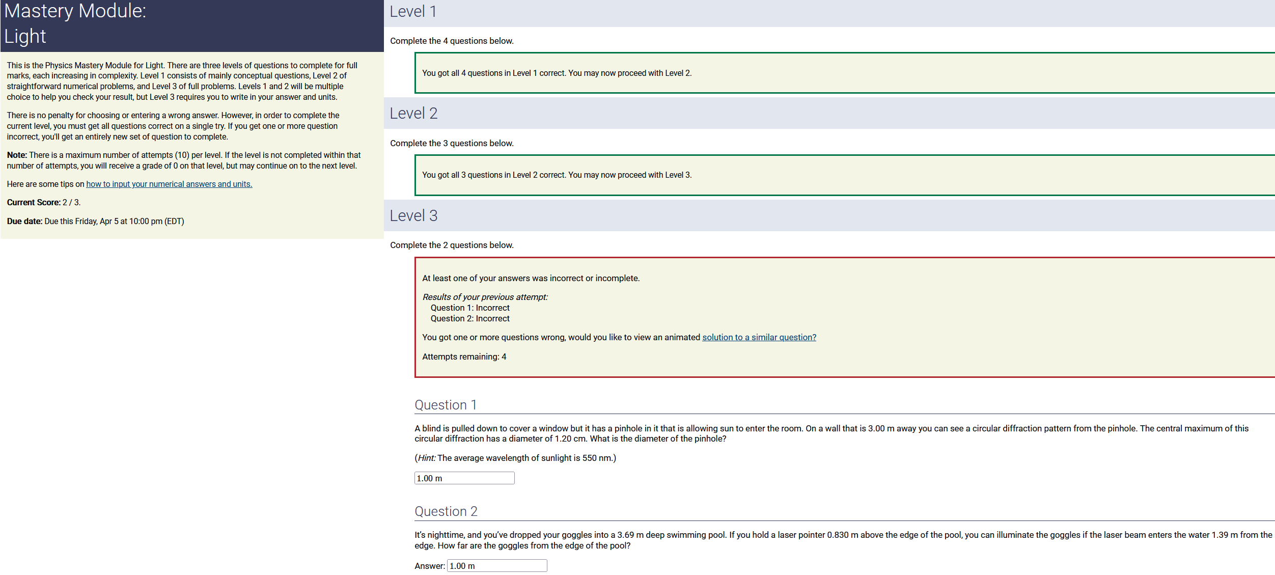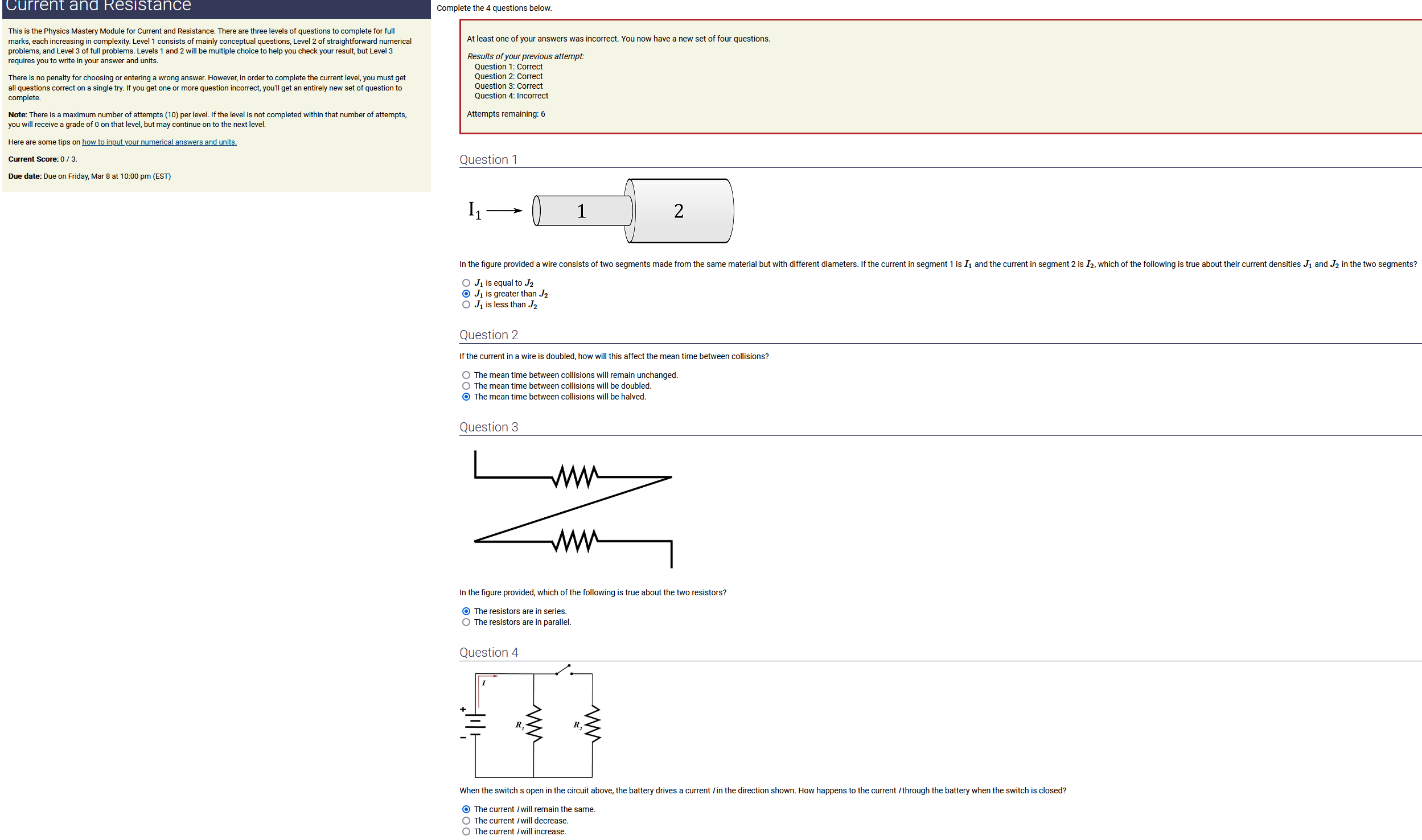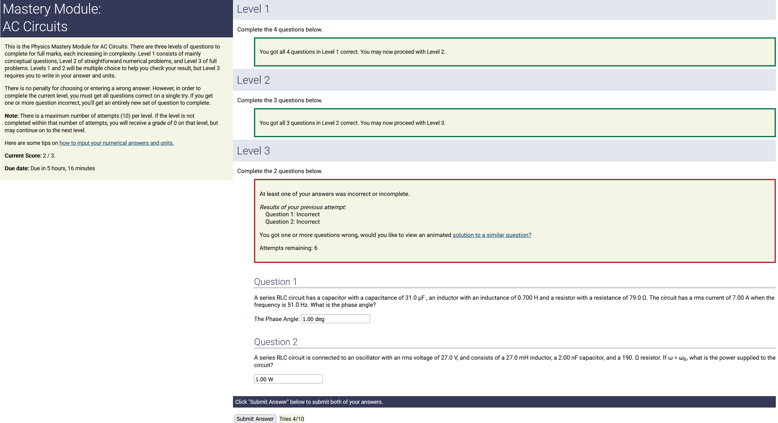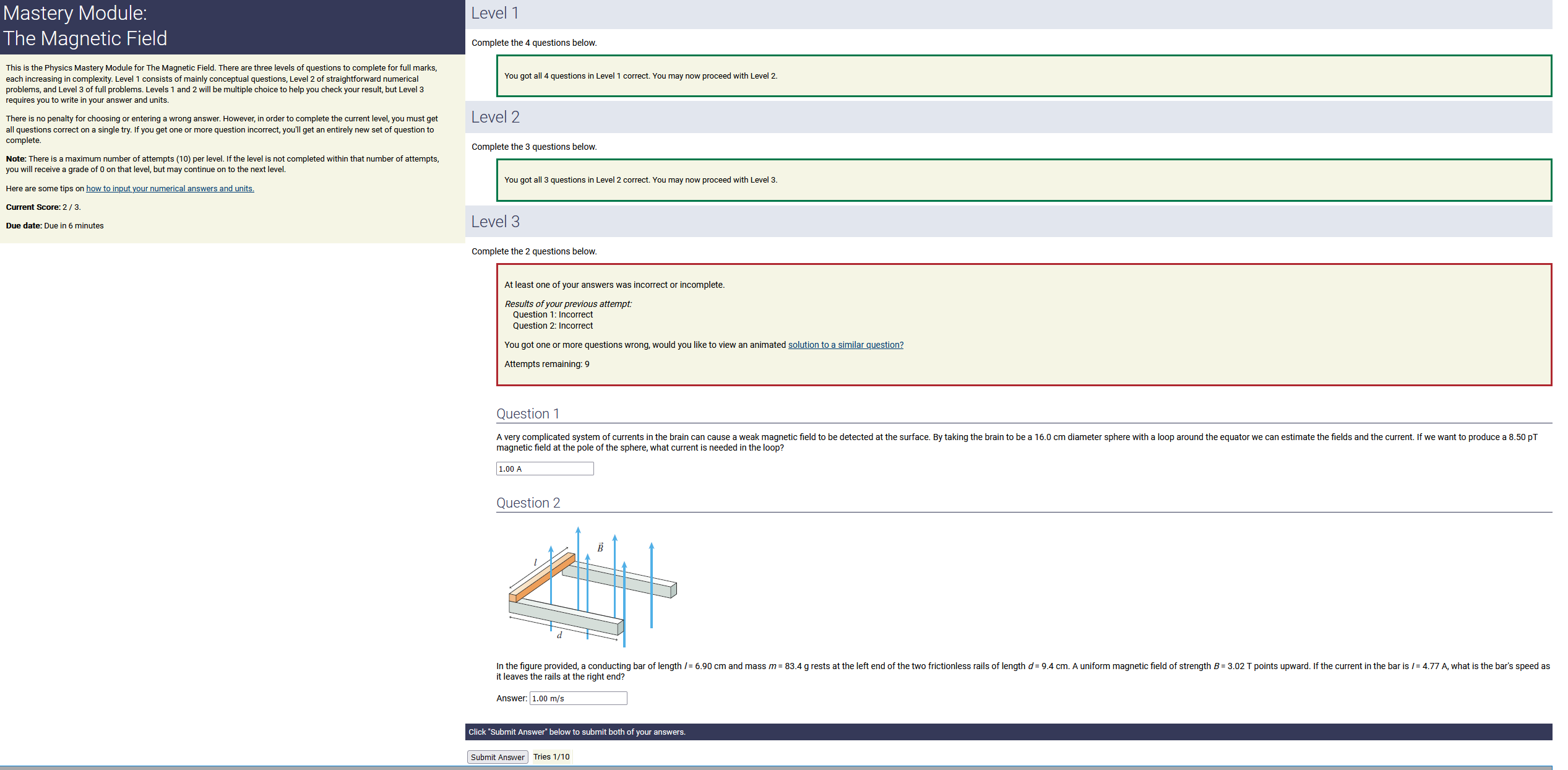 To make it clear how different questions can vary, I will labelling them based on the 2 ways they can change between attempts: 'Lim-Var' denotes questions with a limited number of variations (for example, if a formula has, say, 4 variables in it, and the question asks "what will happen to the answer if the variable __ is doubled in mangitude?", then this question will very likely have 4 'variations' total, which means this question can change the variable it's asking about in 4 different ways between attempts). 'Inf-Var' denotes questions with infinite variations (every single attempt of this question will have different numbers to go with it, and the numbers may be barely or very different). Note that a question can be both of these types at the same time. Also note that not every variation of a Lim-Var question will be available.