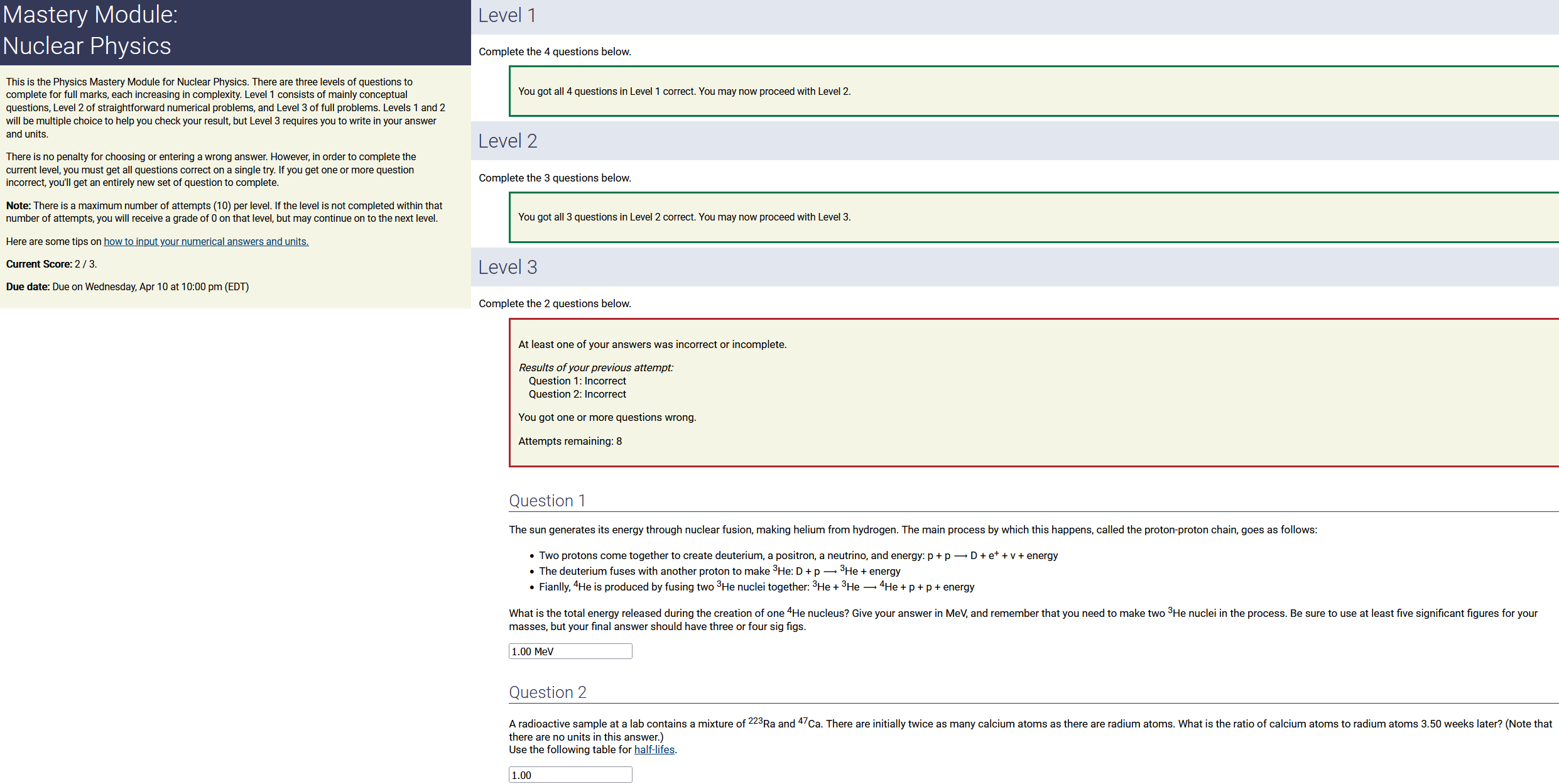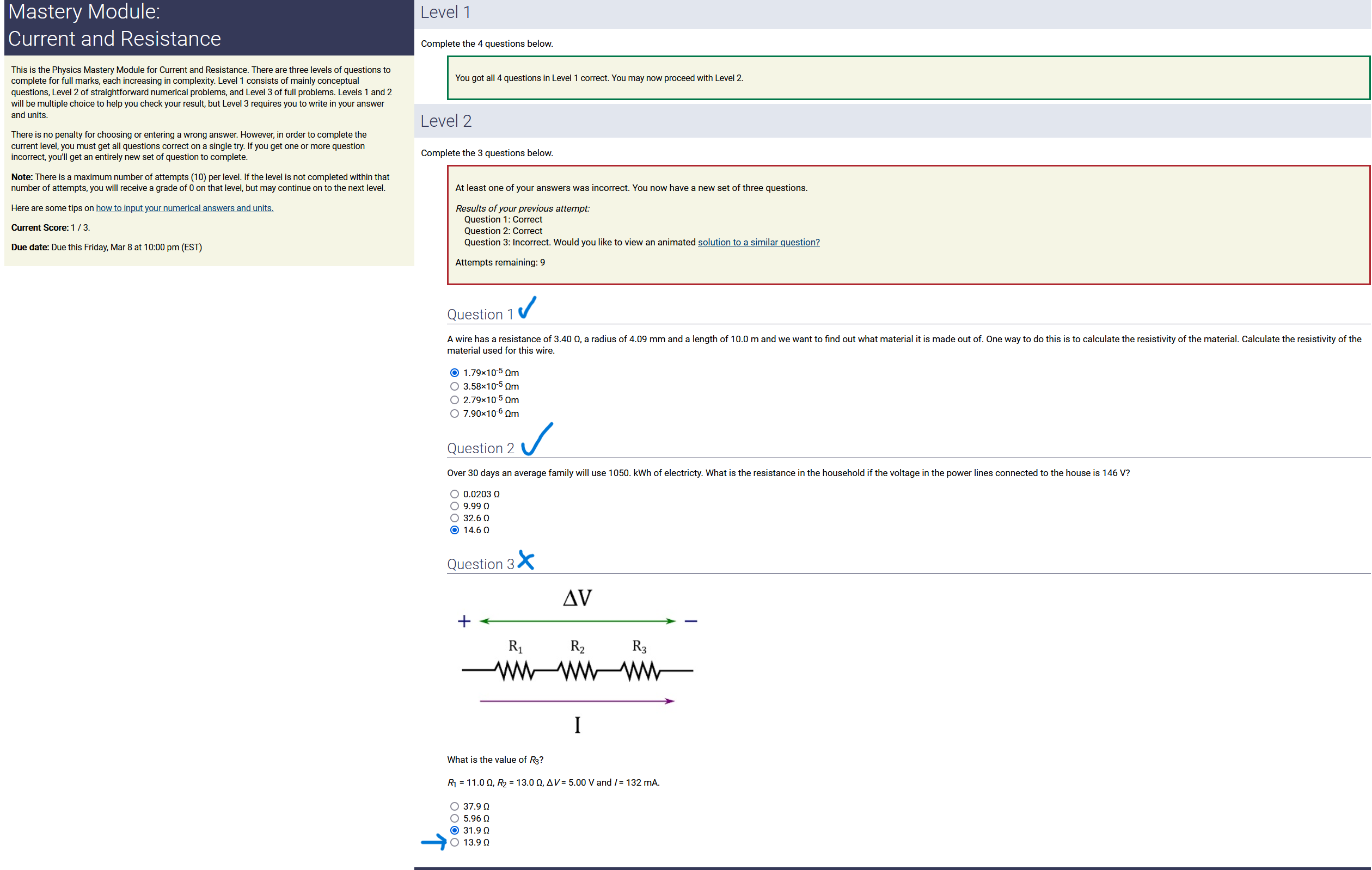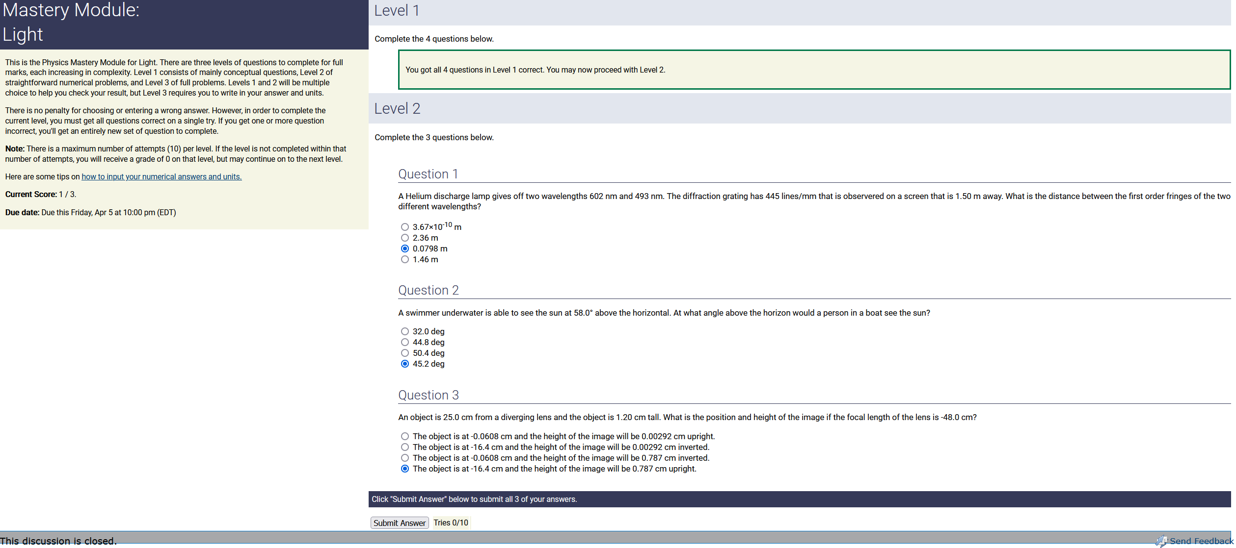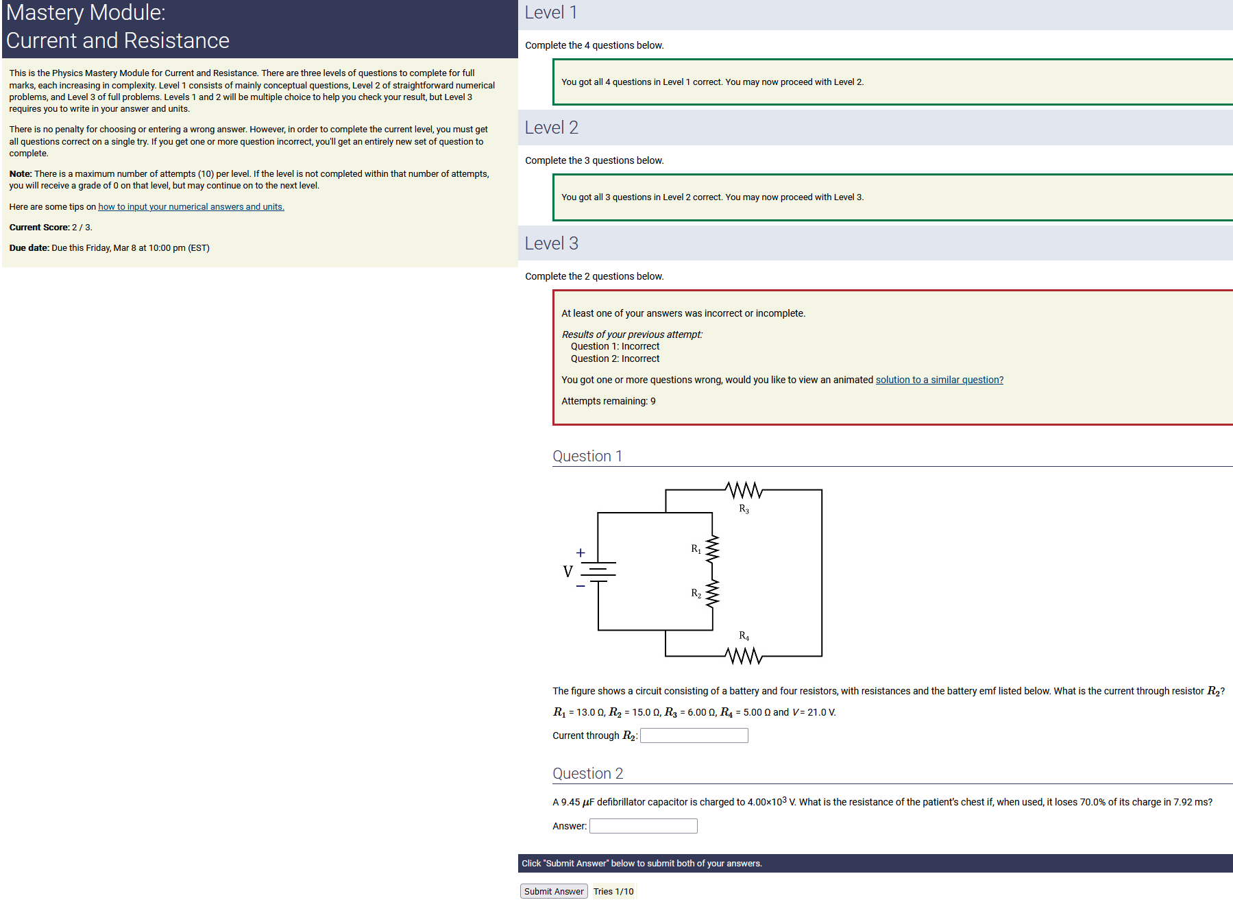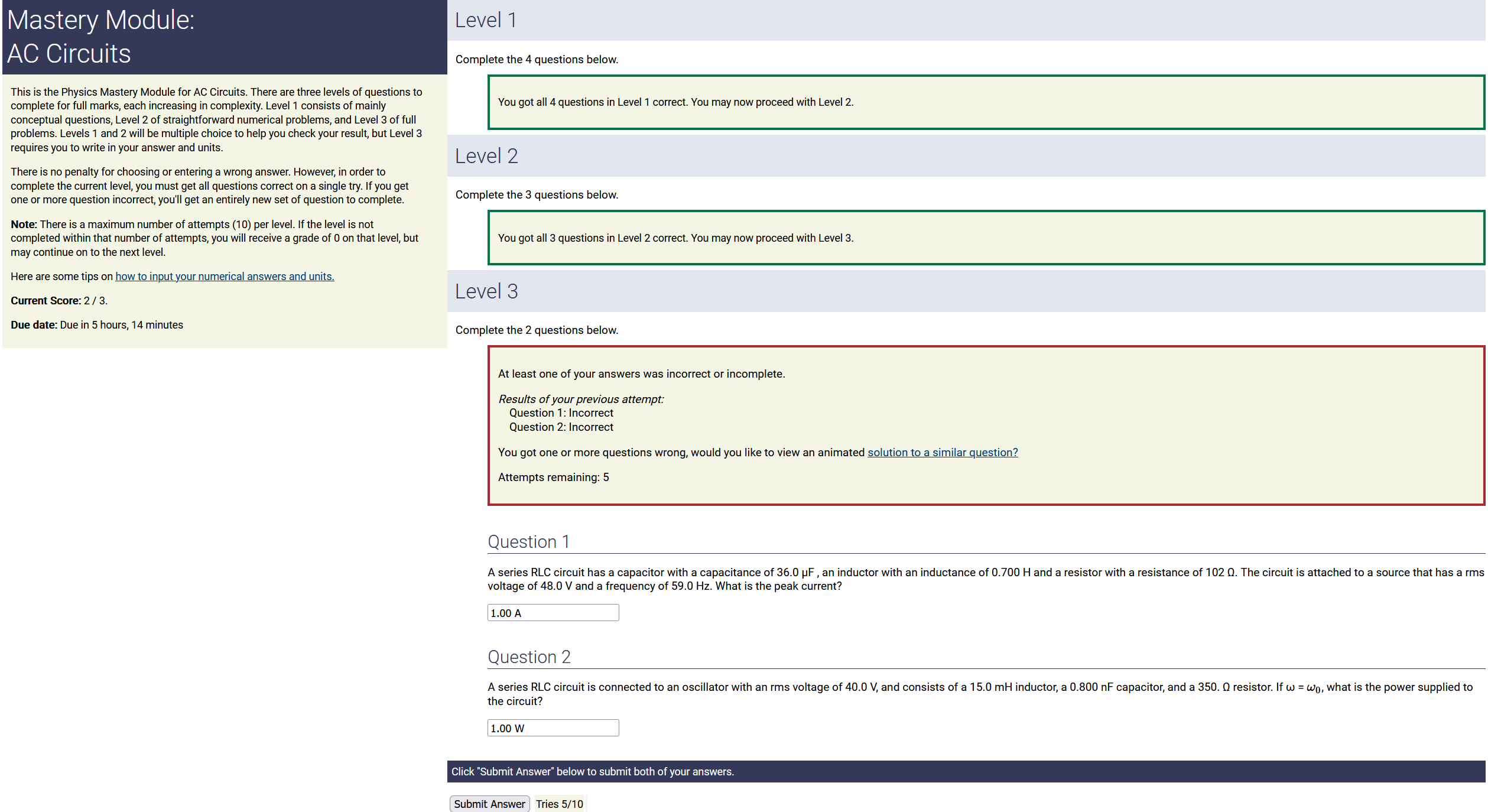 To make it clear how different questions can vary, I will labelling them based on the 2 ways they can change between attempts: 'Lim-Var' denotes questions with a limited number of variations (for example, if a formula has, say, 4 variables in it, and the question asks "what will happen to the answer if the variable __ is doubled in mangitude?", then this question will very likely have 4 'variations' total, which means this question can change the variable it's asking about in 4 different ways between attempts). 'Inf-Var' denotes questions with infinite variations (every single attempt of this question will have different numbers to go with it, and the numbers may be barely or very different). Note that a question can be both of these types at the same time. Also note that not every variation of a Lim-Var question will be available.