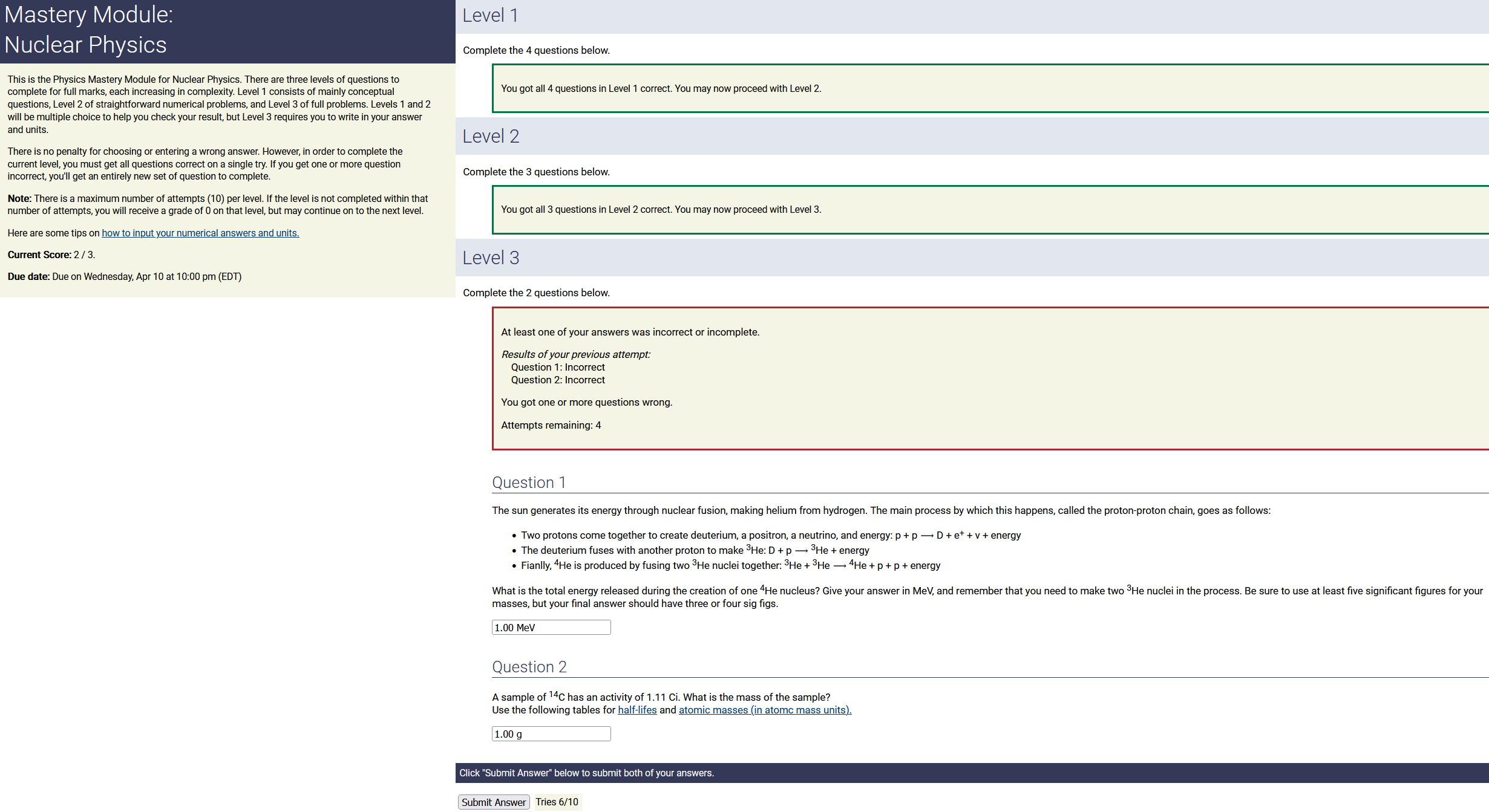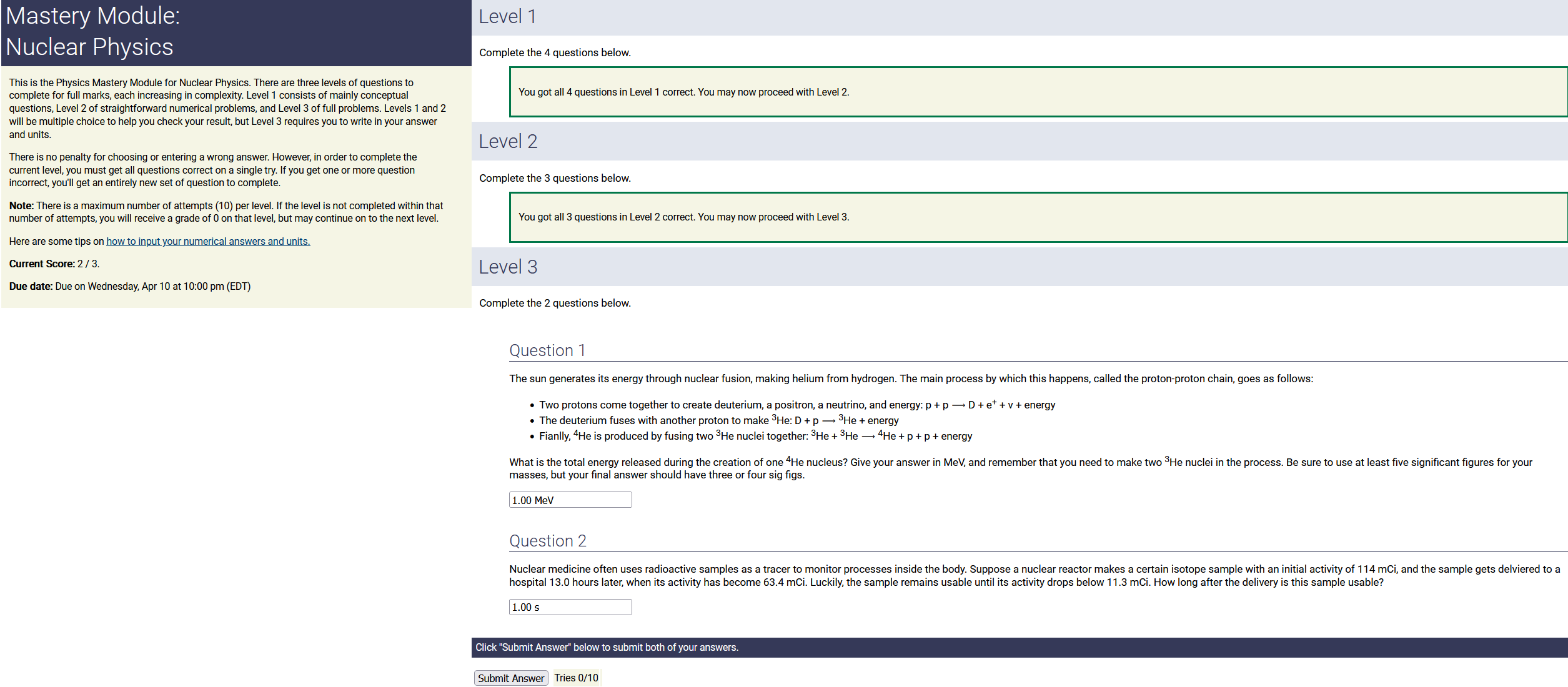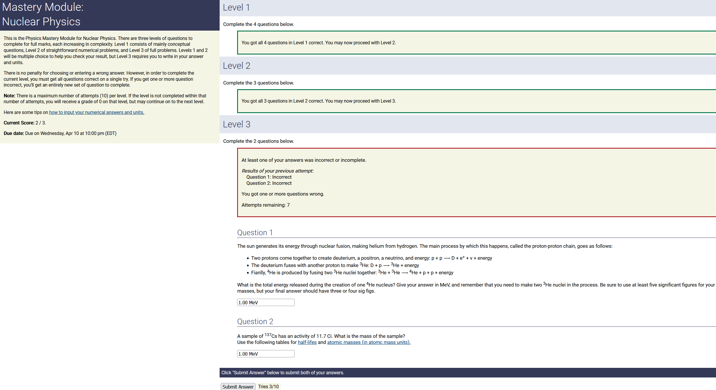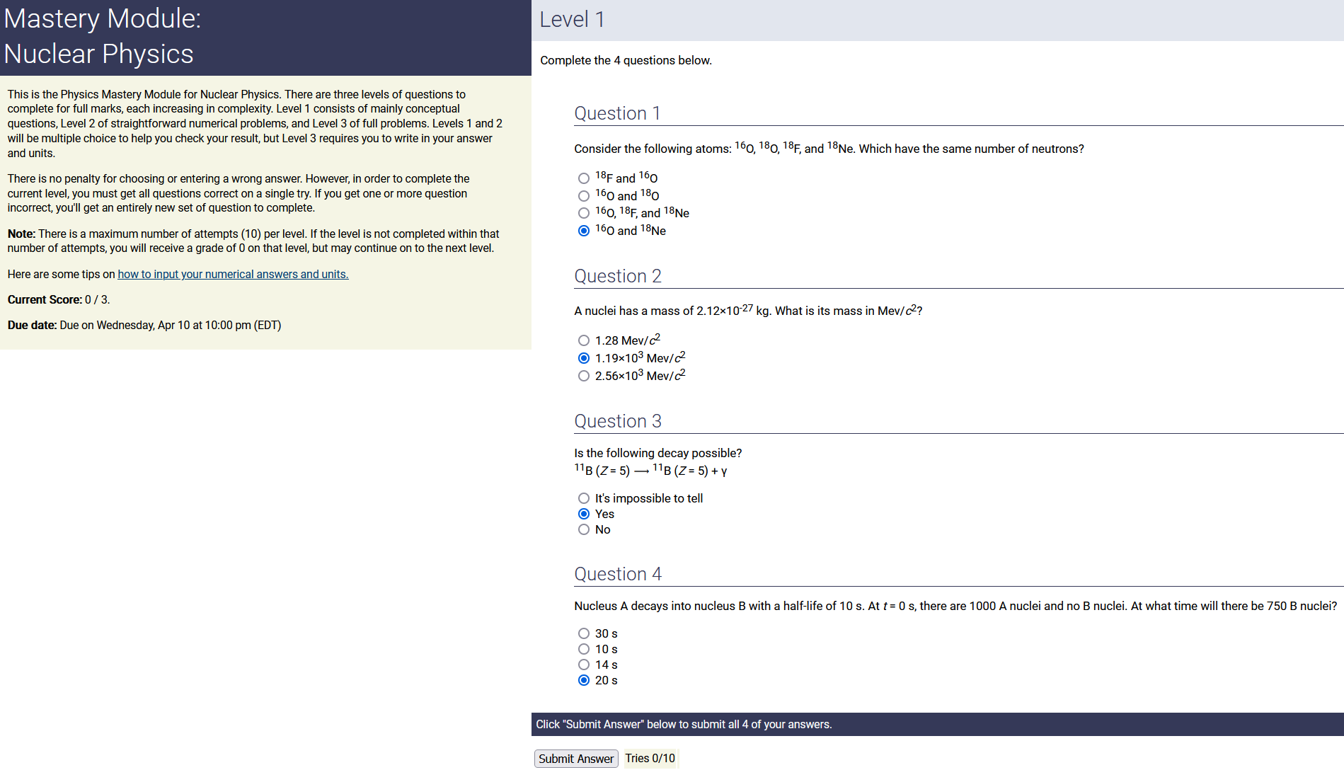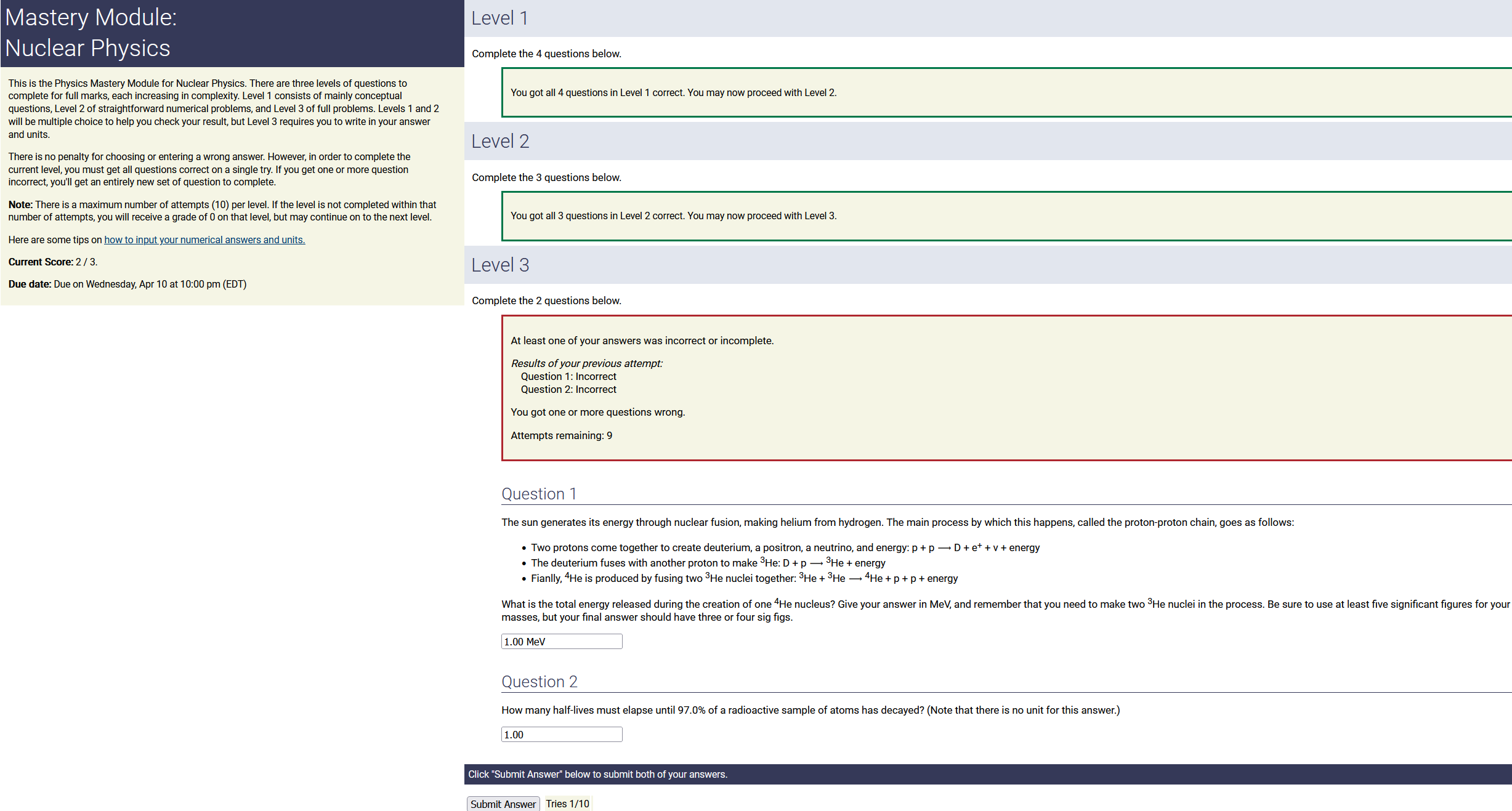 To make it clear how different questions can vary, I will labelling them based on the 2 ways they can change between attempts: 'Lim-Var' denotes questions with a limited number of variations (for example, if a formula has, say, 4 variables in it, and the question asks "what will happen to the answer if the variable __ is doubled in mangitude?", then this question will very likely have 4 'variations' total, which means this question can change the variable it's asking about in 4 different ways between attempts). 'Inf-Var' denotes questions with infinite variations (every single attempt of this question will have different numbers to go with it, and the numbers may be barely or very different). Note that a question can be both of these types at the same time. Also note that not every variation of a Lim-Var question will be available.