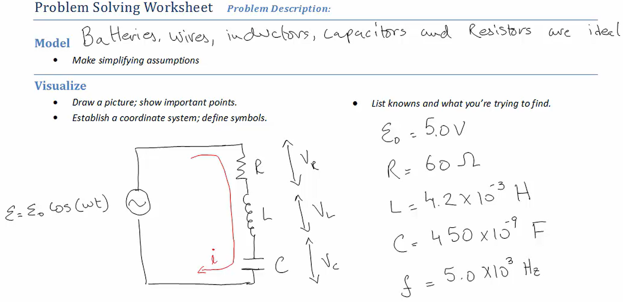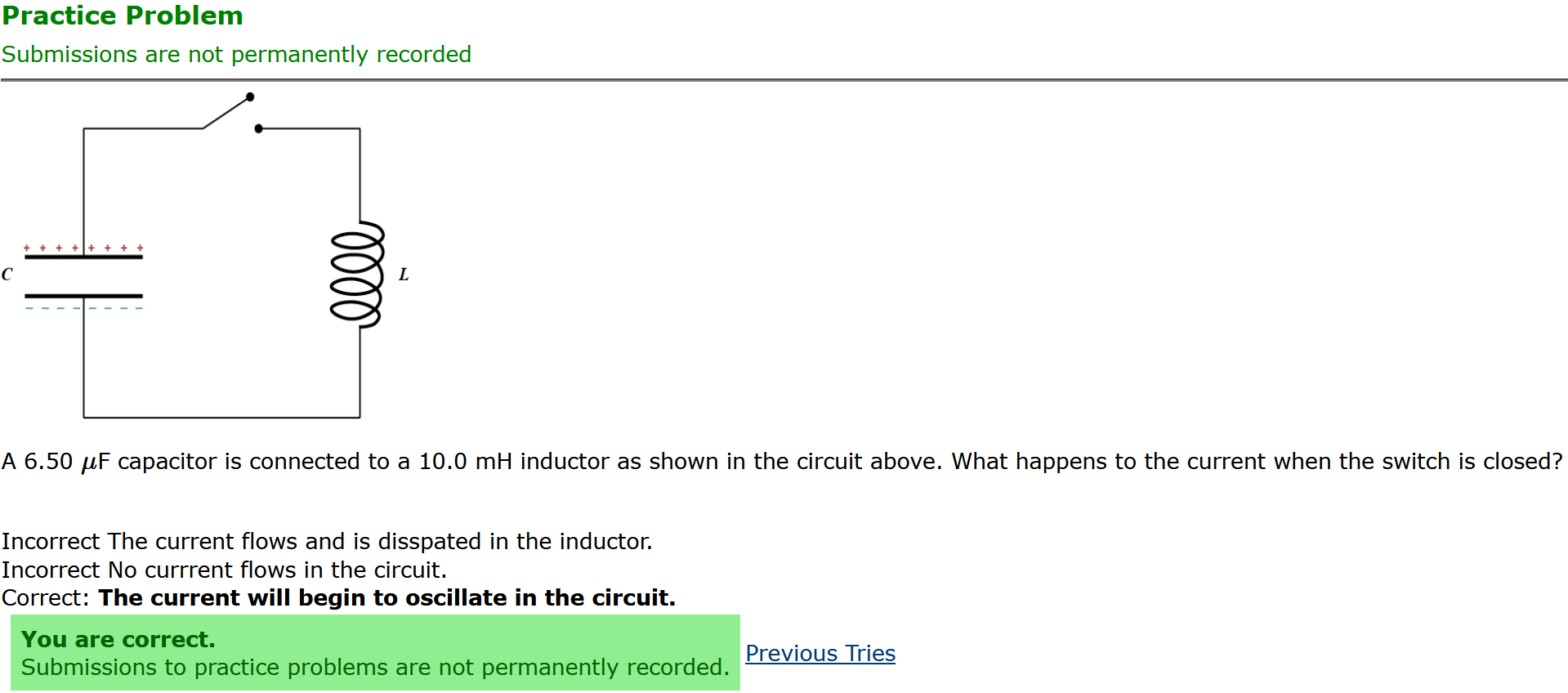 Question Transcription: A 6.50 uF capacitor is connected to a 10.0 mH inductor as shown in the circuit above. What happens to the current when the switch is closed?