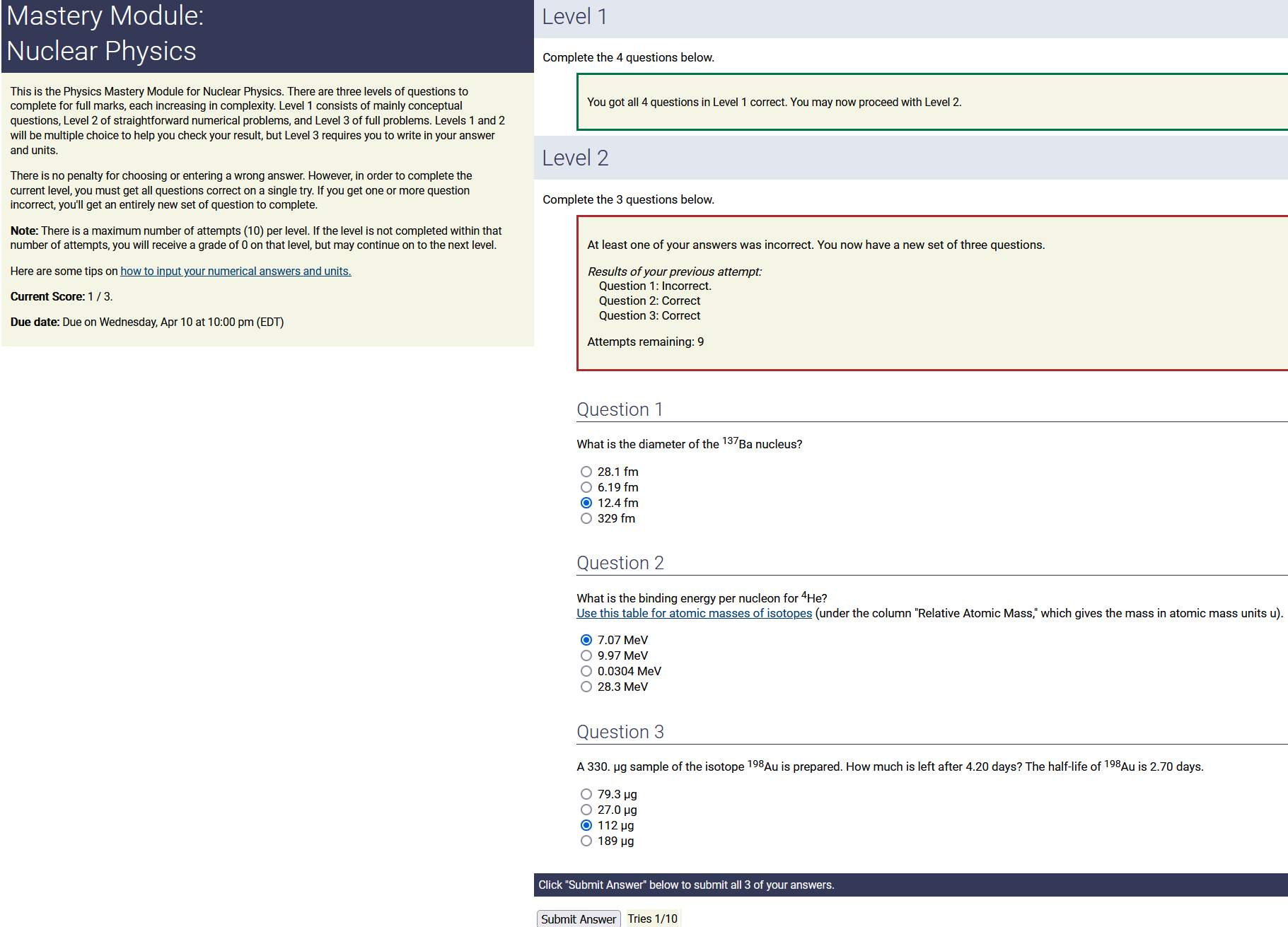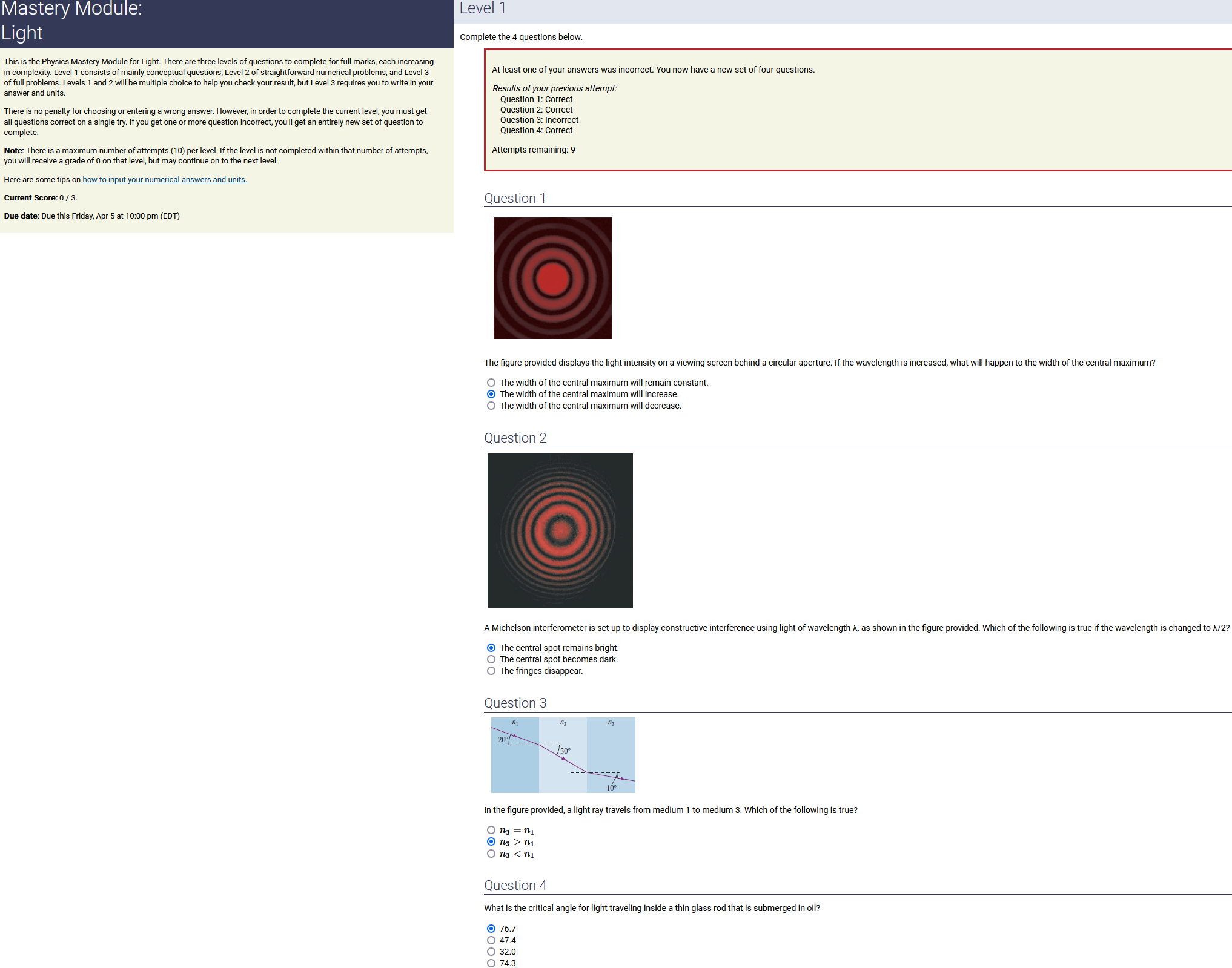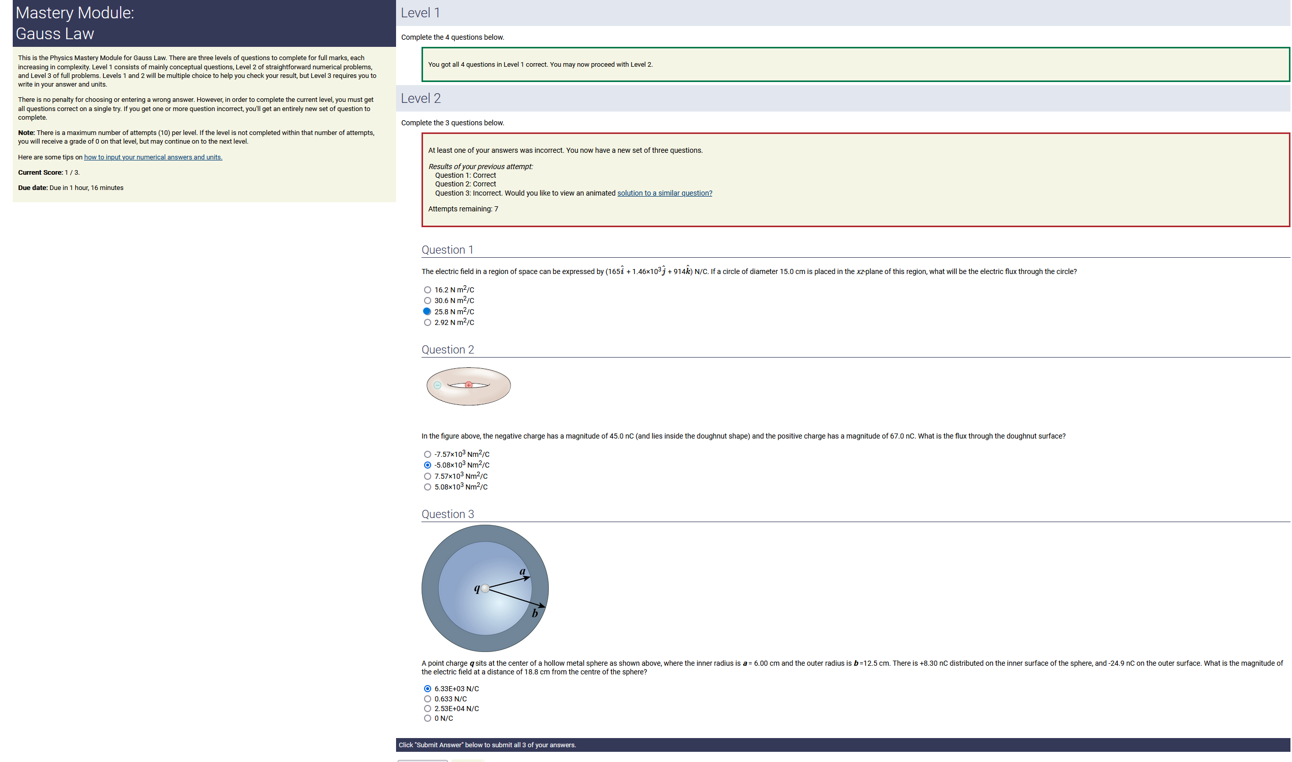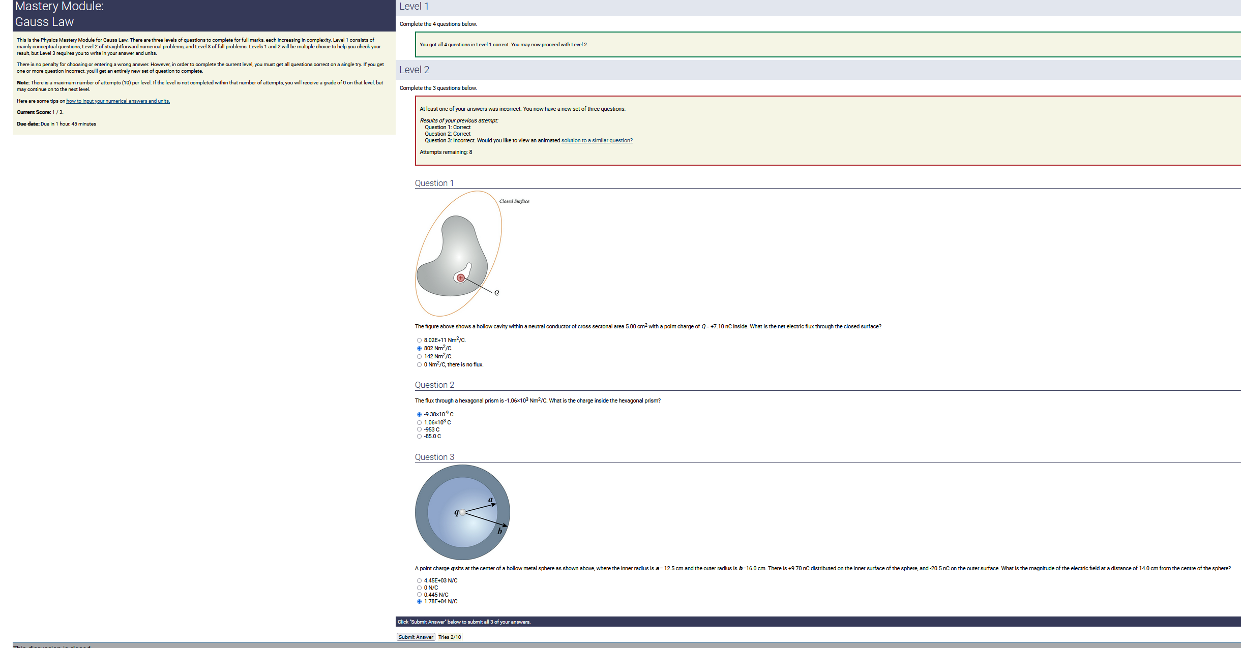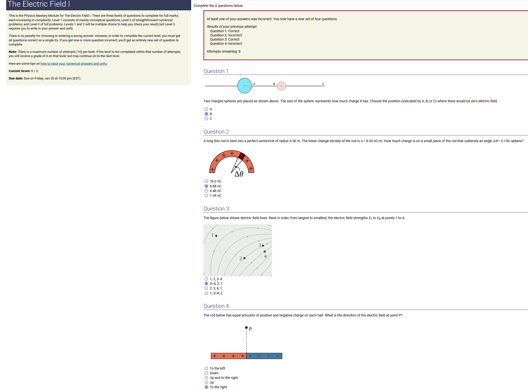 8.70 m, 8.60 nC/m, 0.170 radians: 12.7 nC (2nd-biggest number) (wrong: 74.8, 5.81, 1.46)