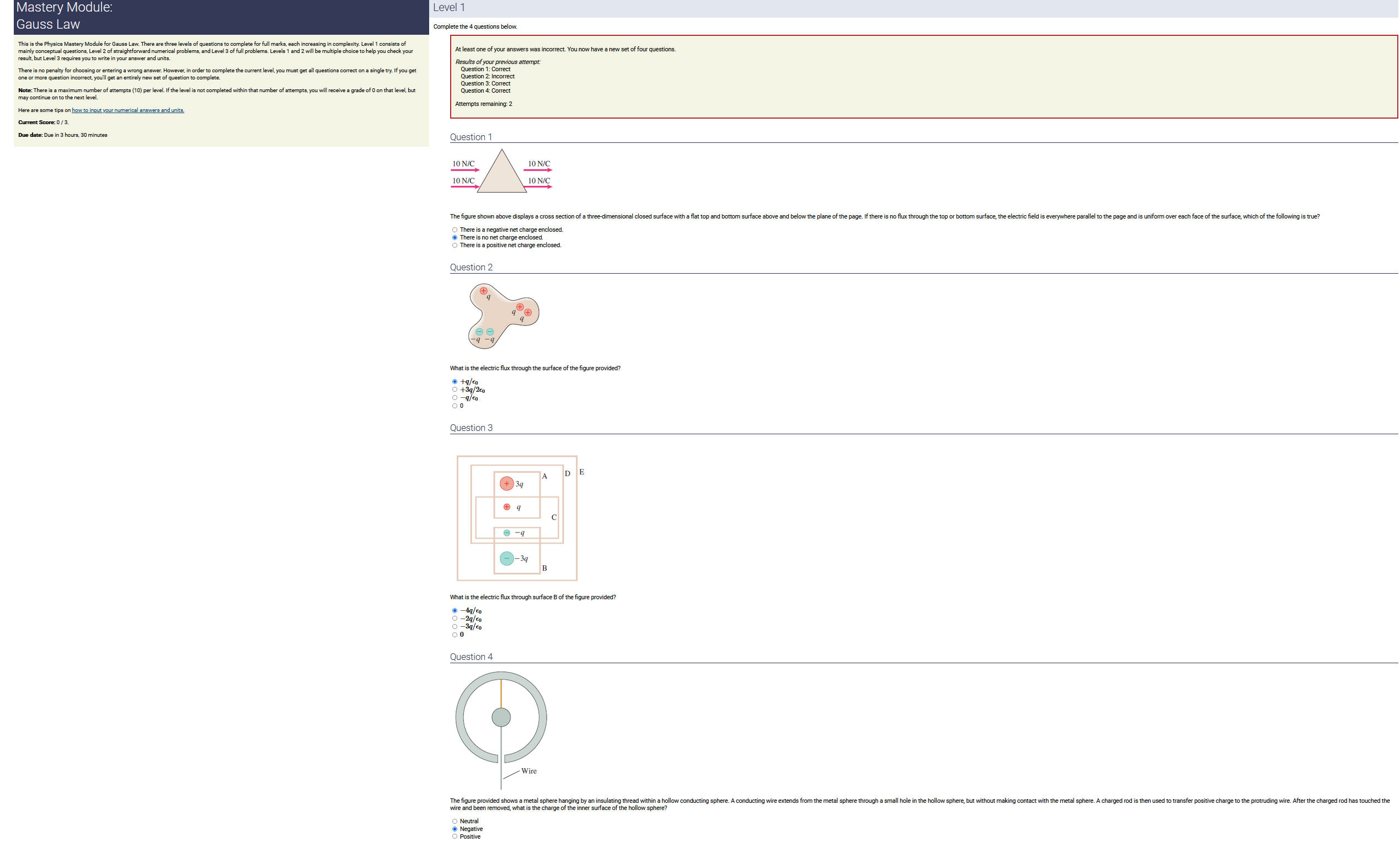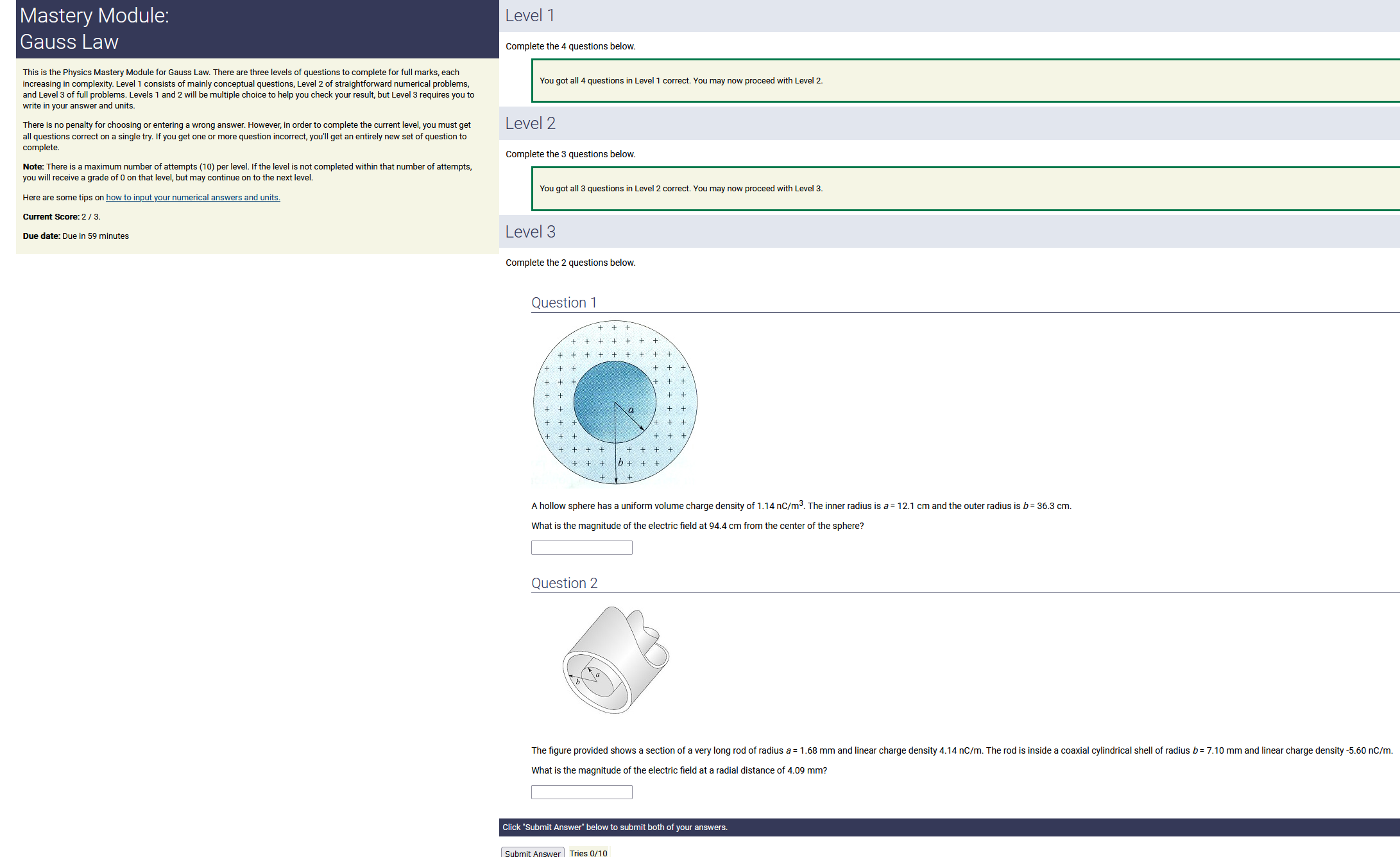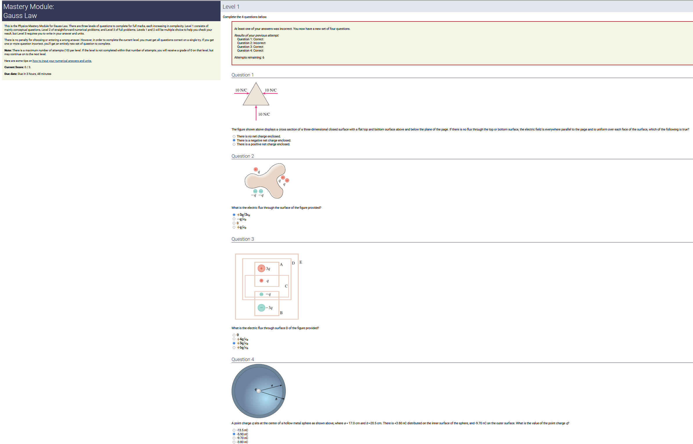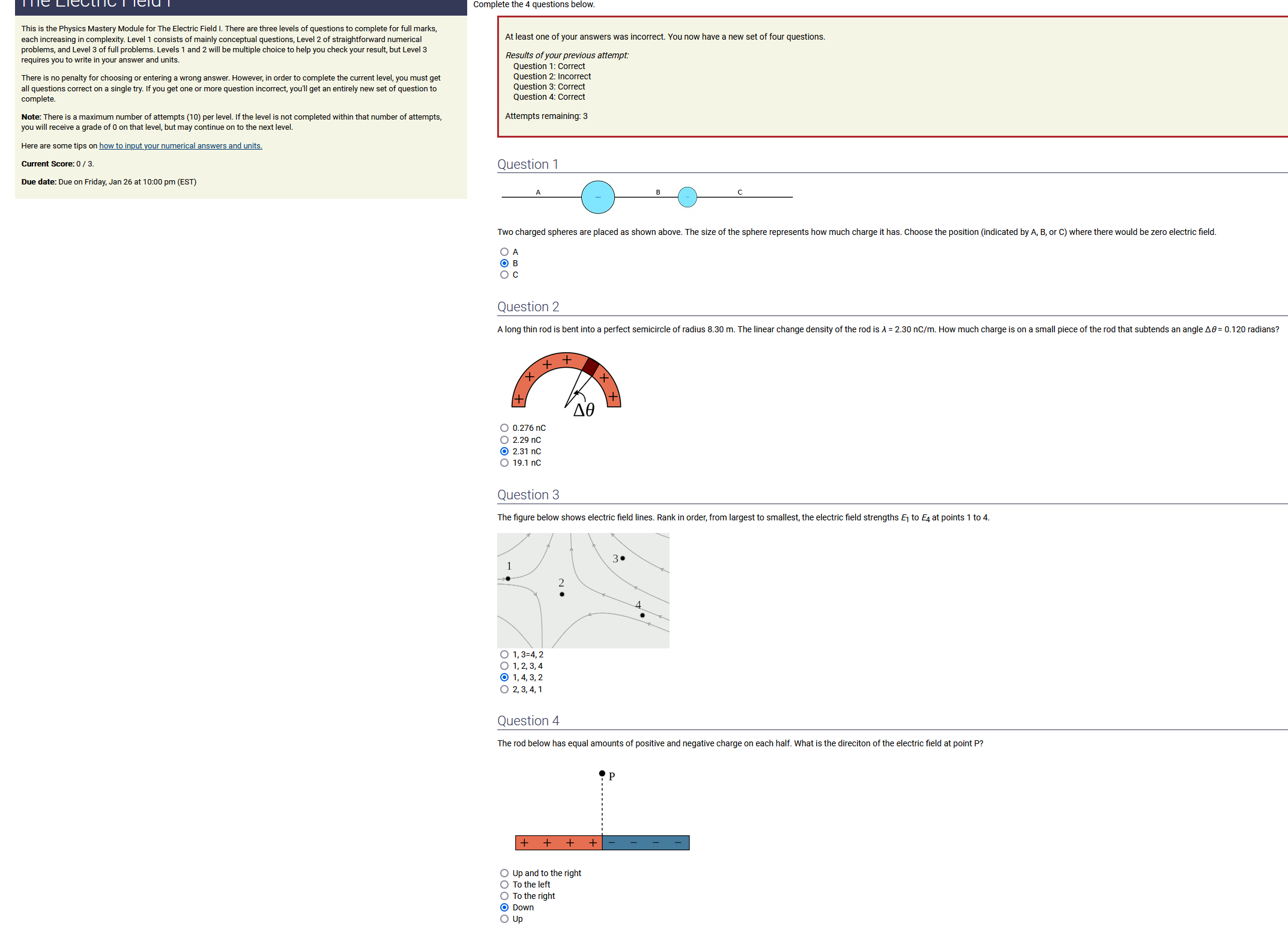 3.90 m, 2.50 nC/m, 0.200 radians: 1.95 nC (2nd-smallest number) (wrong: 9.75, 3.21, 0.500)