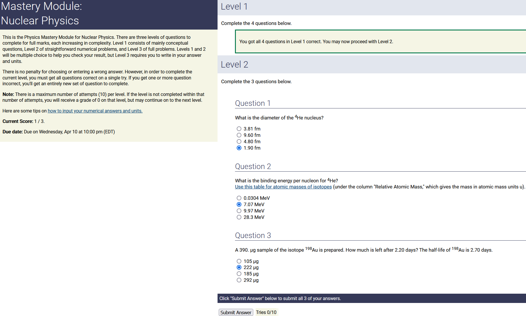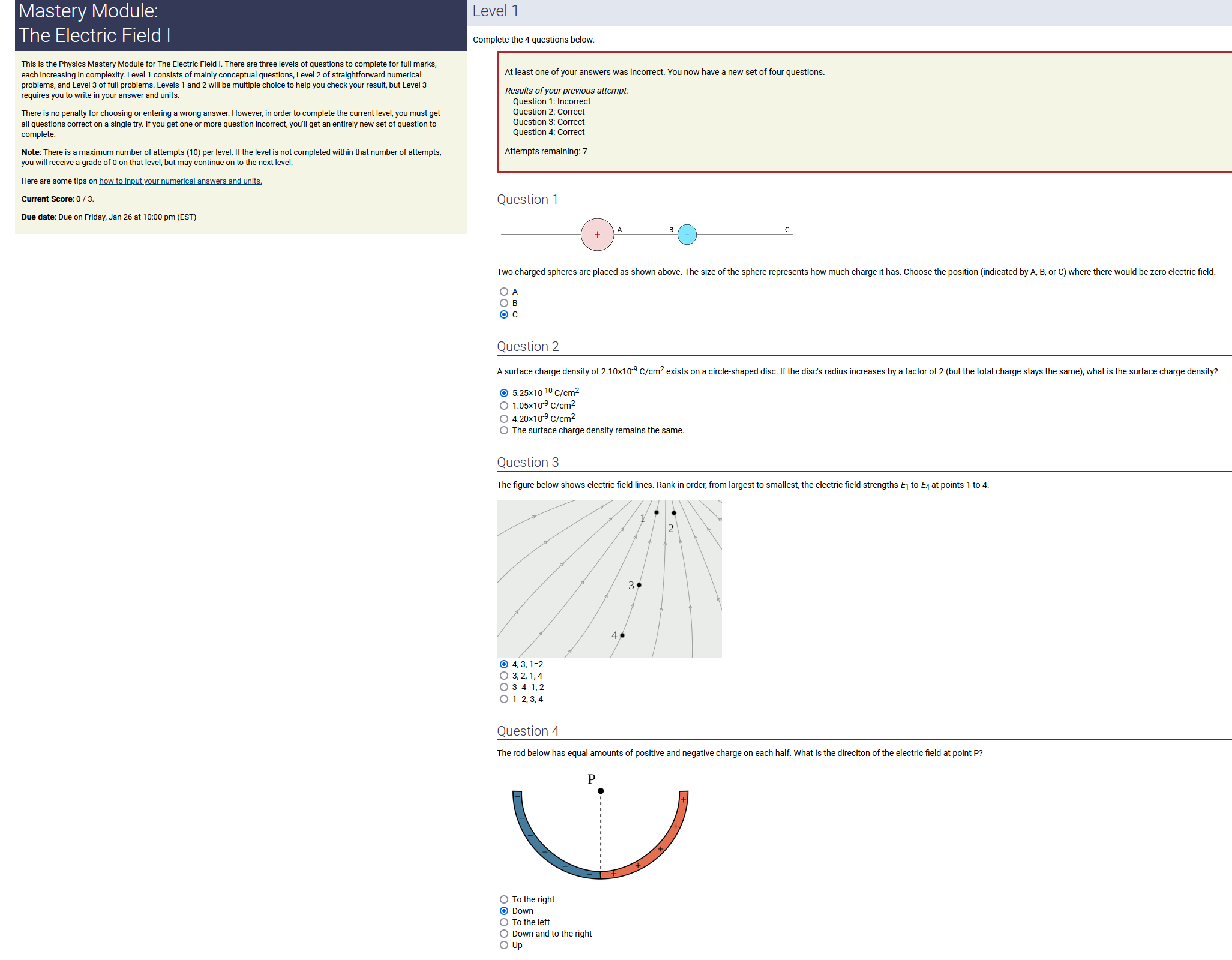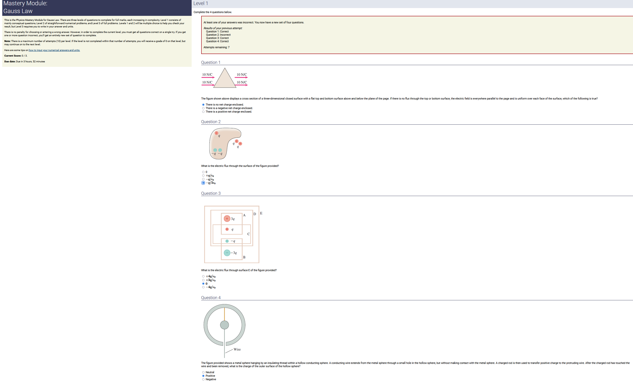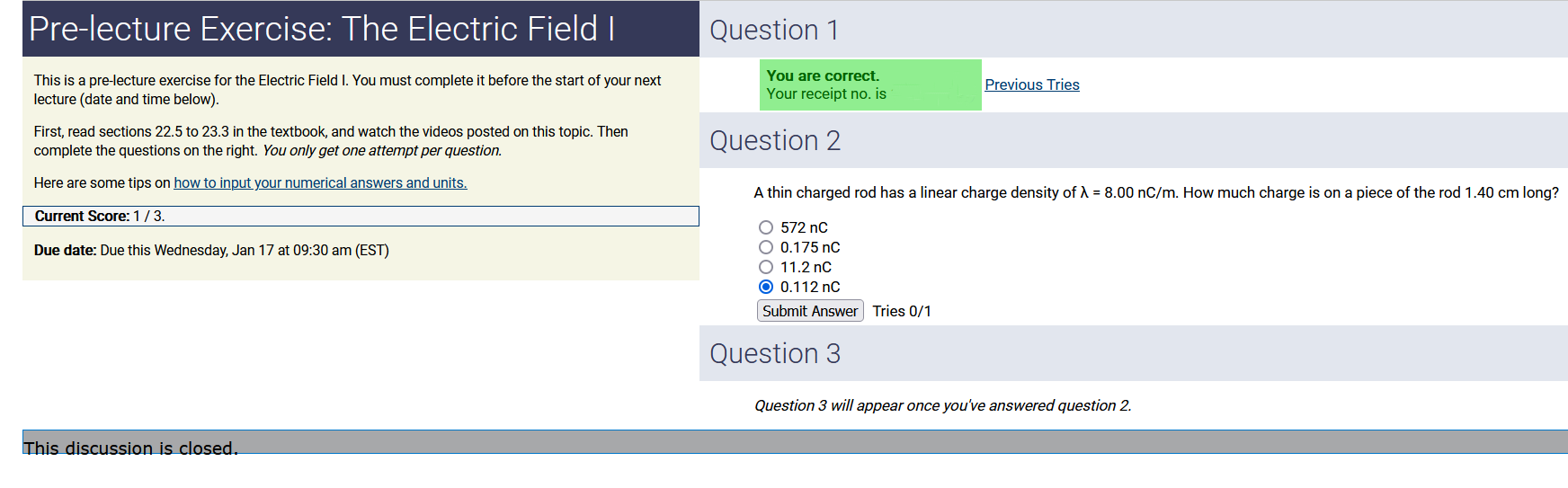 3.90 m, 2.50 nC/m, 0.200 radians: 1.95 nC (2nd-smallest number) (wrong: 9.75, 3.21, 0.500)