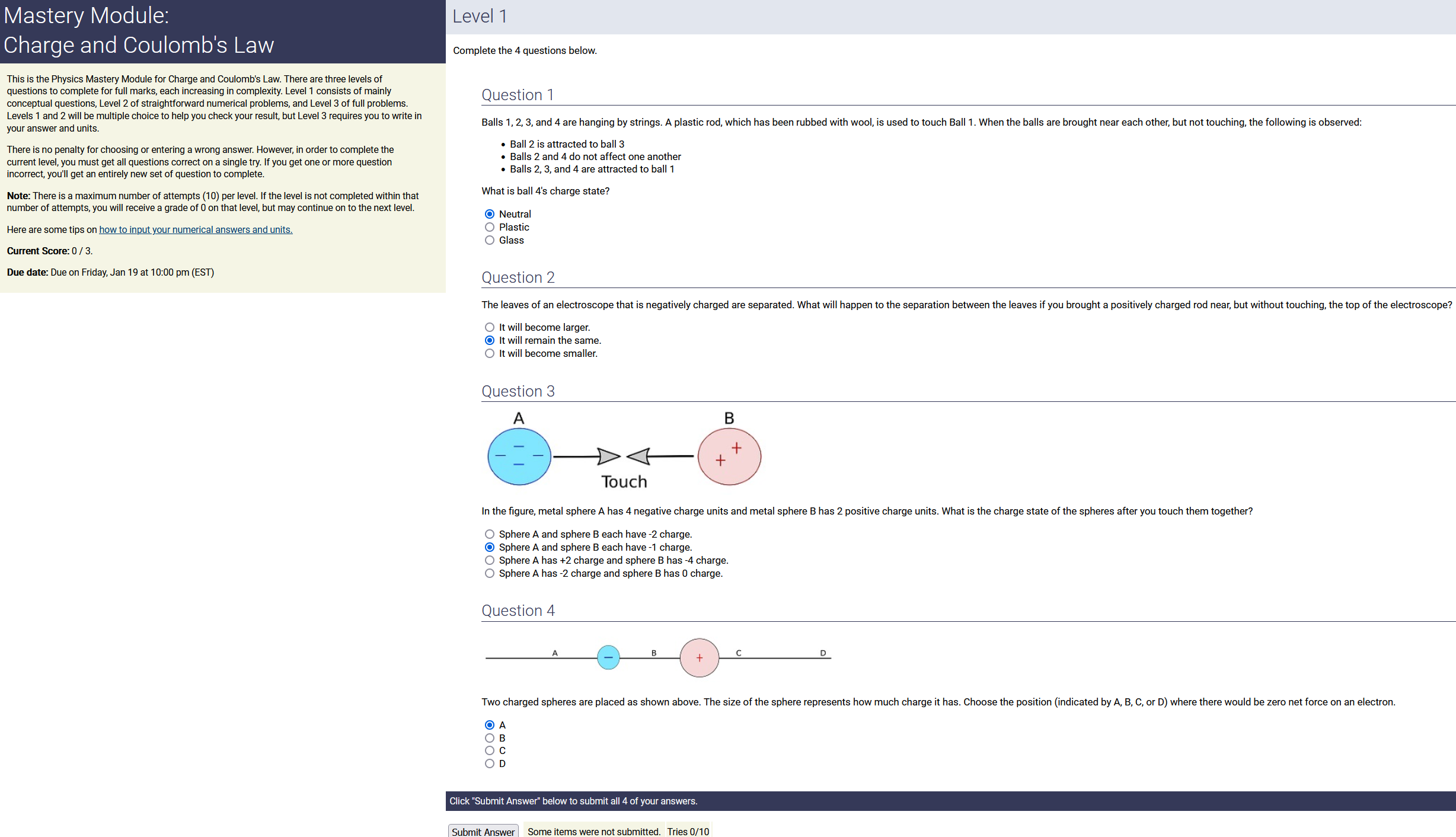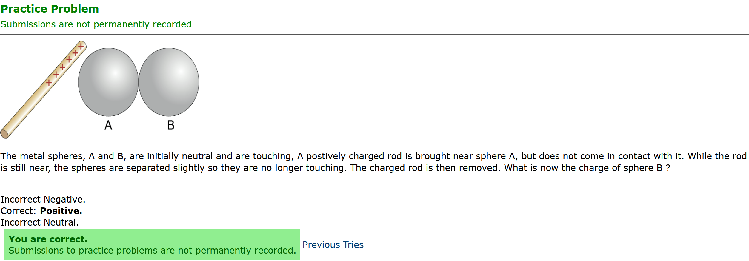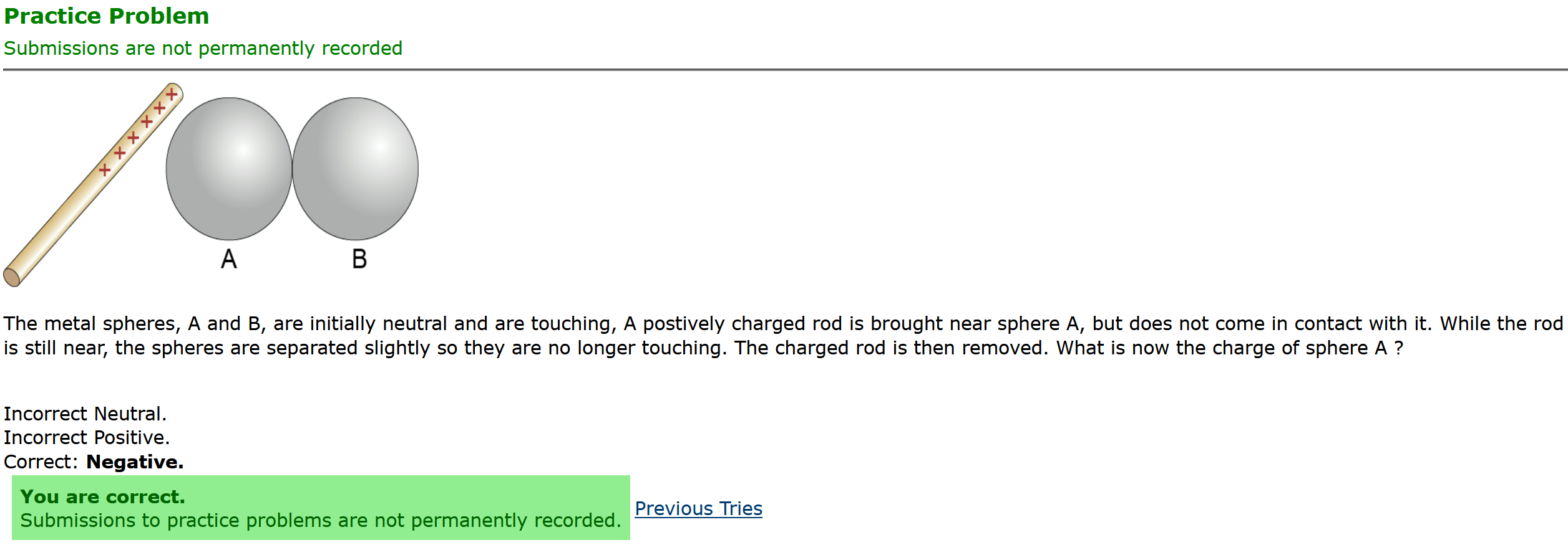 Question Transcription: The metal spheres, A and B, are initially neutral and are touching, A positively charged rod is brought near sphere A, but does not come in contact with it. While the rod is still near, the spheres are separated slightly so they are no longer touching. The charged rod is then removed. What is now the charge of sphere A ?
