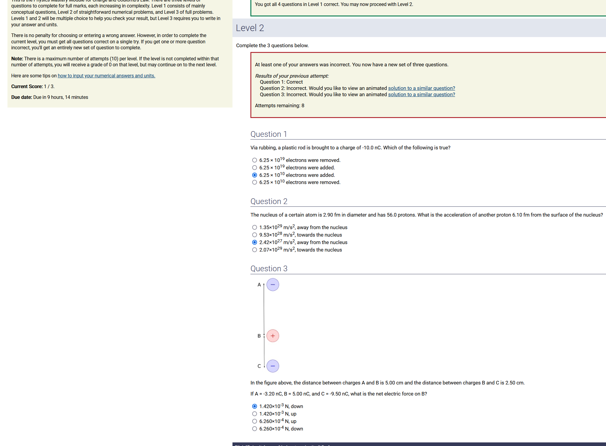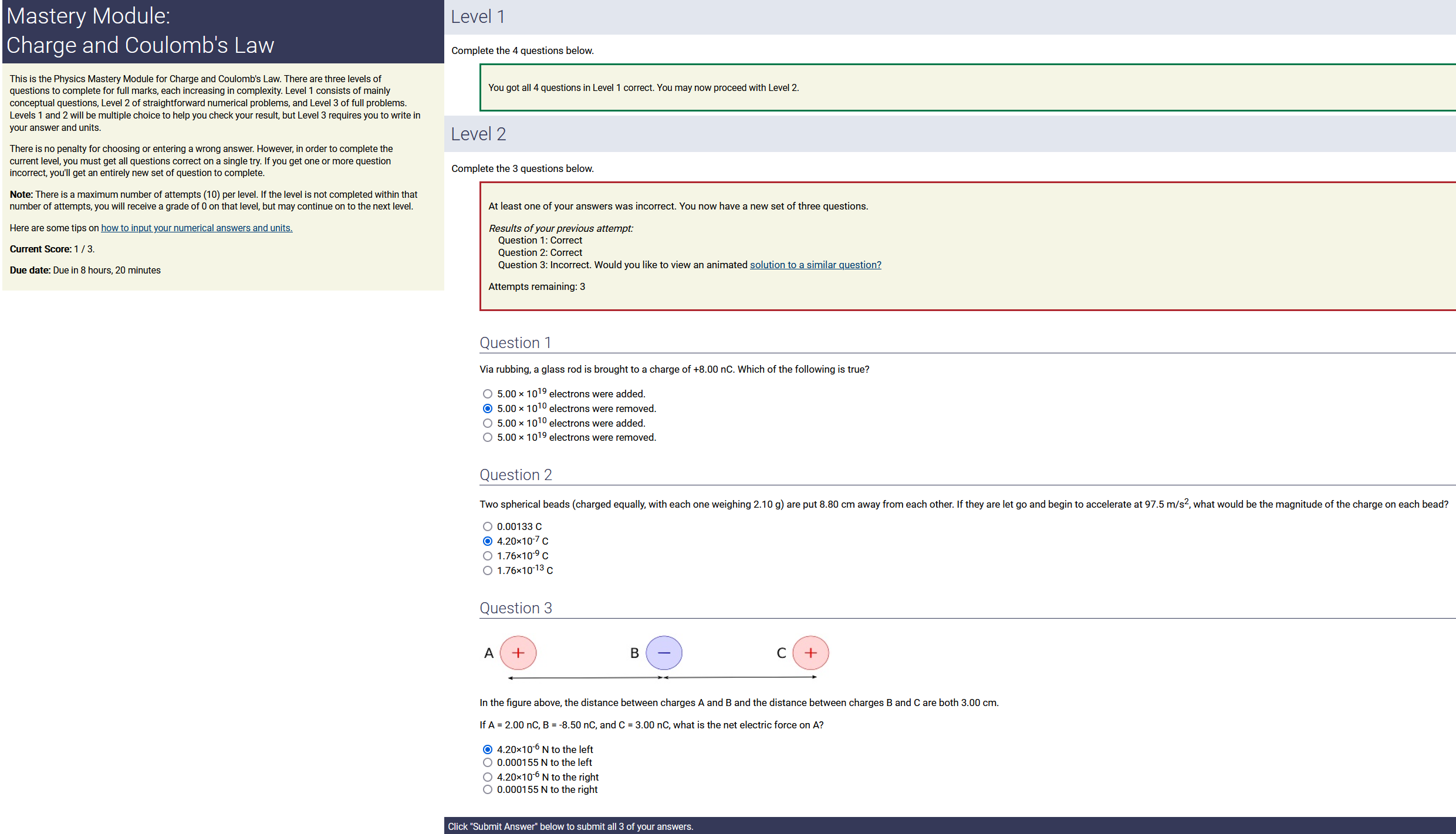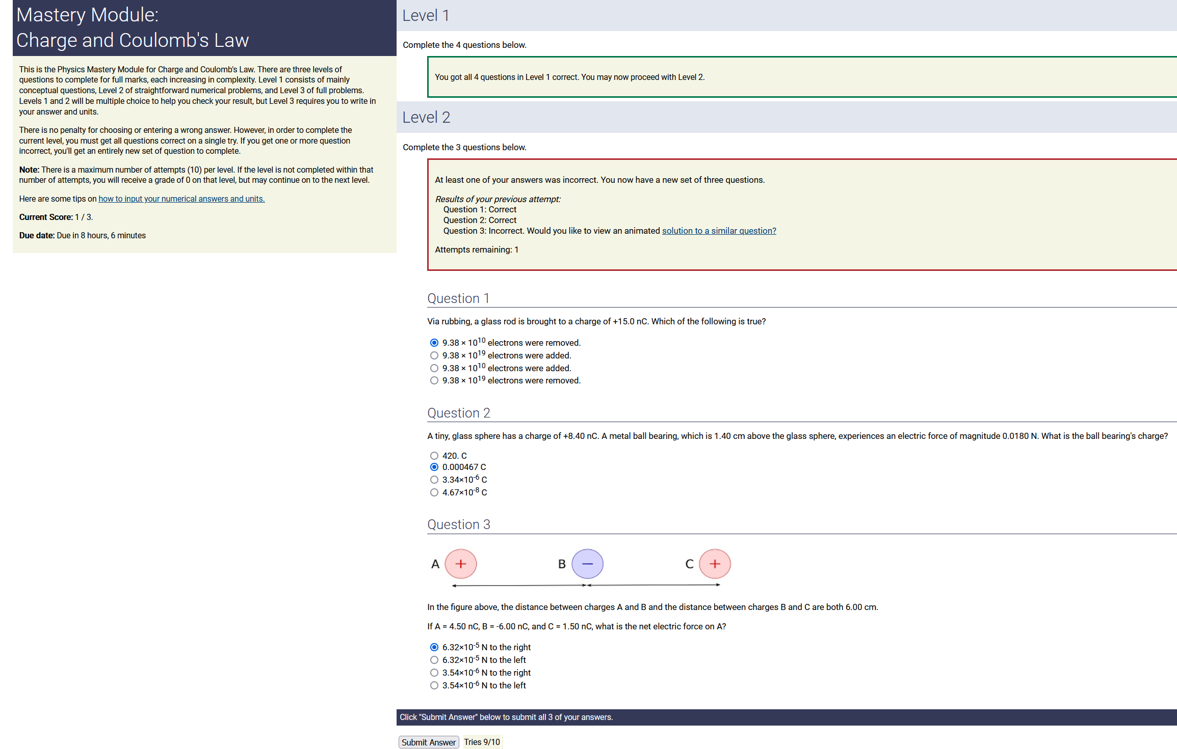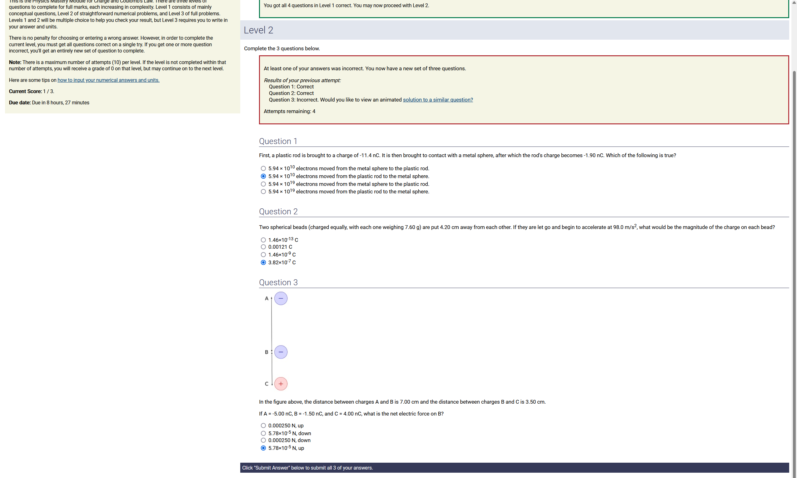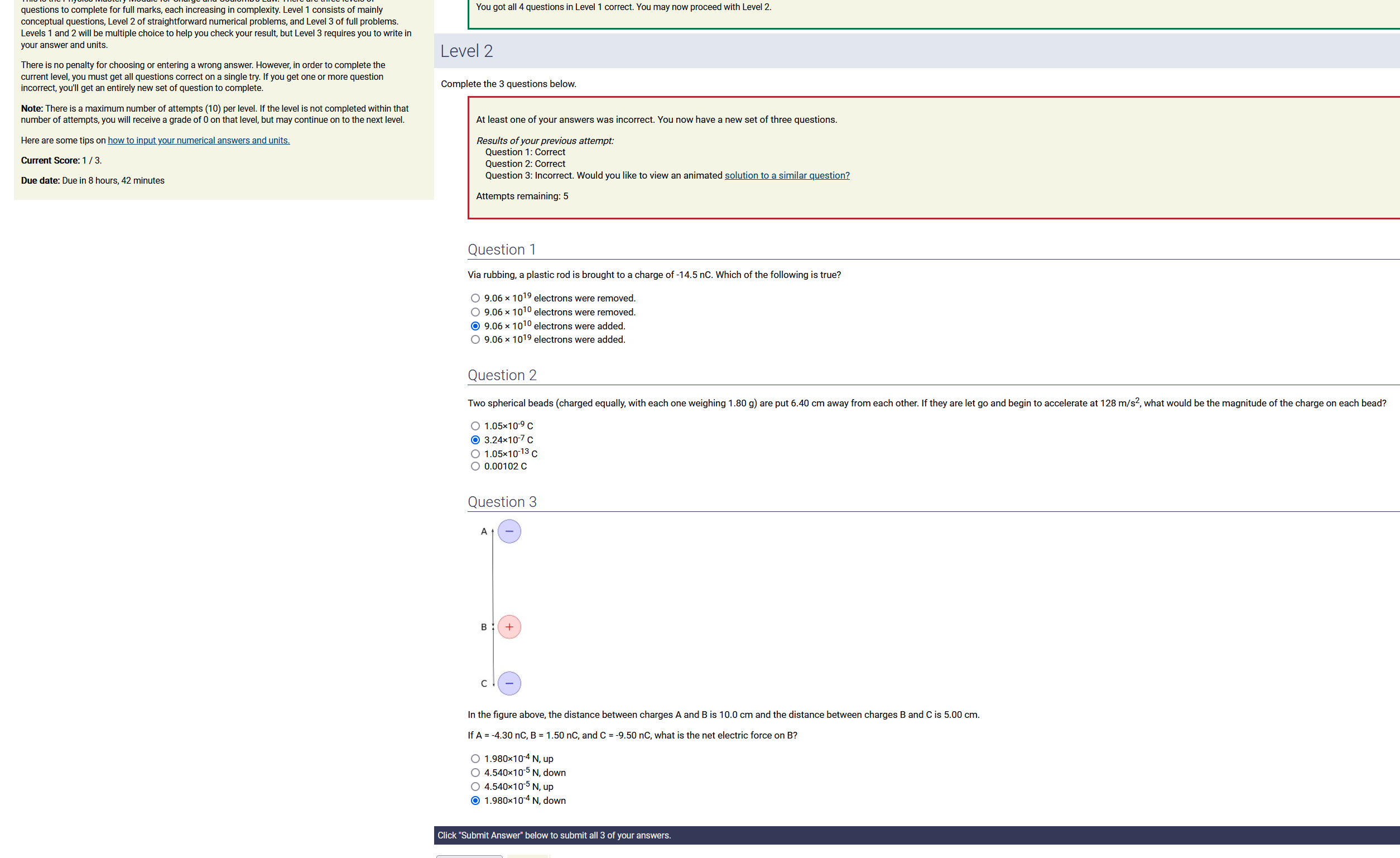 Question Transcription: In the figure above, the distance between charges A and B and the distance between charges B and C are both 1.00 cm. If A = 4.50 nC, B = -6.00 nC, and C = 1.00 nC, what is the net electric force on A?