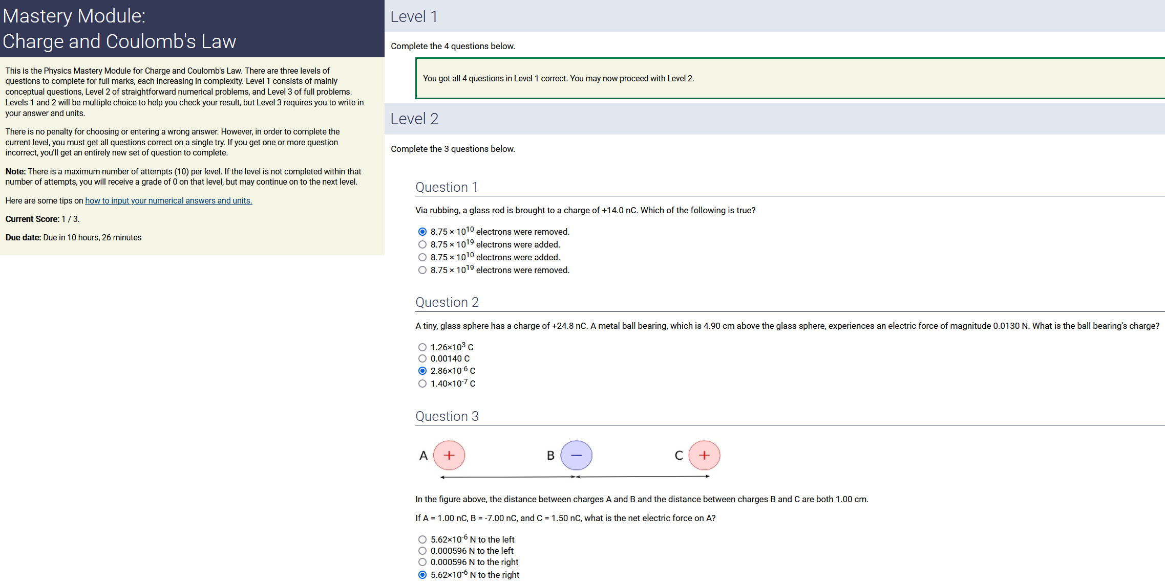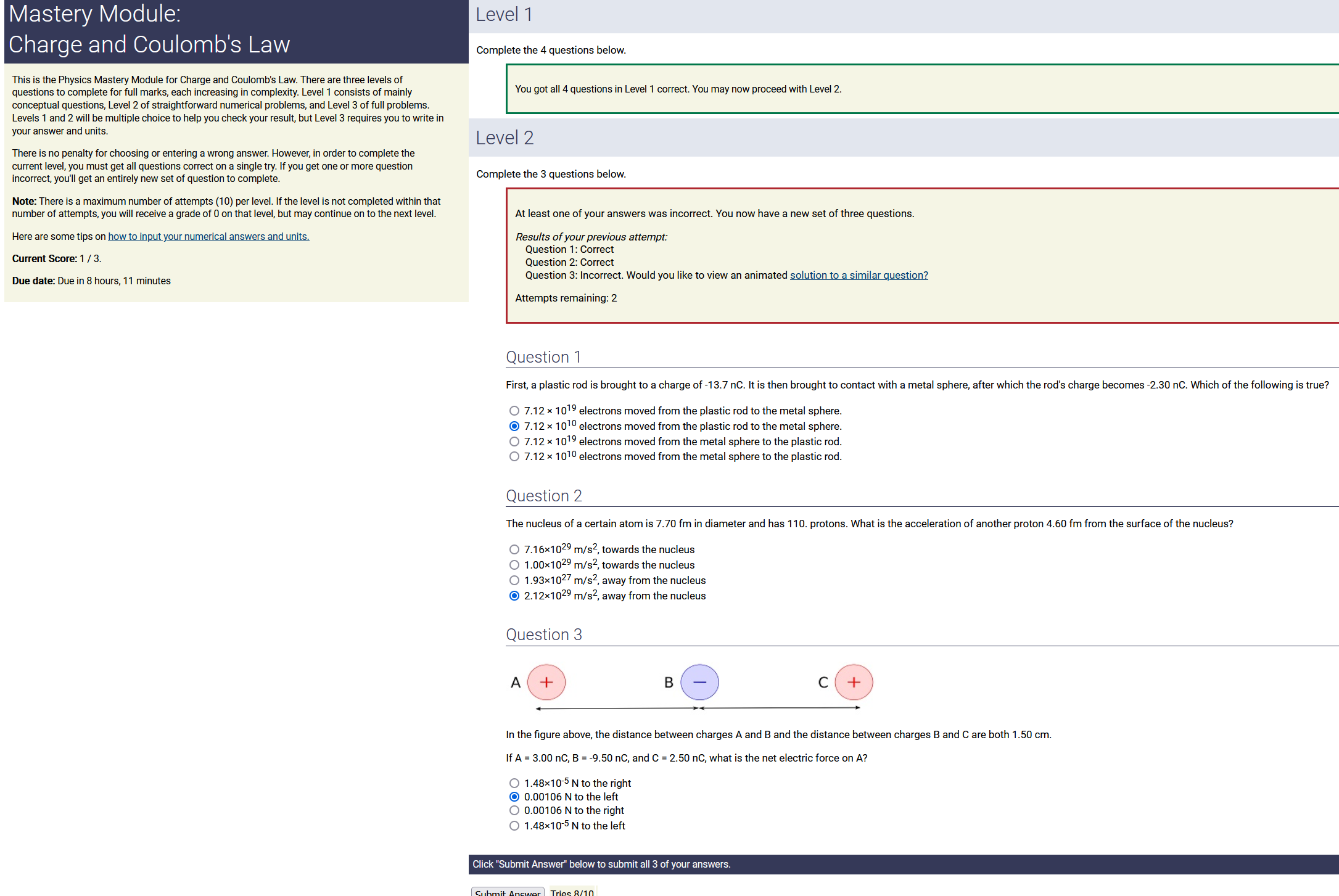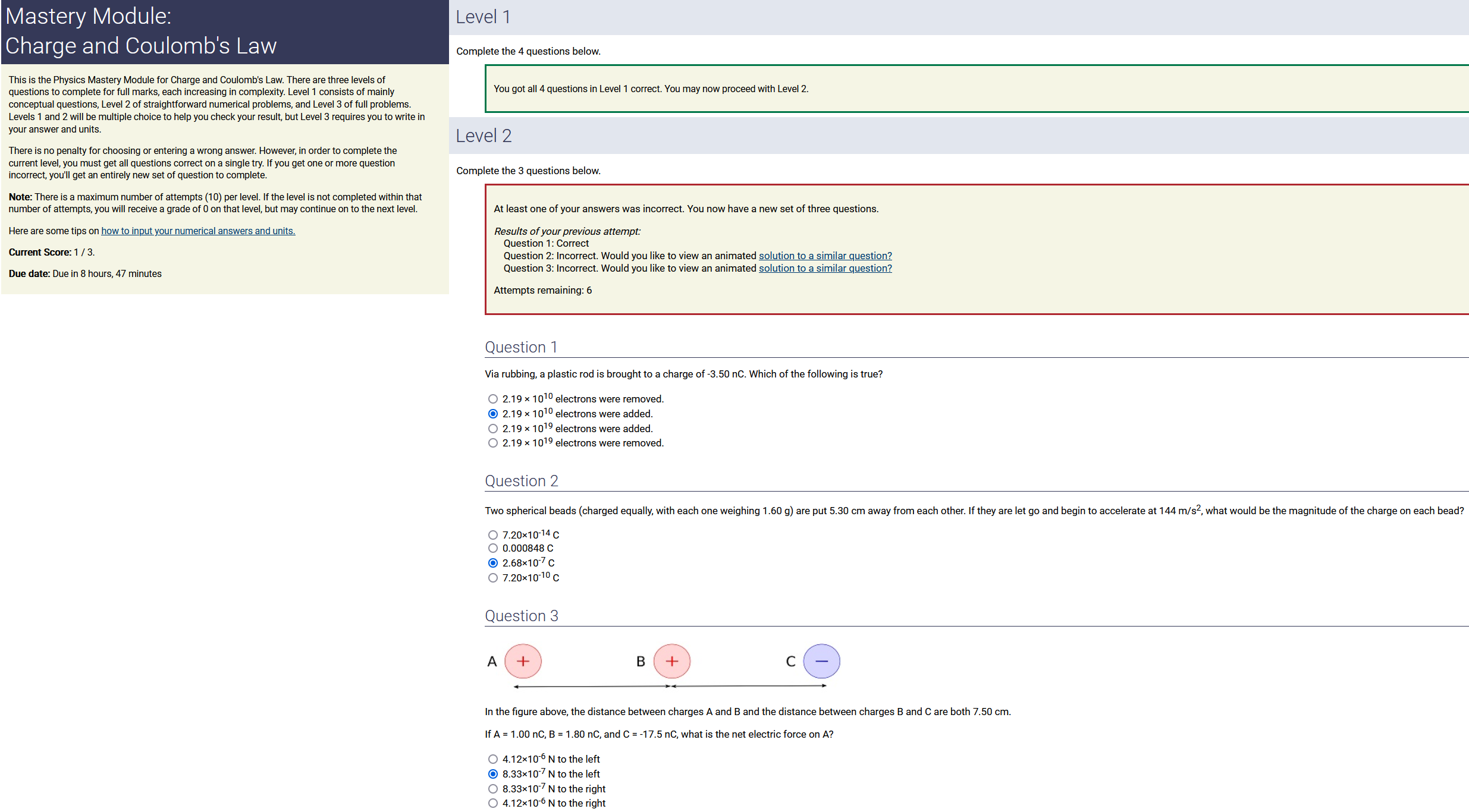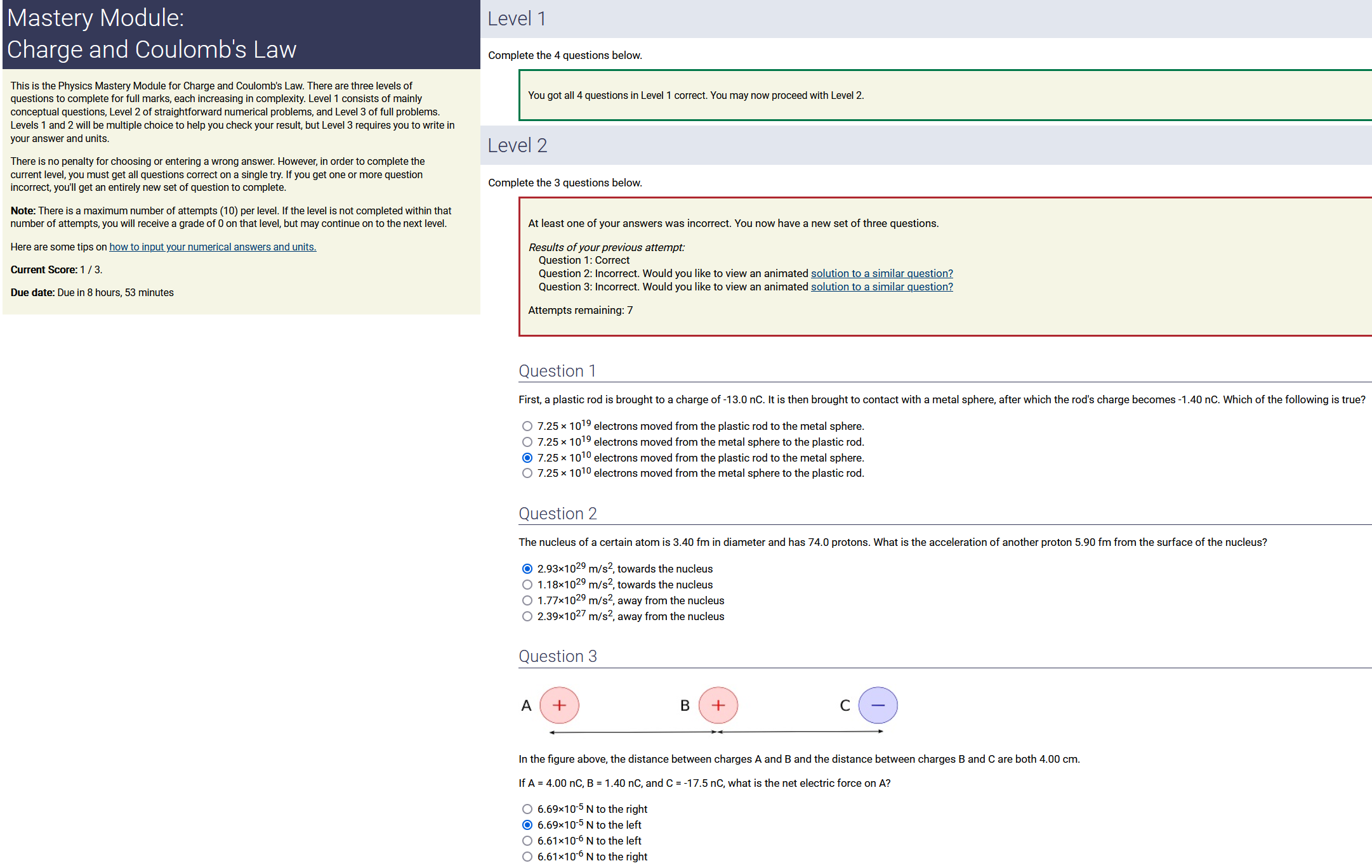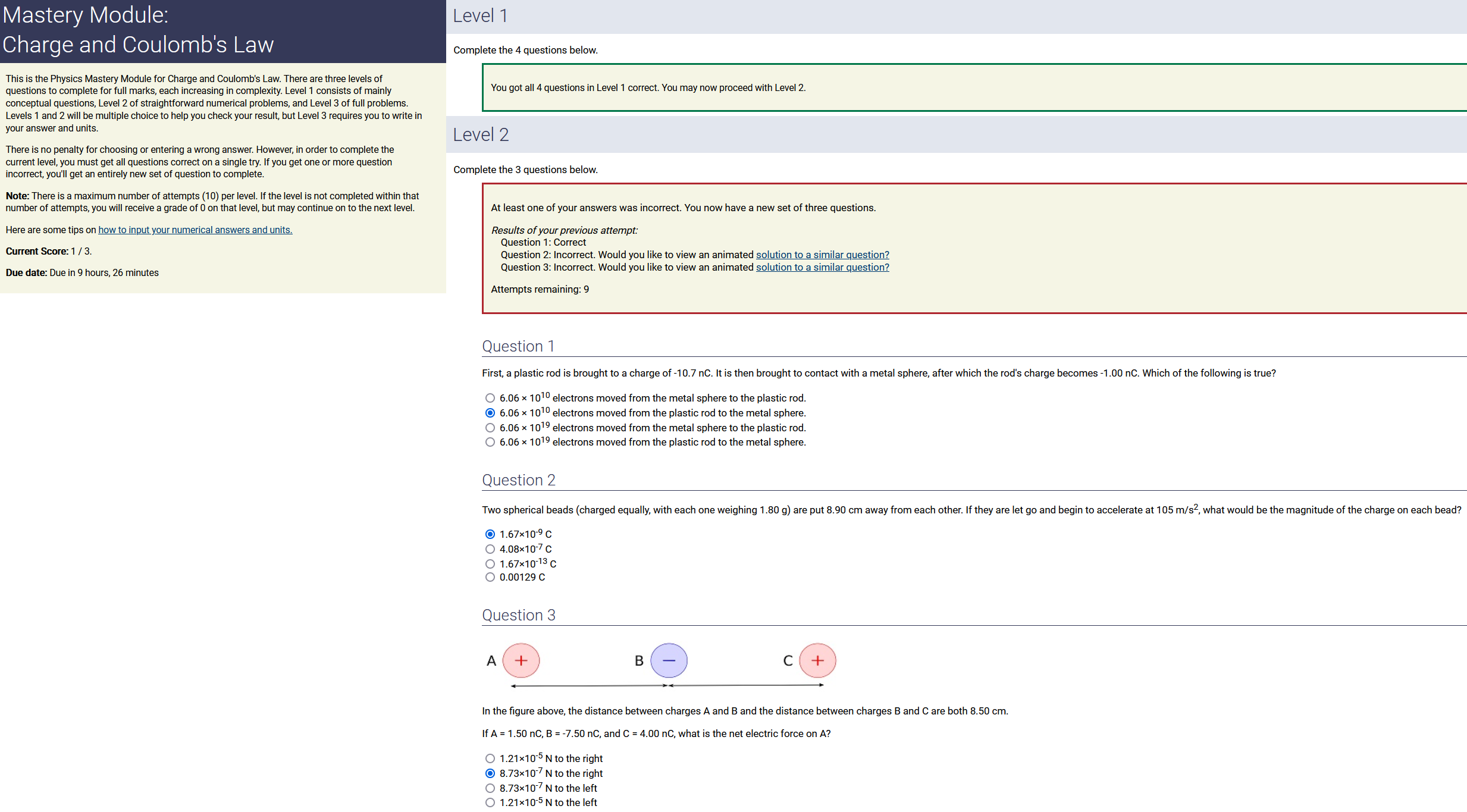 Question Transcription: In the figure above, the distance between charges A and B and the distance between charges B and C are both 1.00 cm. If A = 4.50 nC, B = -6.00 nC, and C = 1.00 nC, what is the net electric force on A?