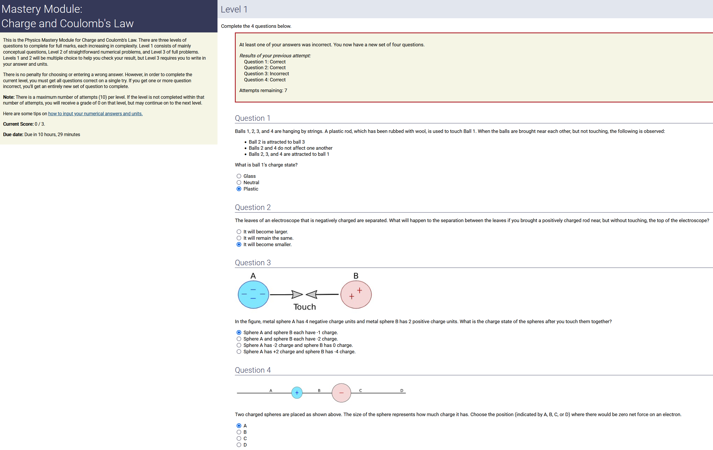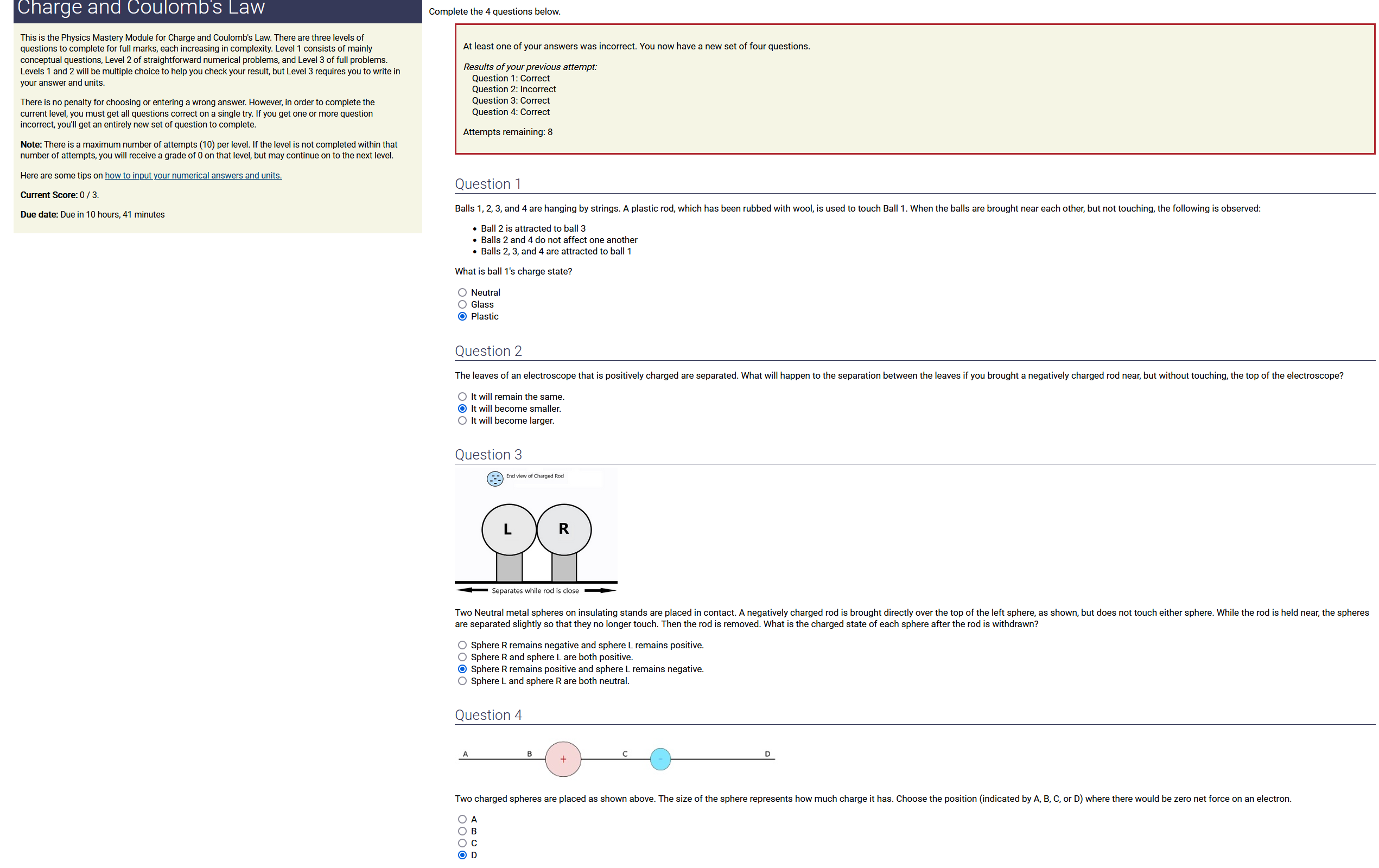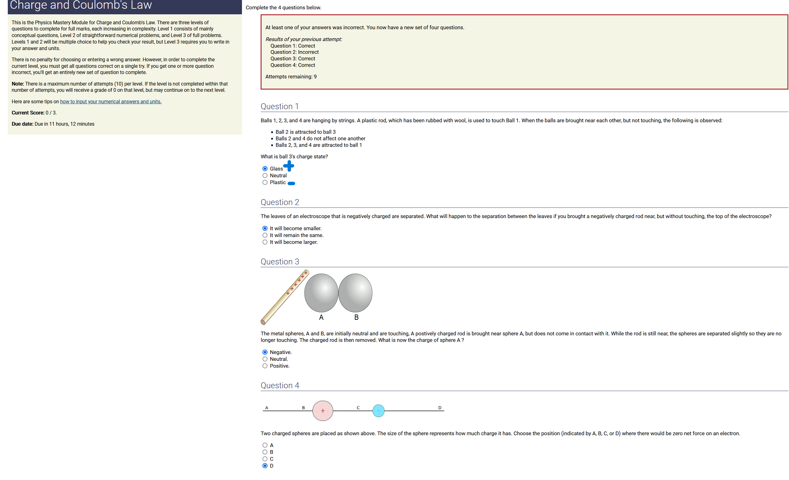 Question Transcription: Two charged spheres are placed as shown above. The size of the sphere represents how much charge it has. Choose the position (indicated by A, B, C, or D) where there would be zero net force on an electron.