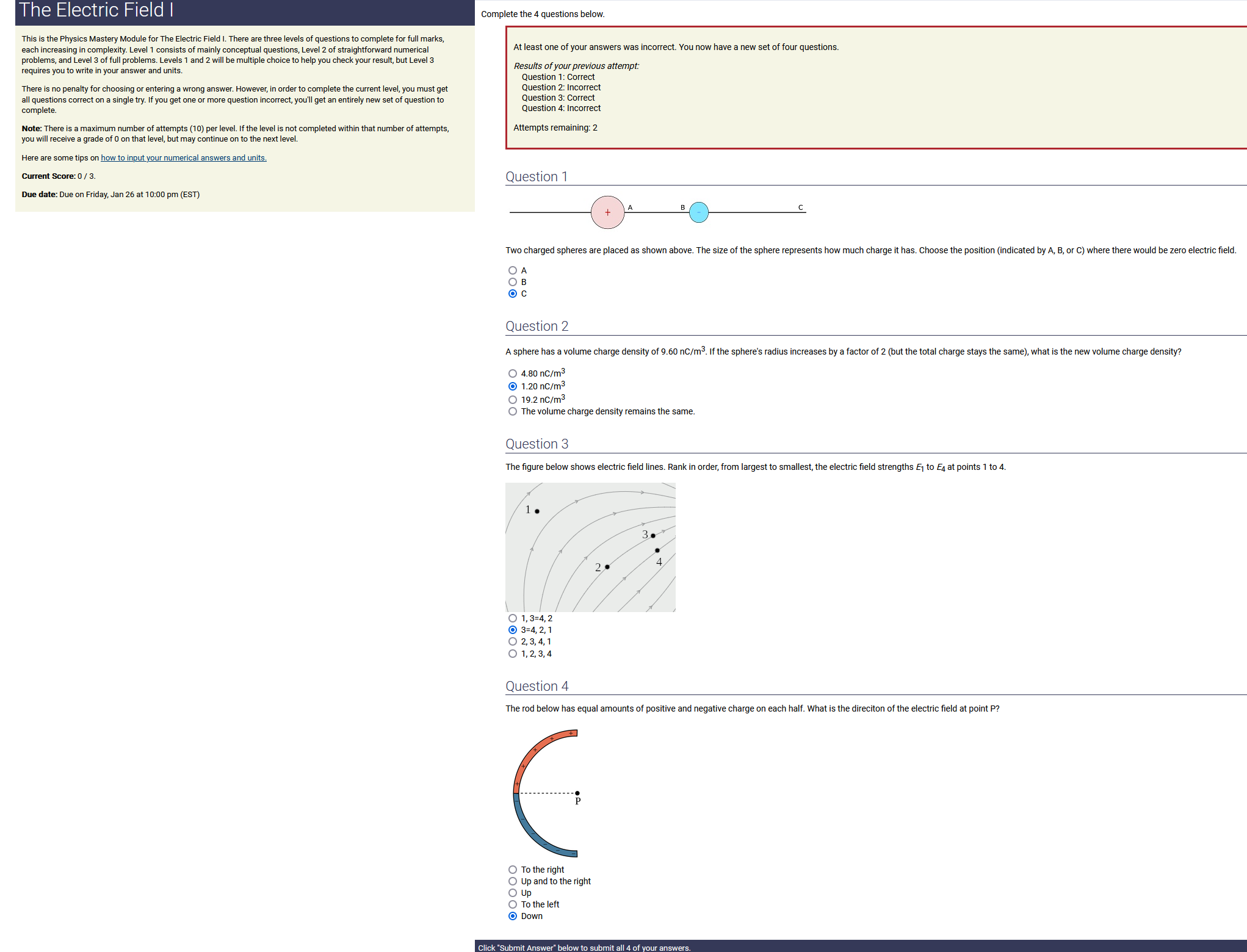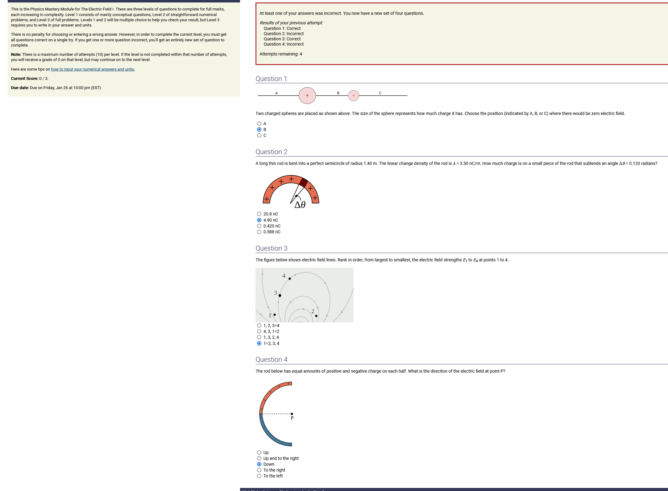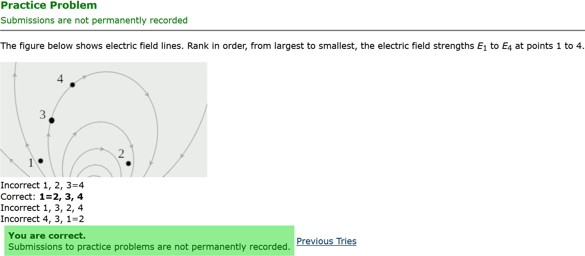 Question Transcription: The figure below shows electric field lines. Rank in order, from largest to smallest, the electric field strengths E_1 to E_4 at points 1 to 4.