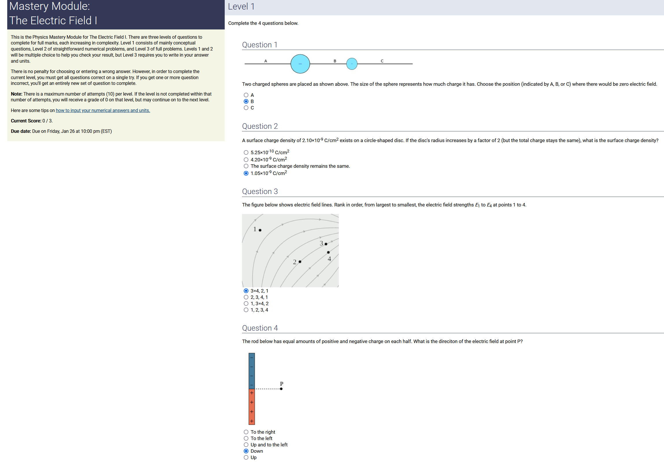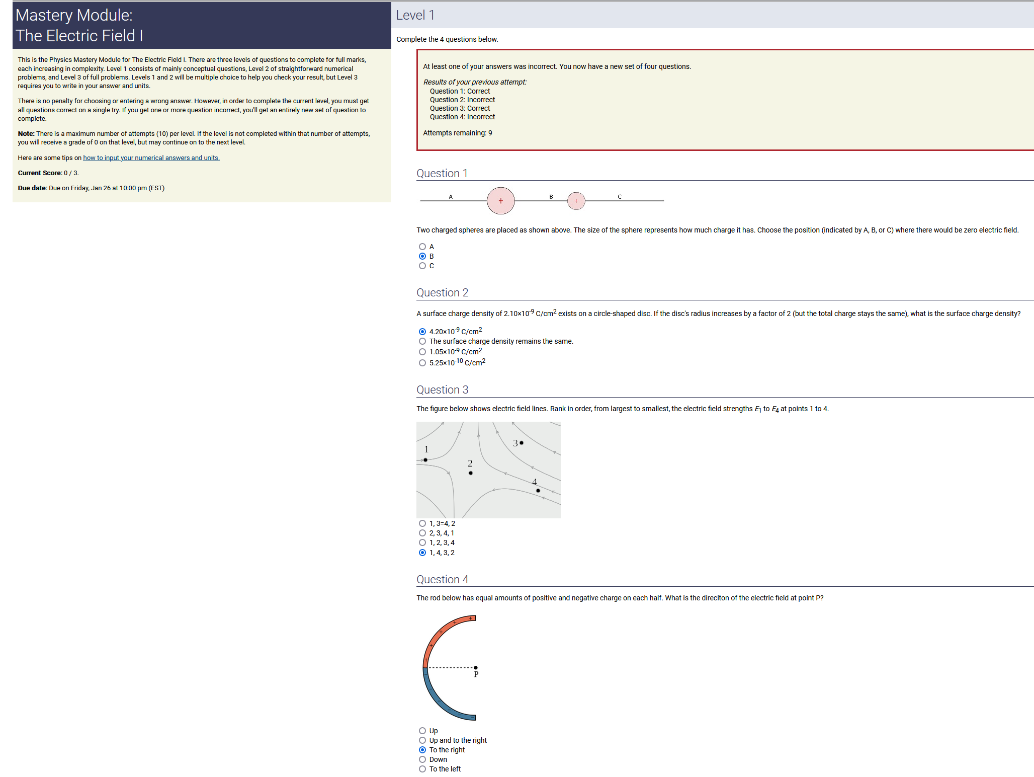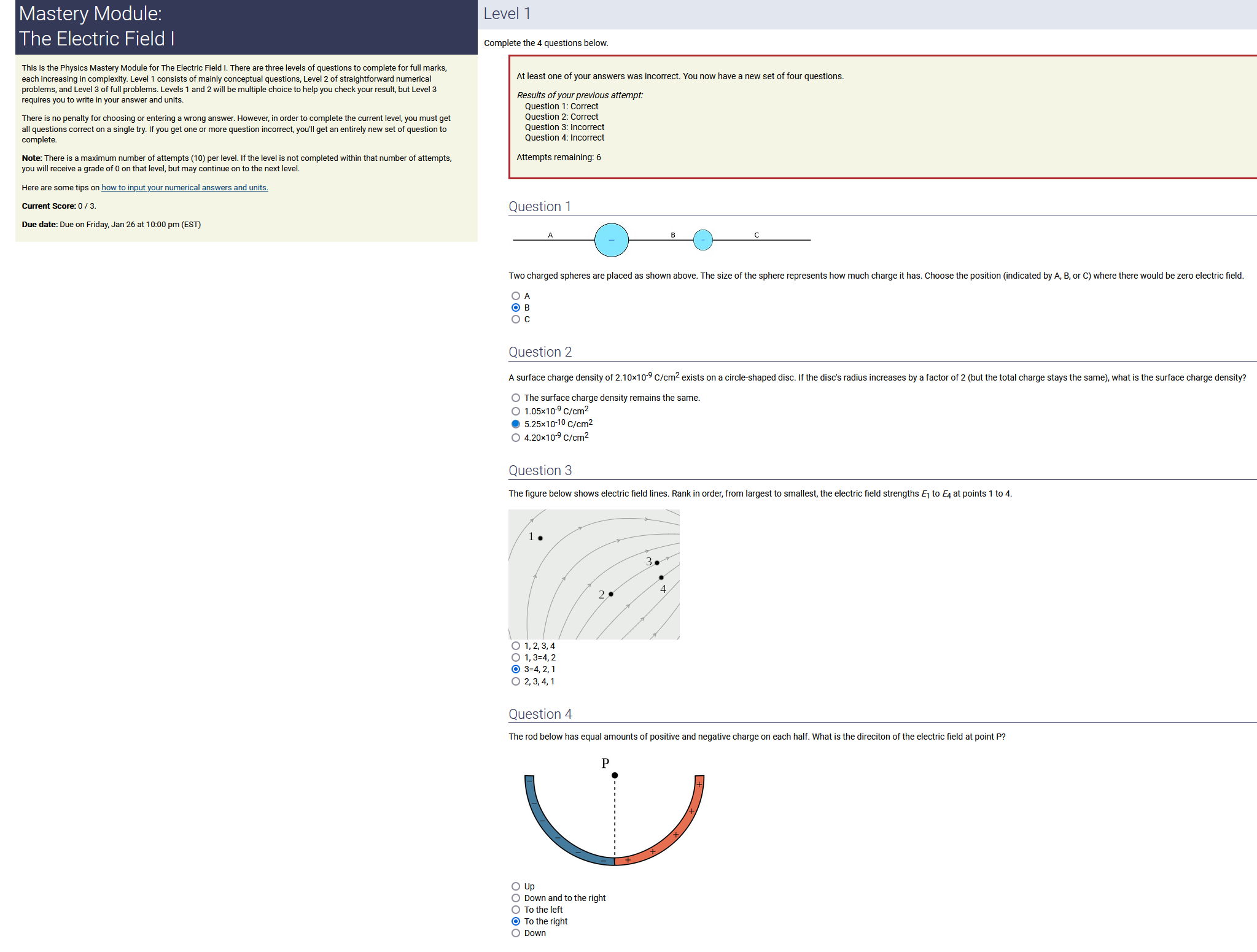 Question Transcription: The figure below shows electric field lines. Rank in order, from largest to smallest, the electric field strengths E_1 to E_4 at points 1 to 4.
