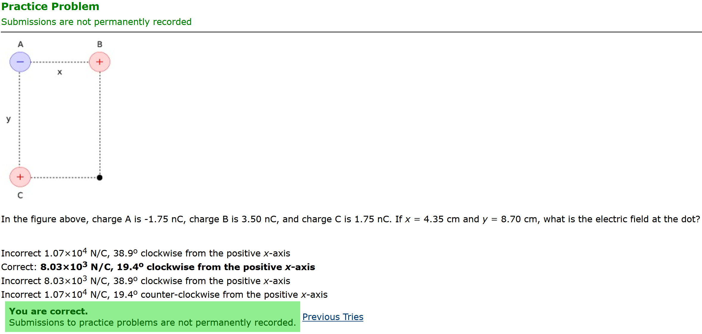 Question Transcription: In the figure above, charge A is -1.75 nC, charge B is 3.50 nC, and charge C is 1.75 nC. If x = 4.35 cm and y = 8.70 cm, what is the electric field at the dot?