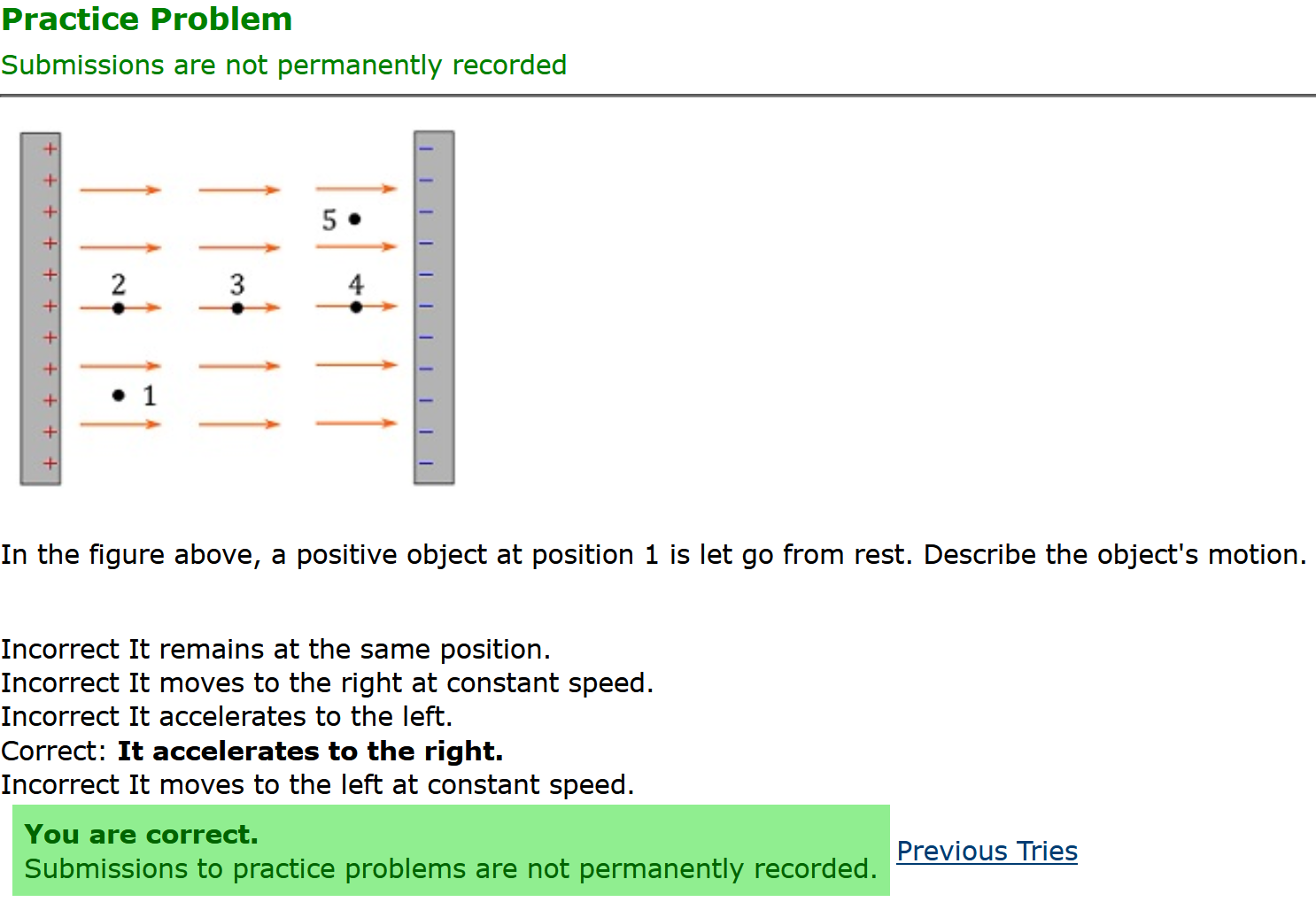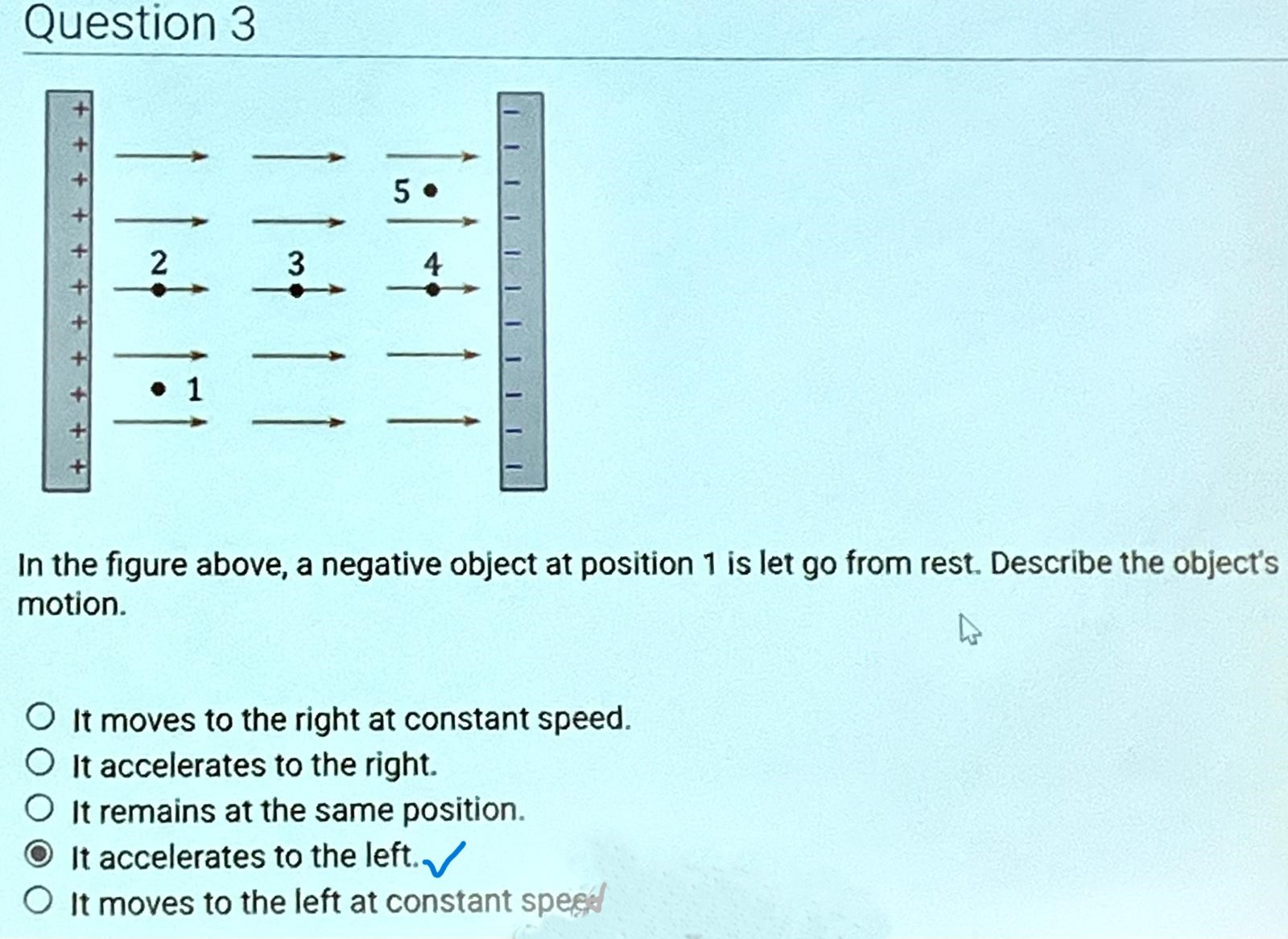 Question Transcription: In the figure above, a positive object at position 1 is let go from rest. Describe the object's motion.