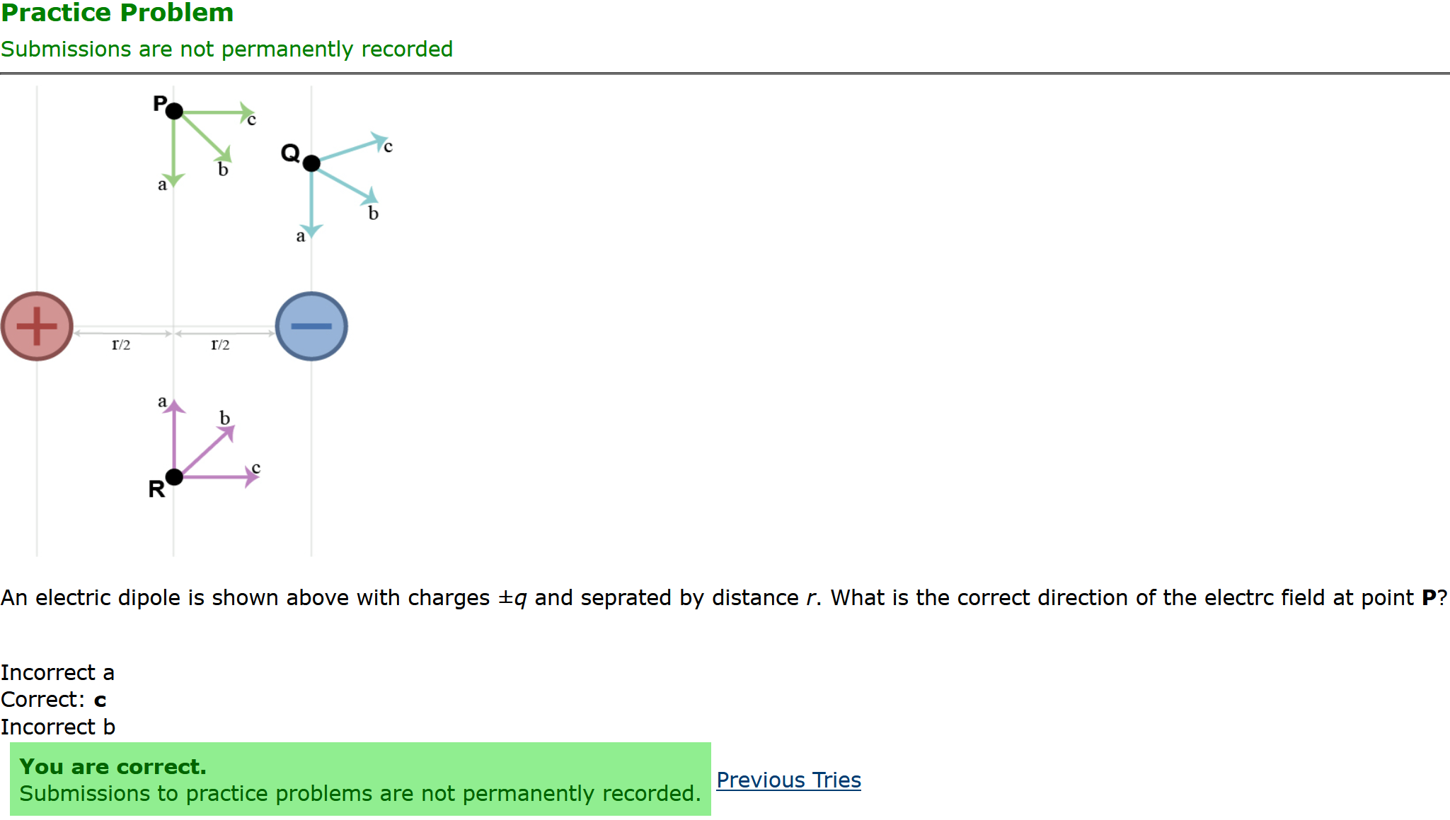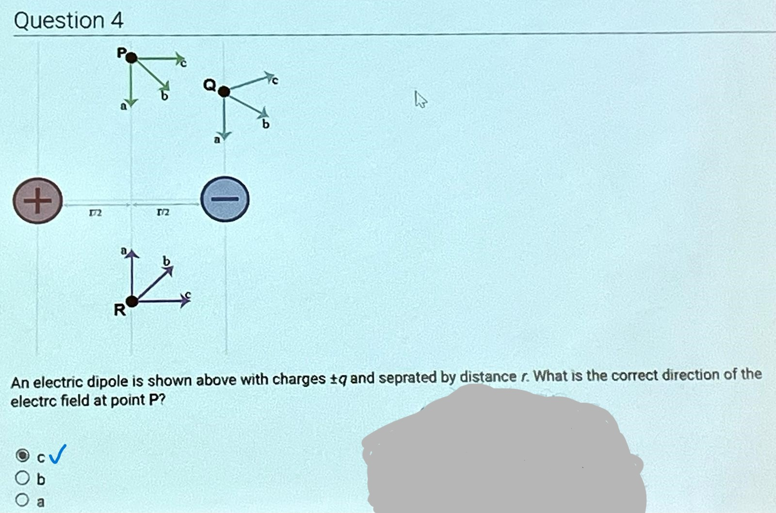 Question Transcription: An electric dipole is shown above with charges +-q and seprated by distance r. What is the correct direction of the electrc field at point Q?