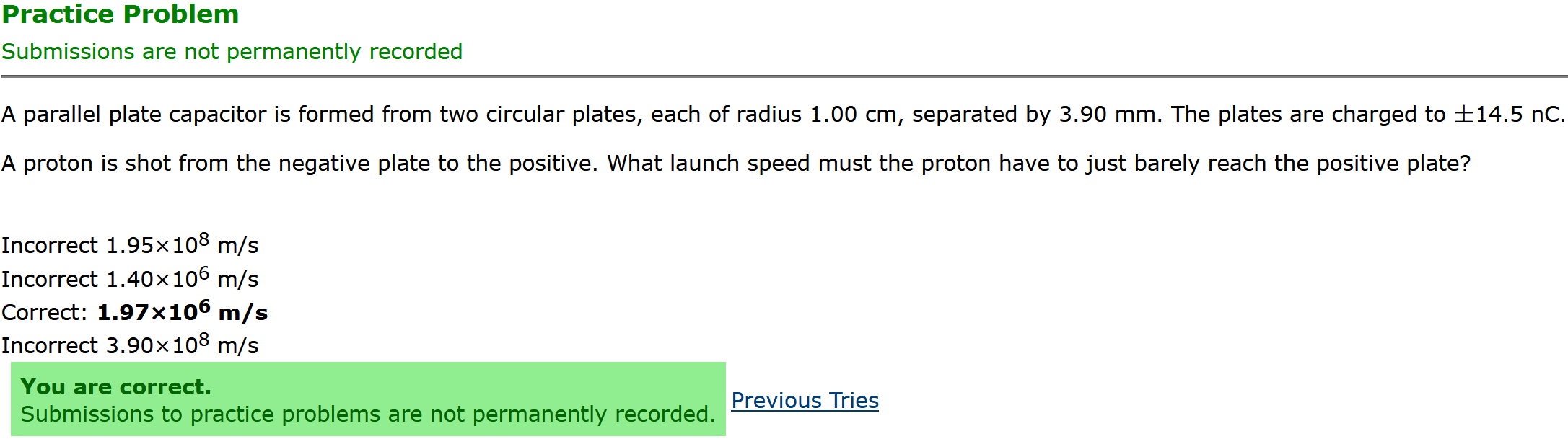 ANSWER: 1.97x10^6 m/s, the second smallest number