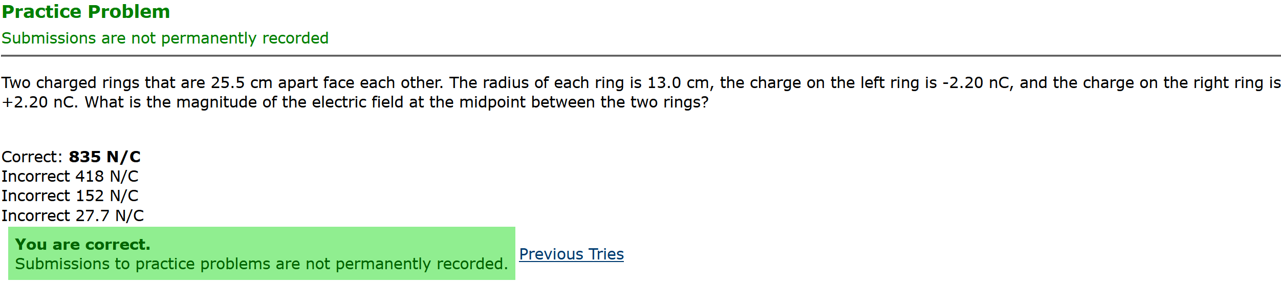 ANSWER: 835 N/C, the biggest number