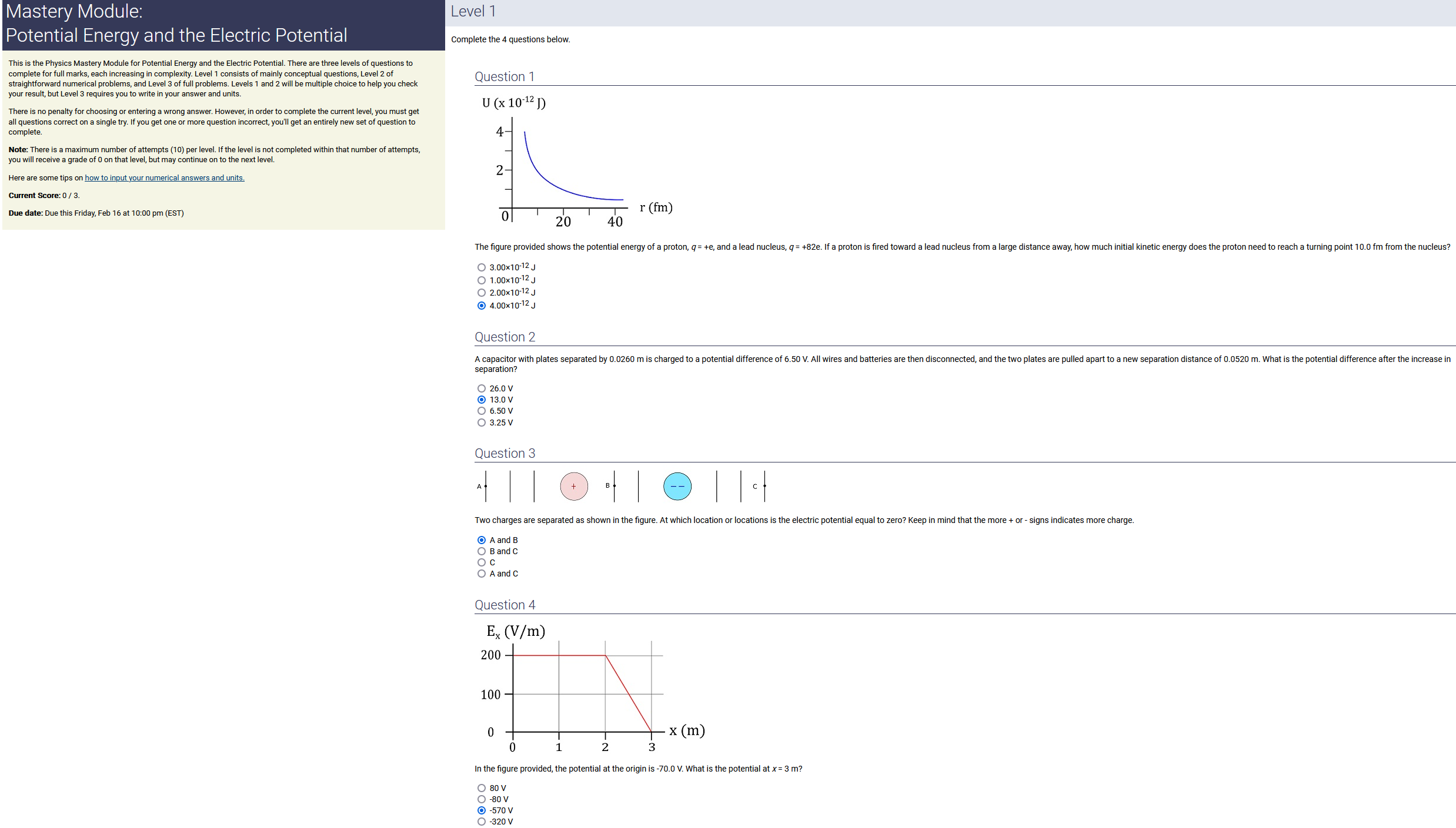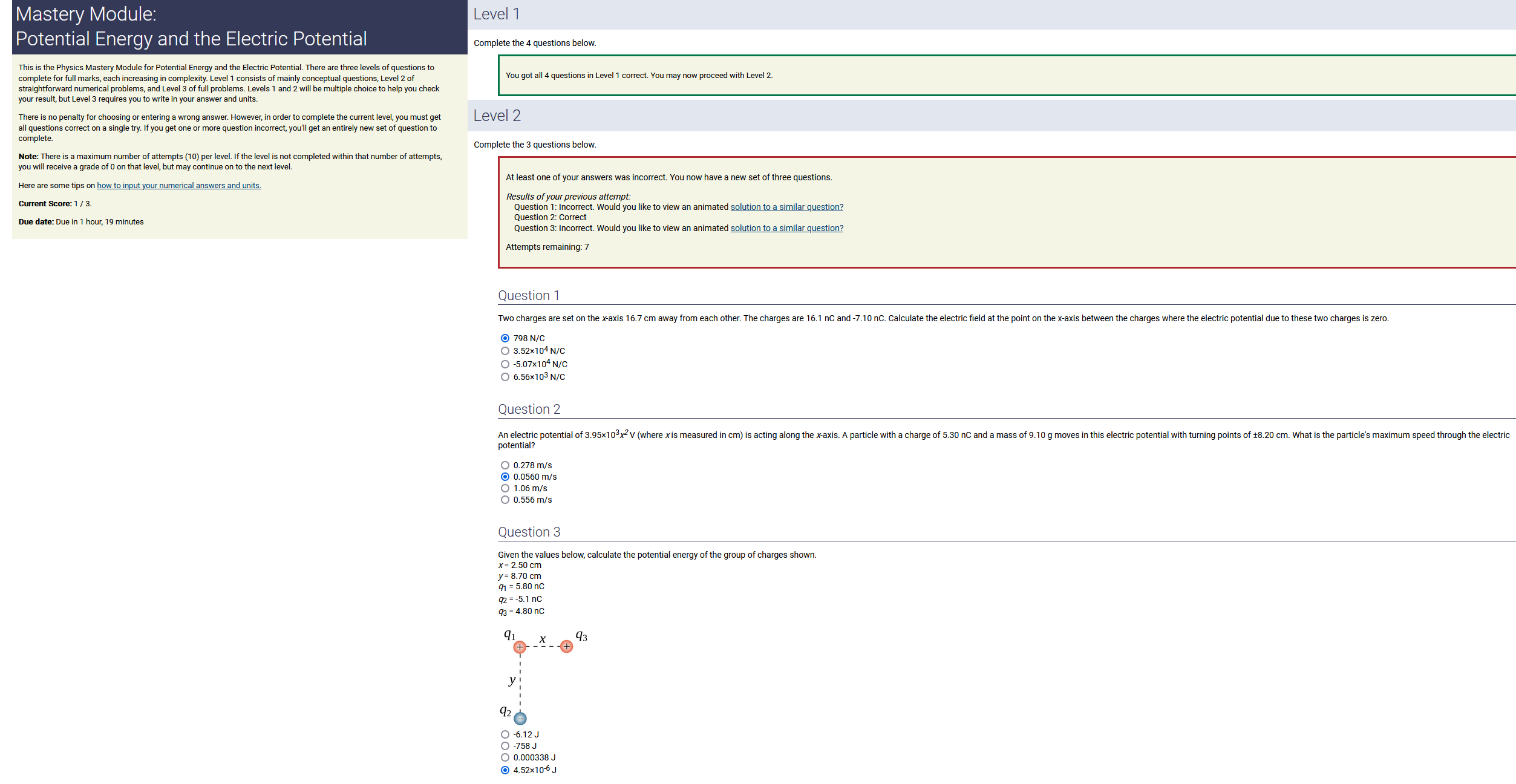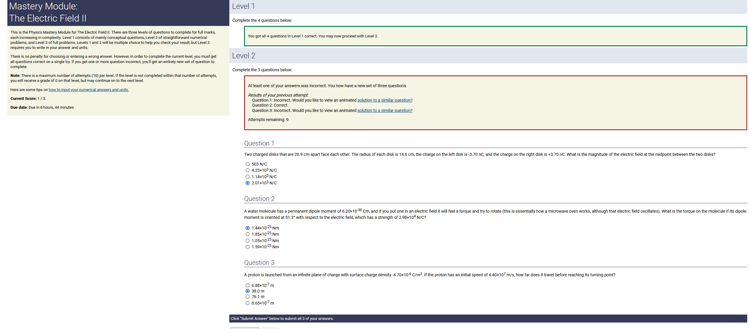 5.20 m, 3.20 nC.m, 0.140 radians: 2.33 nC (2nd-smallest number) (wrong: 16.6, 4.40, 0.448)
