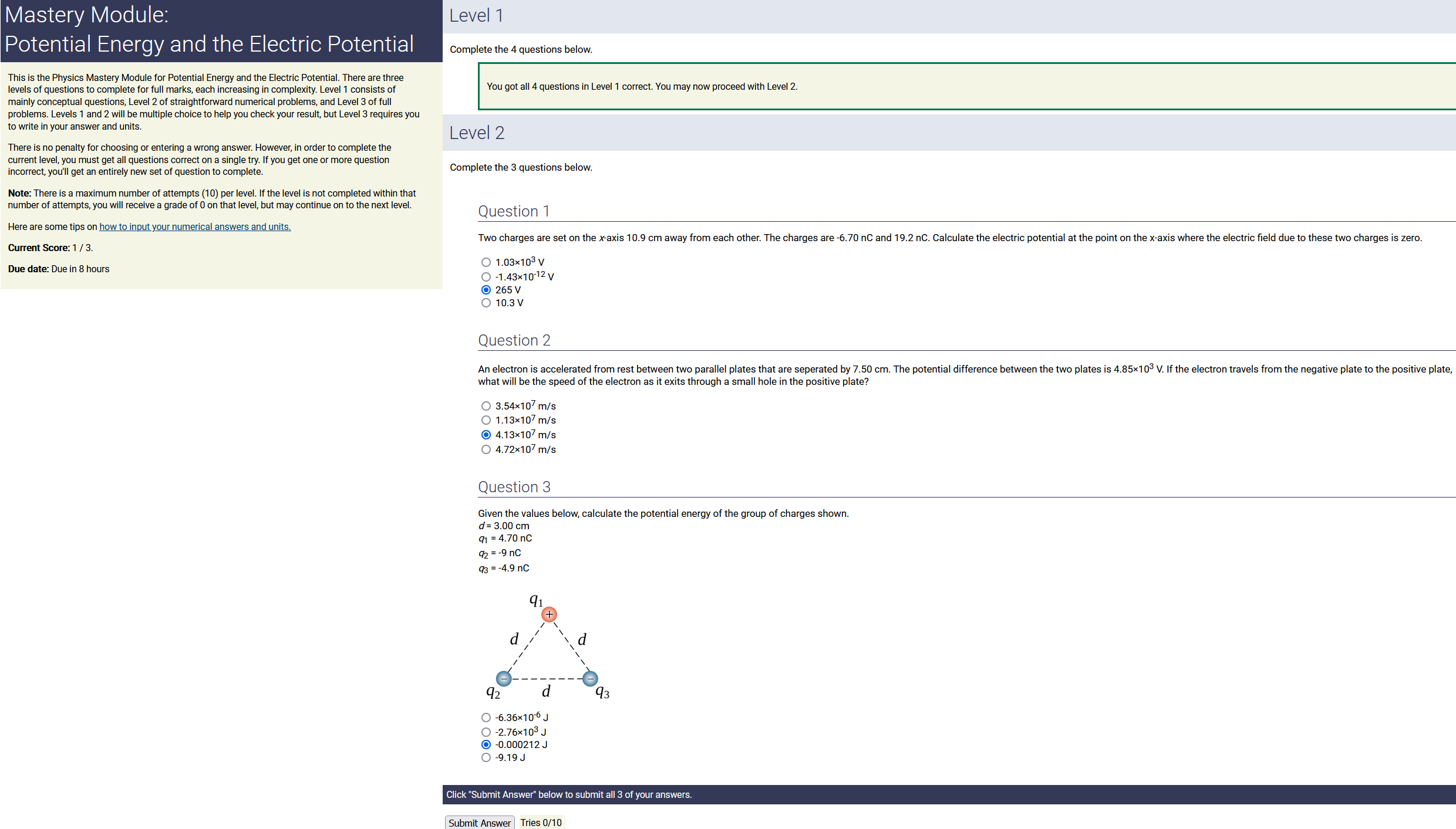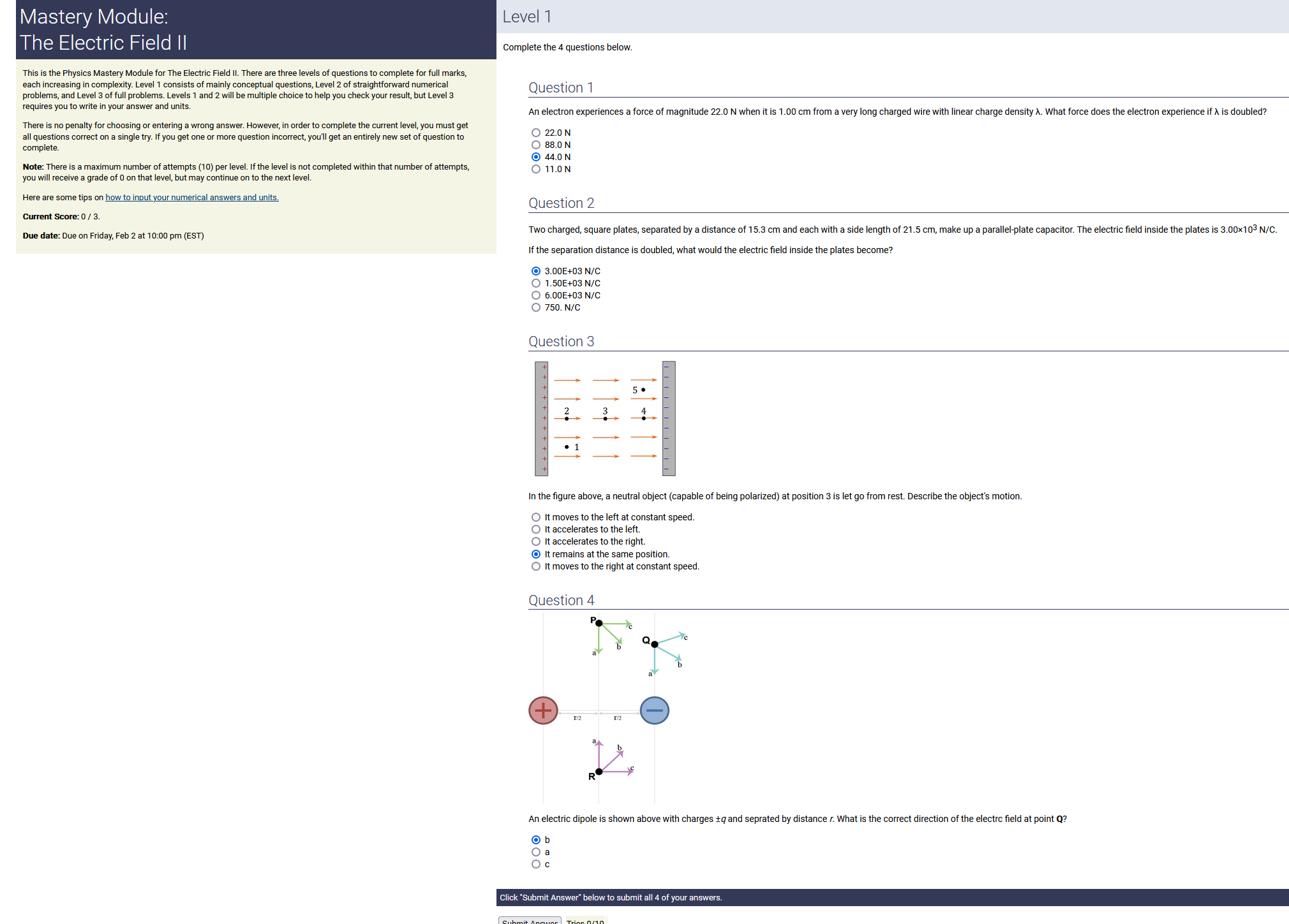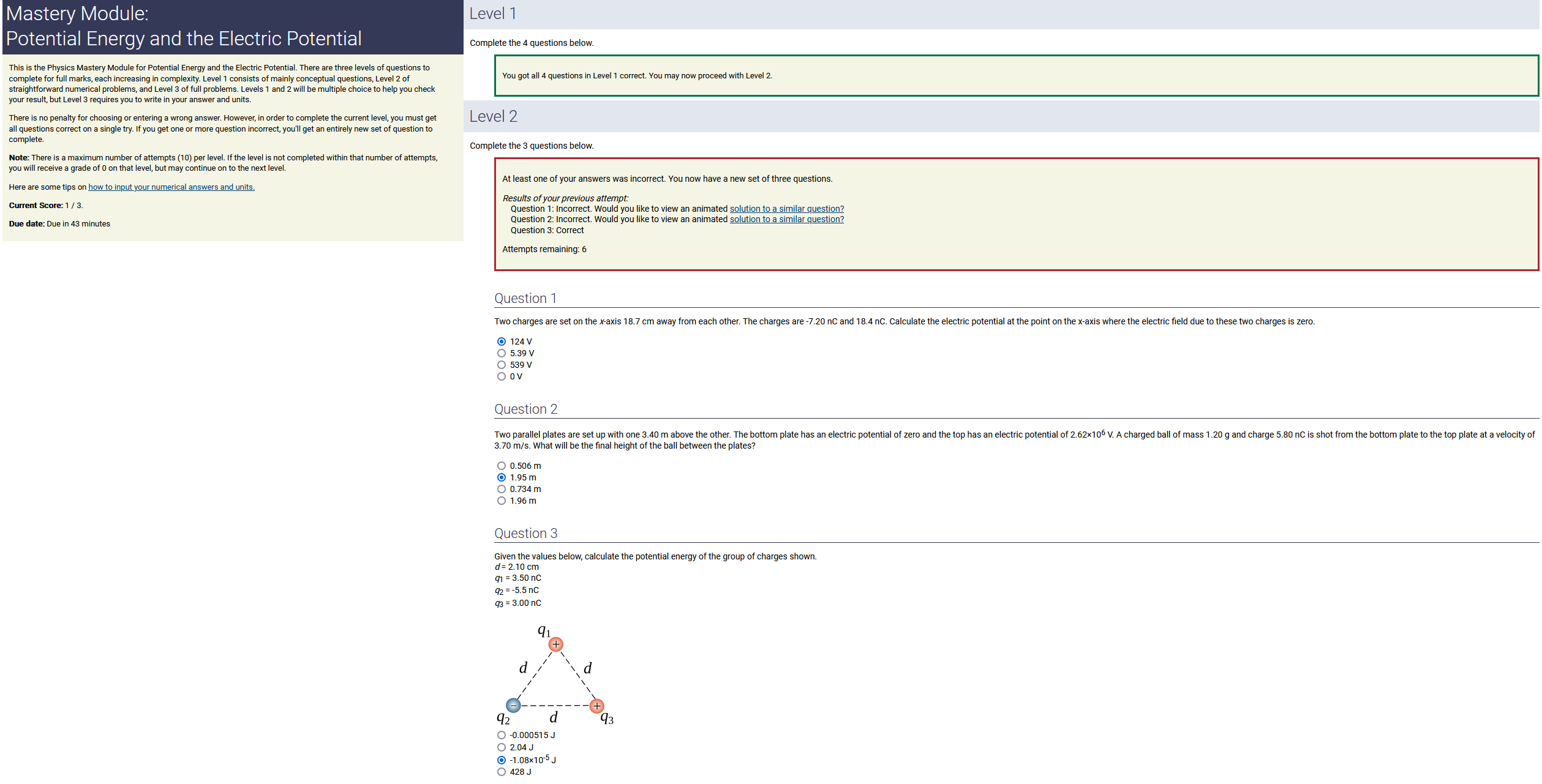 5.20 m, 3.20 nC.m, 0.140 radians: 2.33 nC (2nd-smallest number) (wrong: 16.6, 4.40, 0.448)