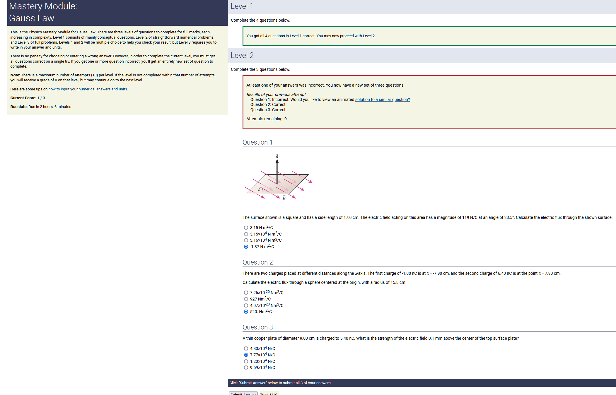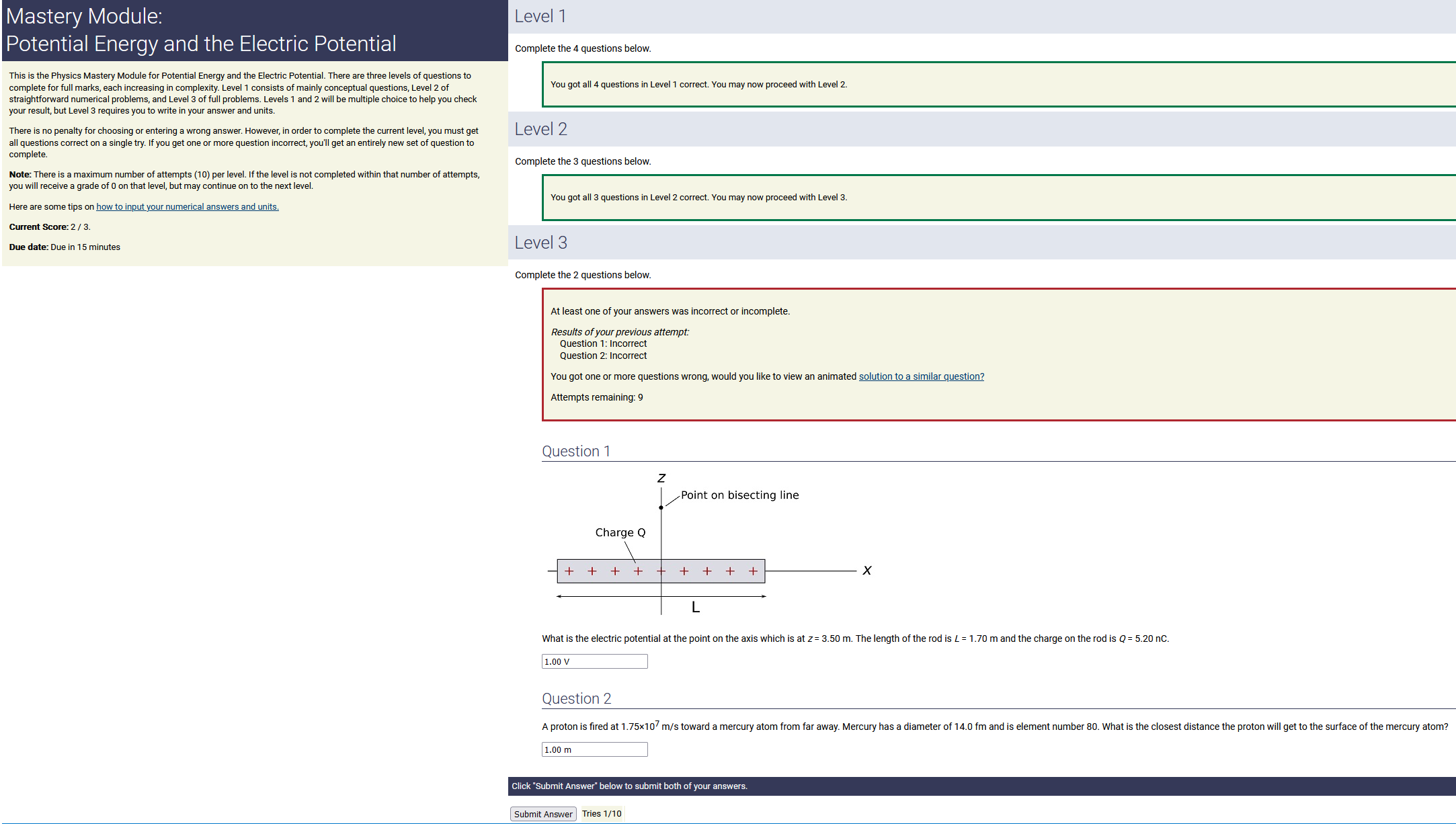 2.50 m, 9.70 nC/m, 0.120 radians: 2.91 nC (2nd-smallest number) (wrong: 32.3, 24.2, 1.16)