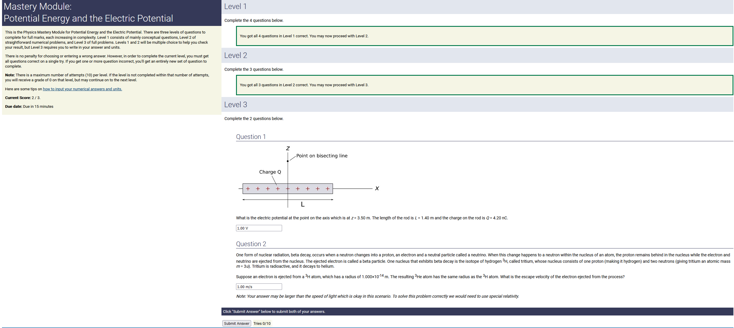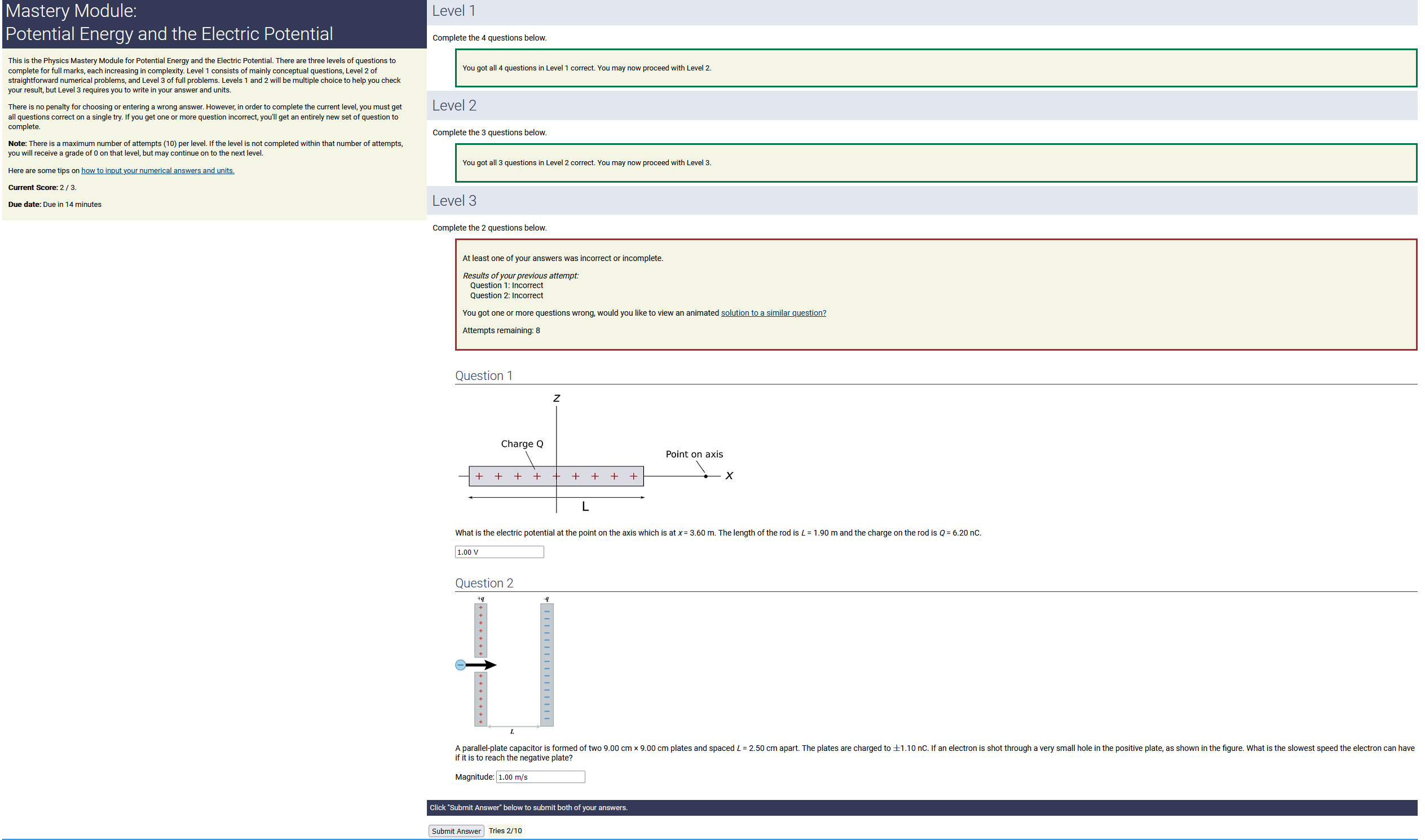 3.20 m, 8.80 nC/m, 0.160 radians: 4.51 nC (2nd-smallest number) (wrong: 28.2, 17.2, 1.41)