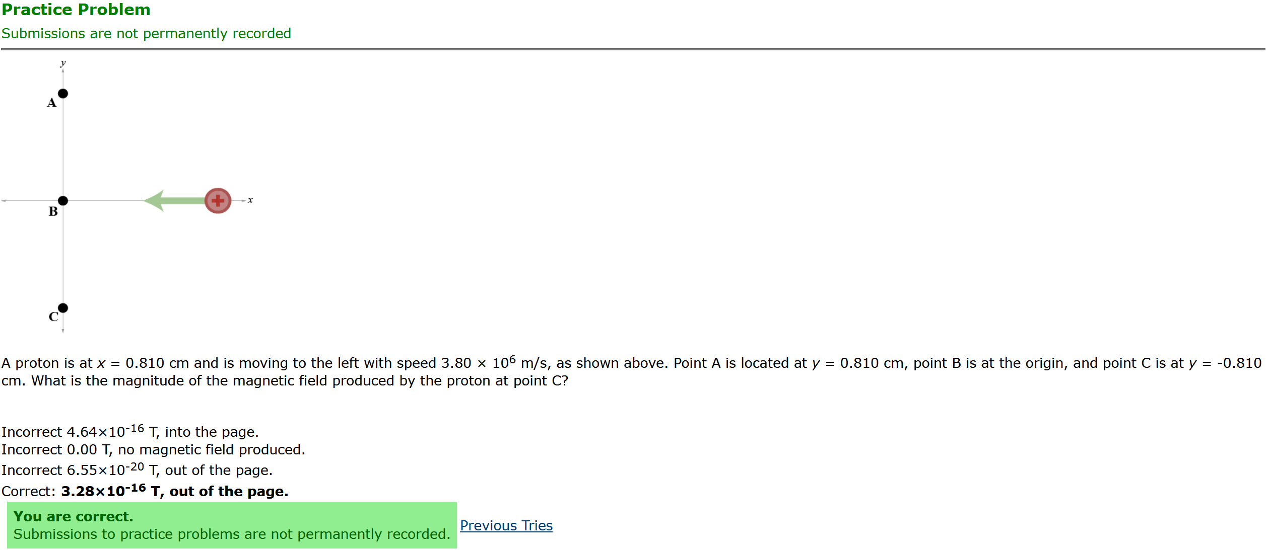 Question Transcription: A proton is at x = 0.810 cm and is moving to the left with speed 3.80 x 10^6 m/s, as shown above. Point A is located at y = 0.810 cm, point B is at the origin, and point C is at y = -0.810 cm. What is the magnitude of the magnetic field produced by the proton at point C?