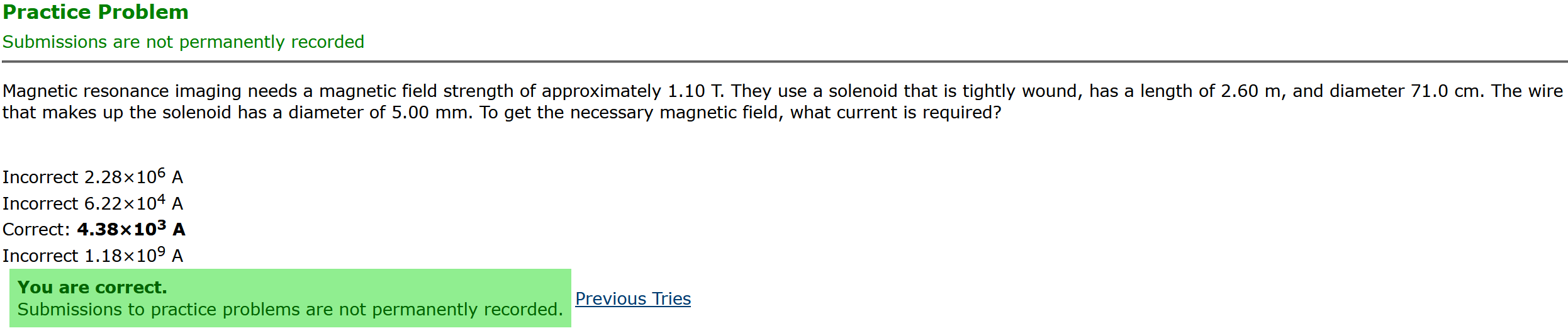 Question Transcription: Magnetic resonance imaging needs a magnetic field strength of approximately 1.10 T. They use a solenoid that is tightly wound, has a length of 2.60 m, and diameter 71.0 cm. The wire that makes up the solenoid has a diameter of 5.00 mm. To get the necessary magnetic field, what current is required?