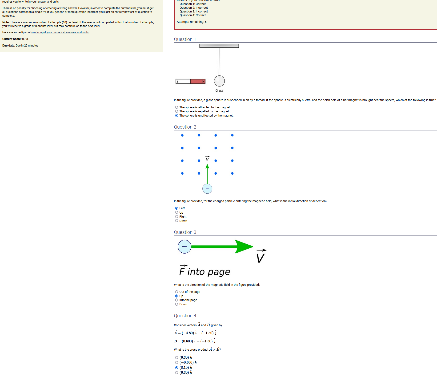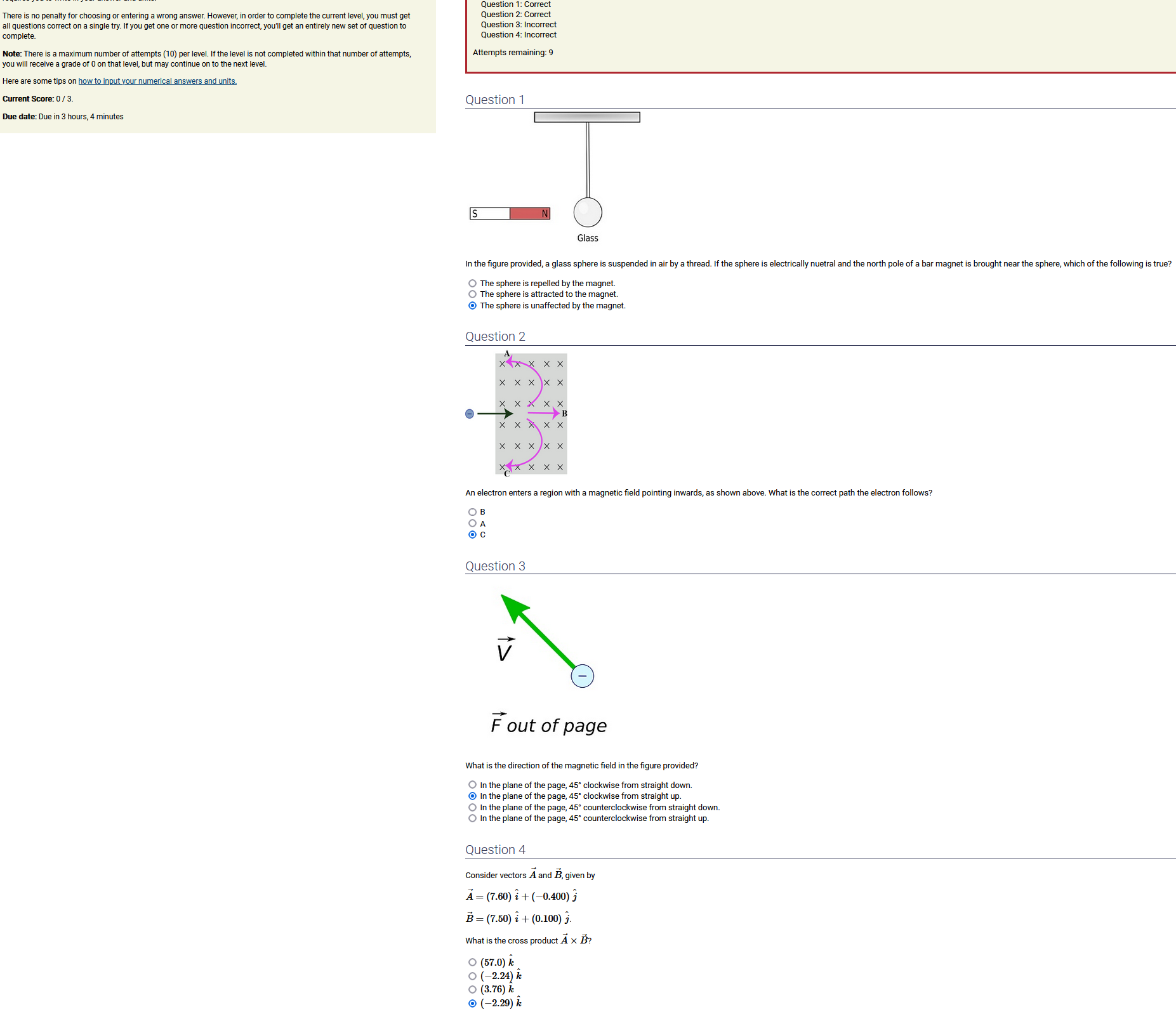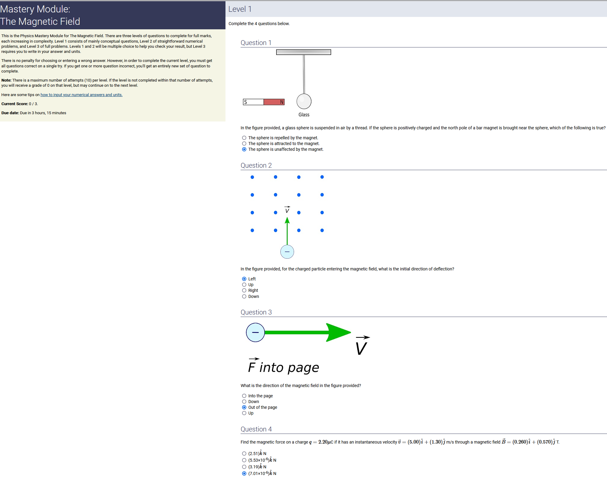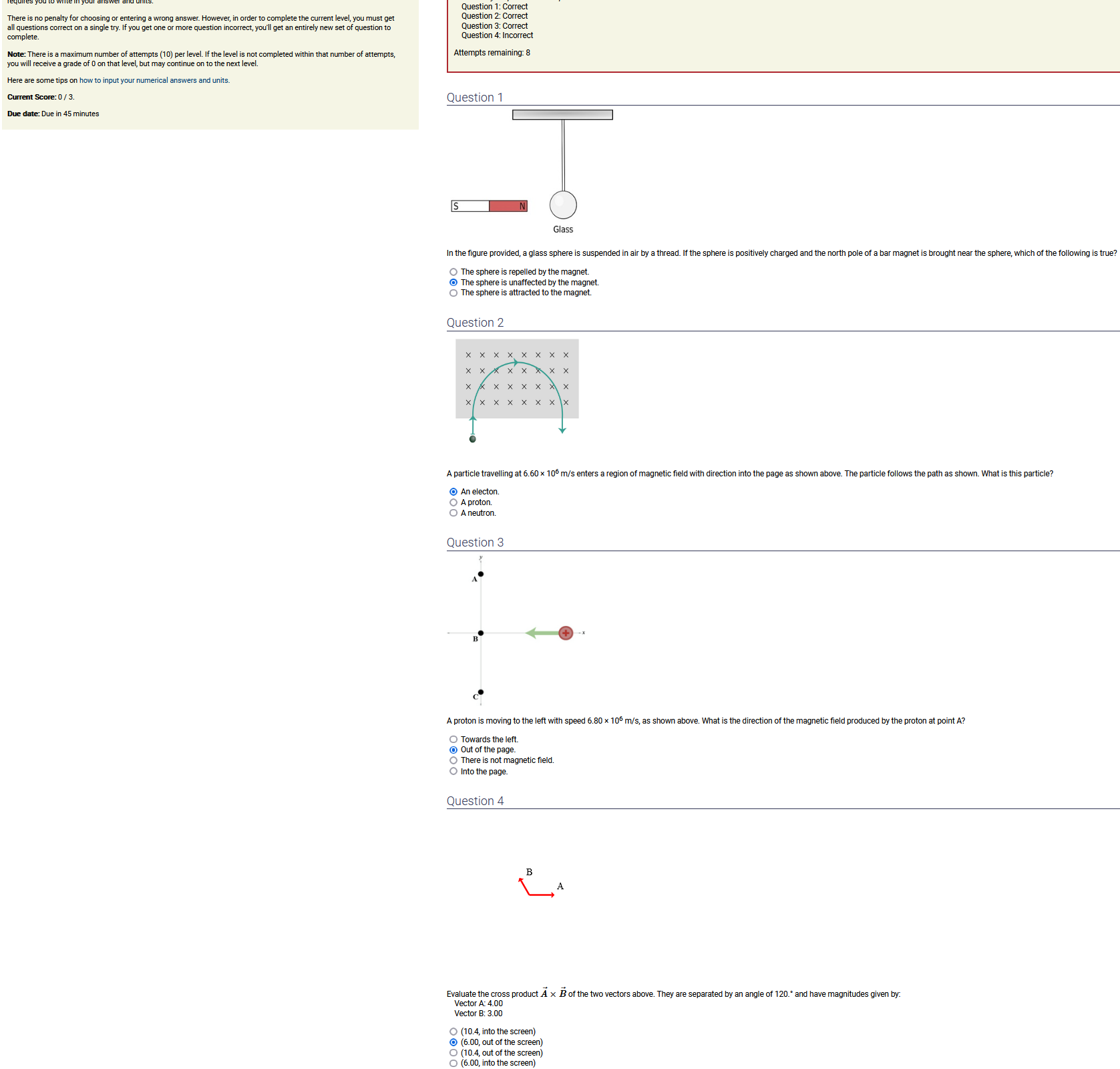 ANSWER: 3.28x10^-16 T, out of the page. , the 2nd-biggest number [of the *three* non-zero options] & always out of the page