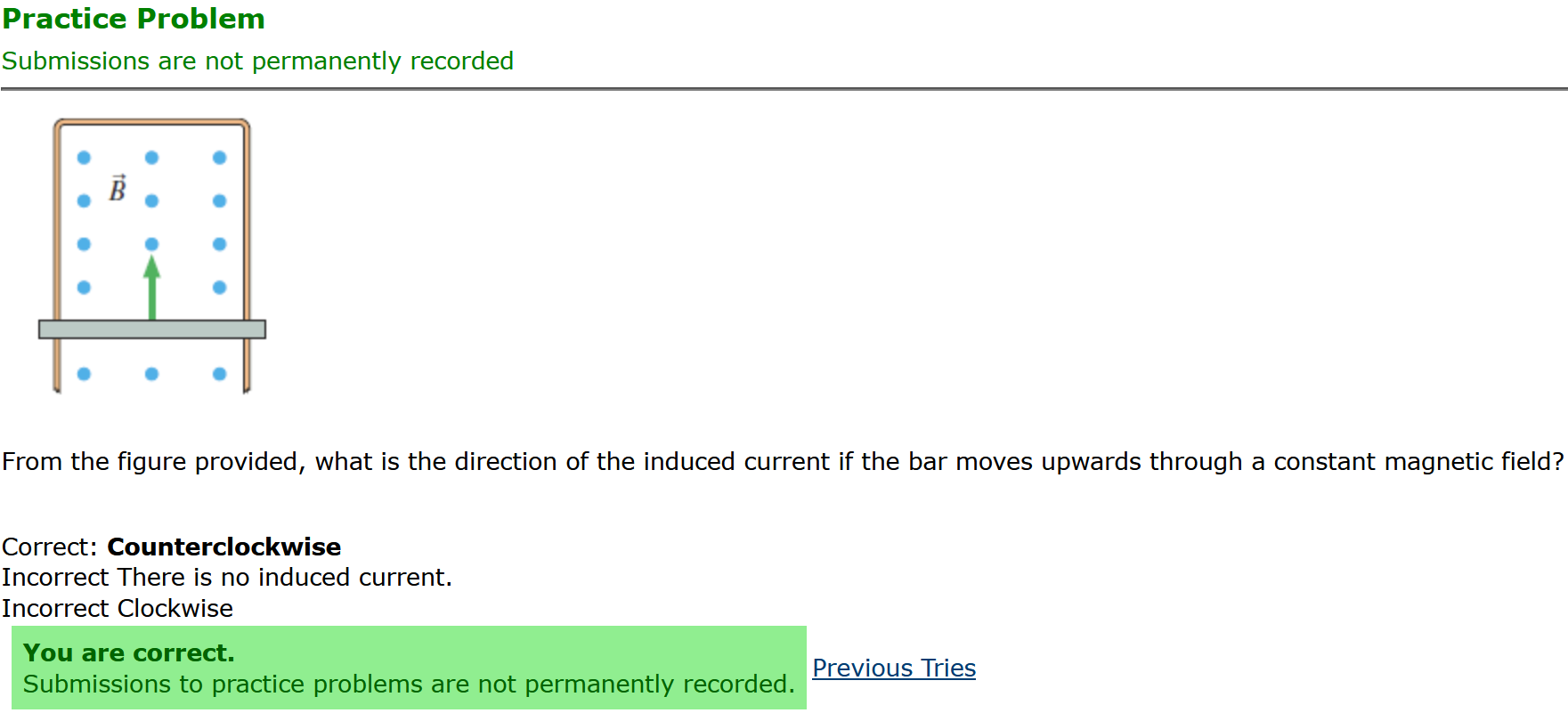 Question Transcription: From the figure provided, what is the direction of the induced current if the bar moves upwards through a constant magnetic field?