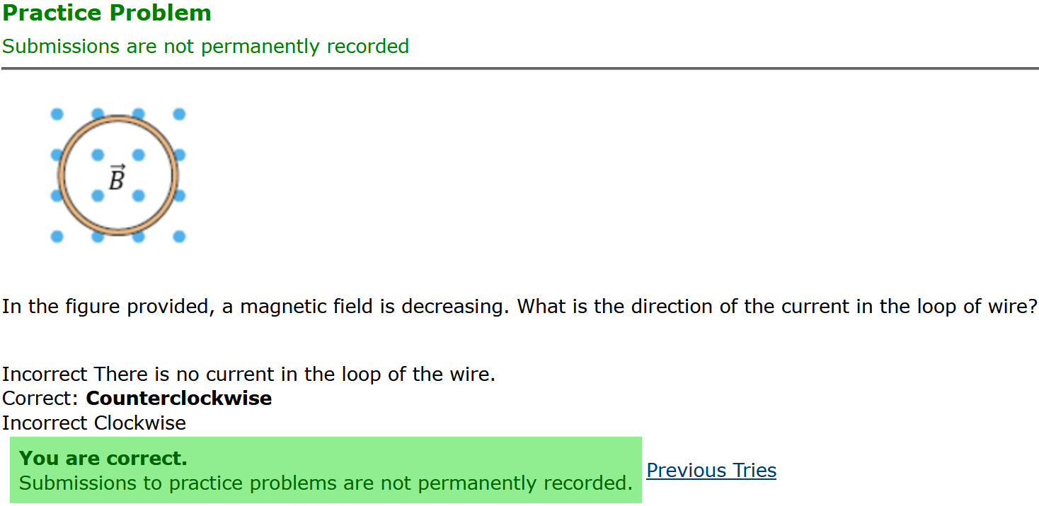 Question Transcription: In the figure provided, a magnetic field is decreasing. What is the direction of the current in the loop of wire?
