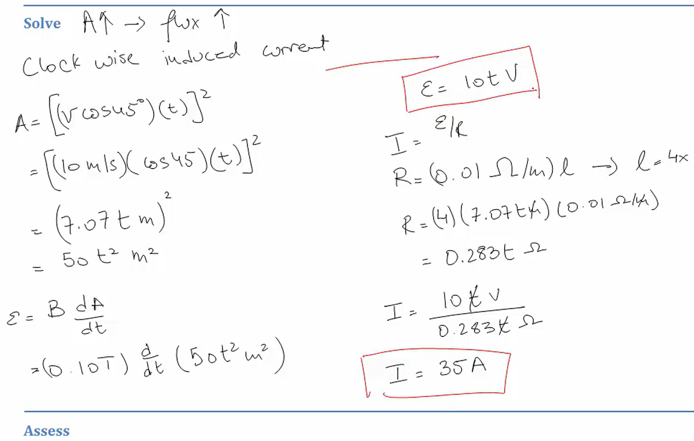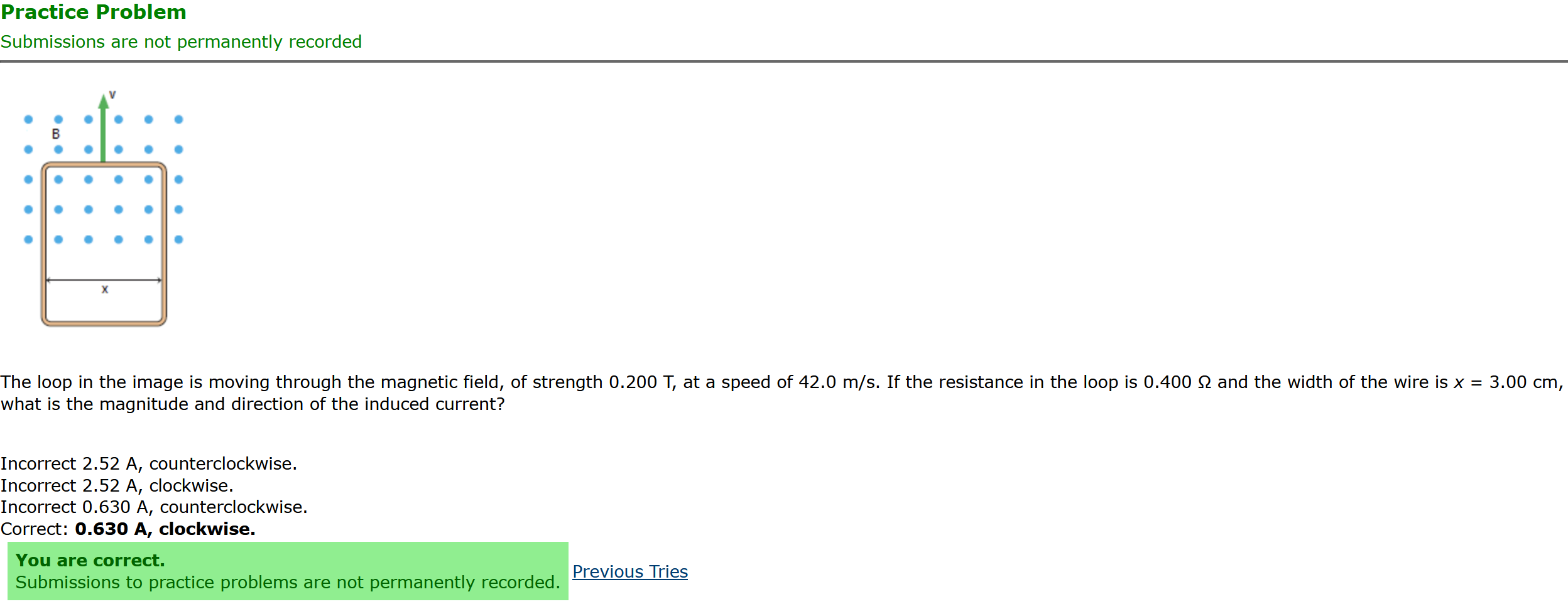 Question Transcription: The loop in the image is moving through the magnetic field, of strength 0.200 T, at a speed of 42.0 m/s. If the resistance in the loop is 0.400 ohms and the width of the wire is x = 3.00 cm, what is the magnitude and direction of the induced current?