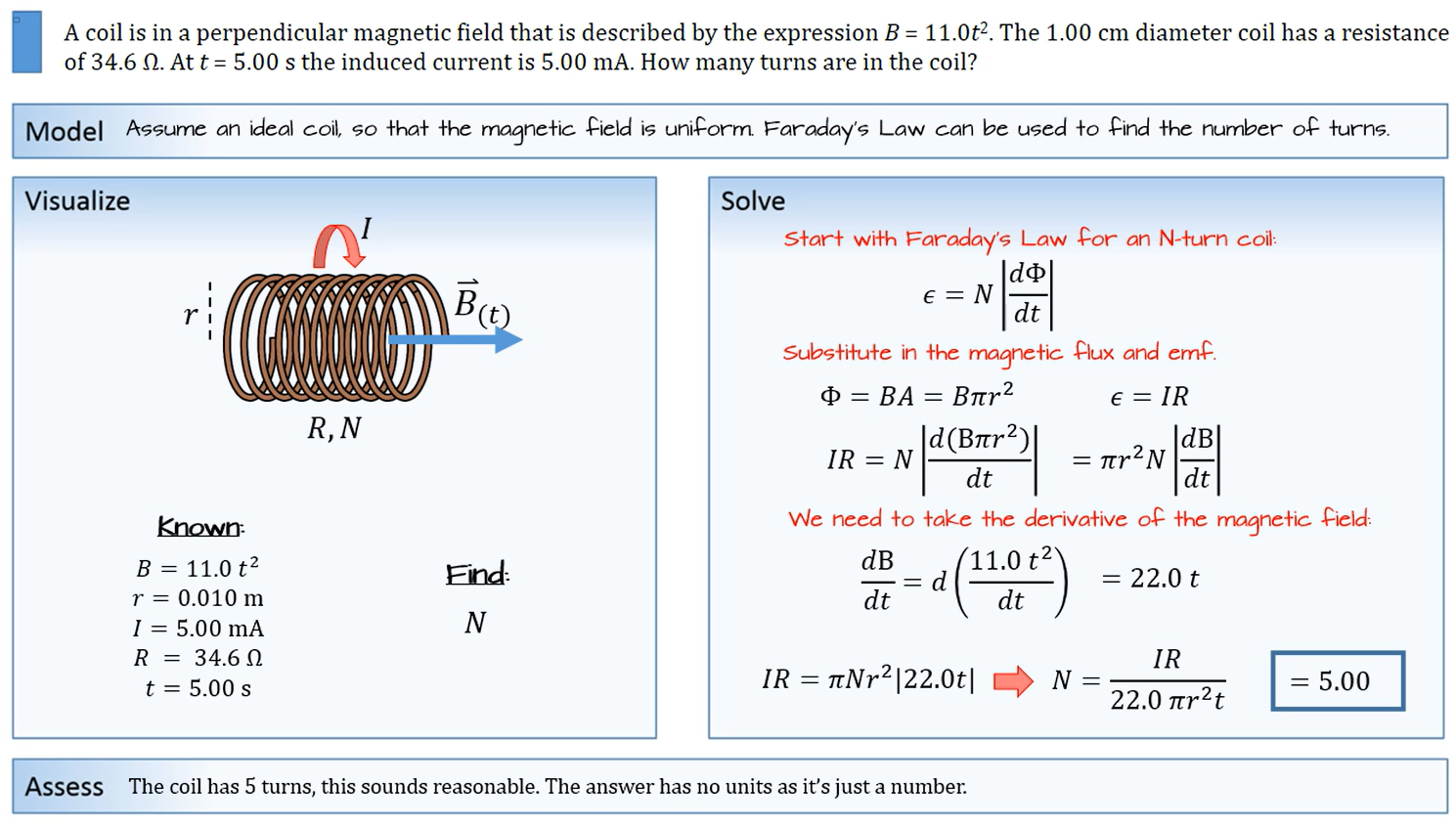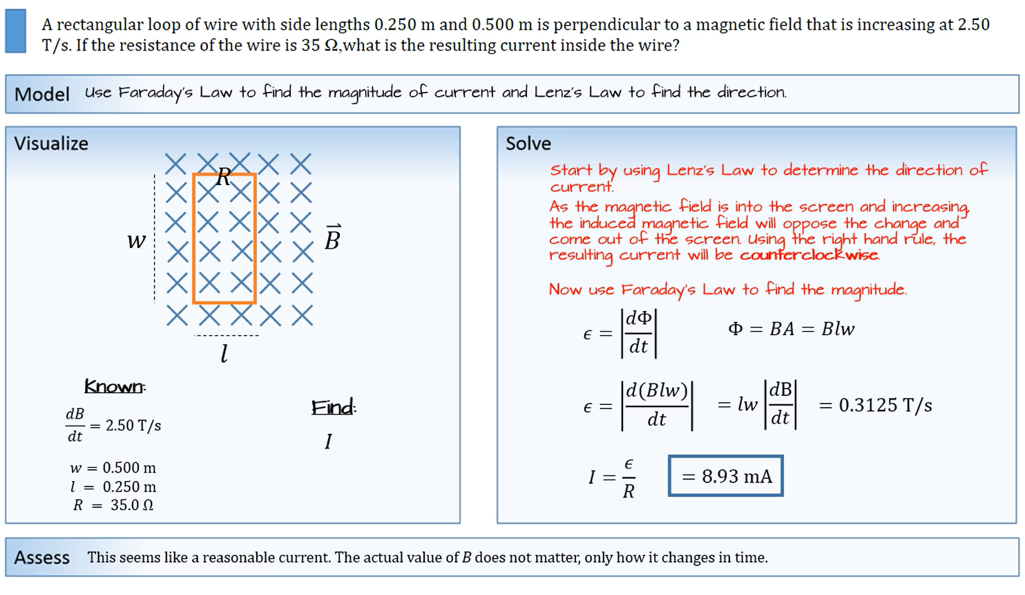 Question Transcription: A 5.00 diameter loop with a resistance of 0.500 ohms is in an increasing magnetic field of 1.90 T/s as shown in the image. What is the magnitude and direction of the induced current?